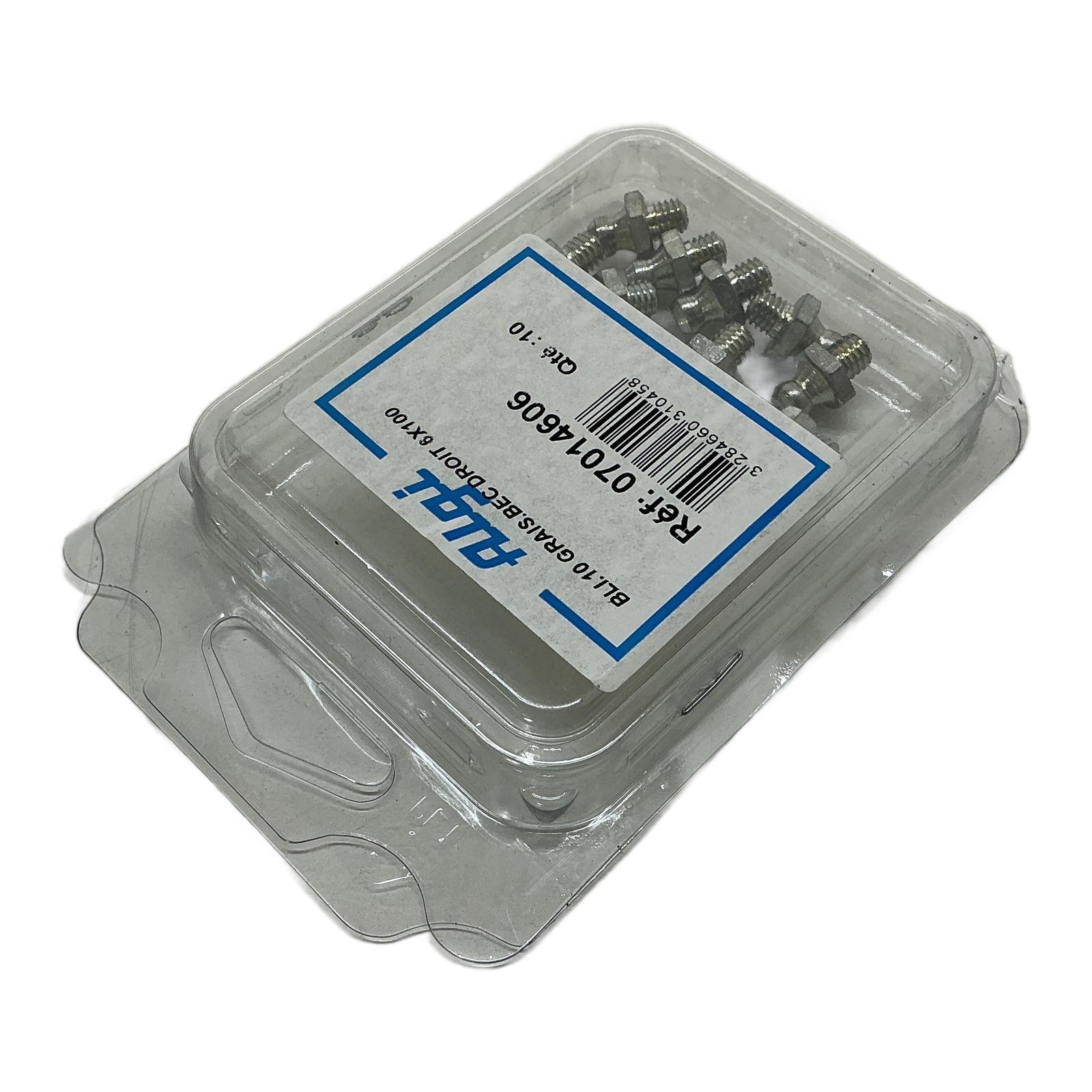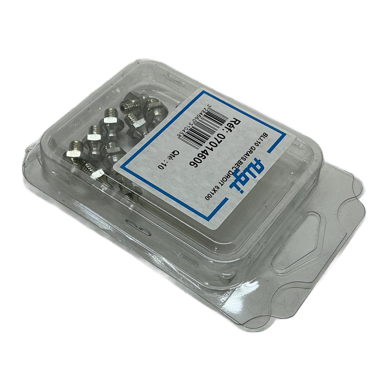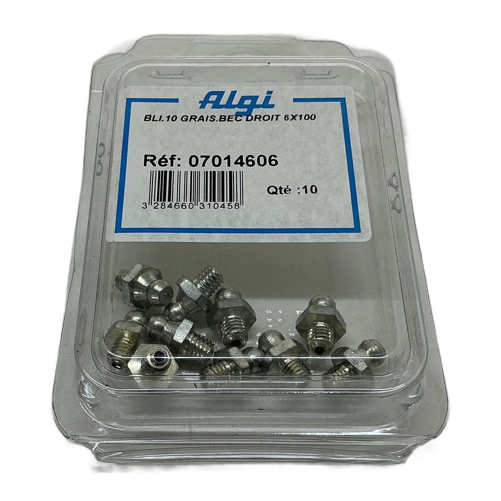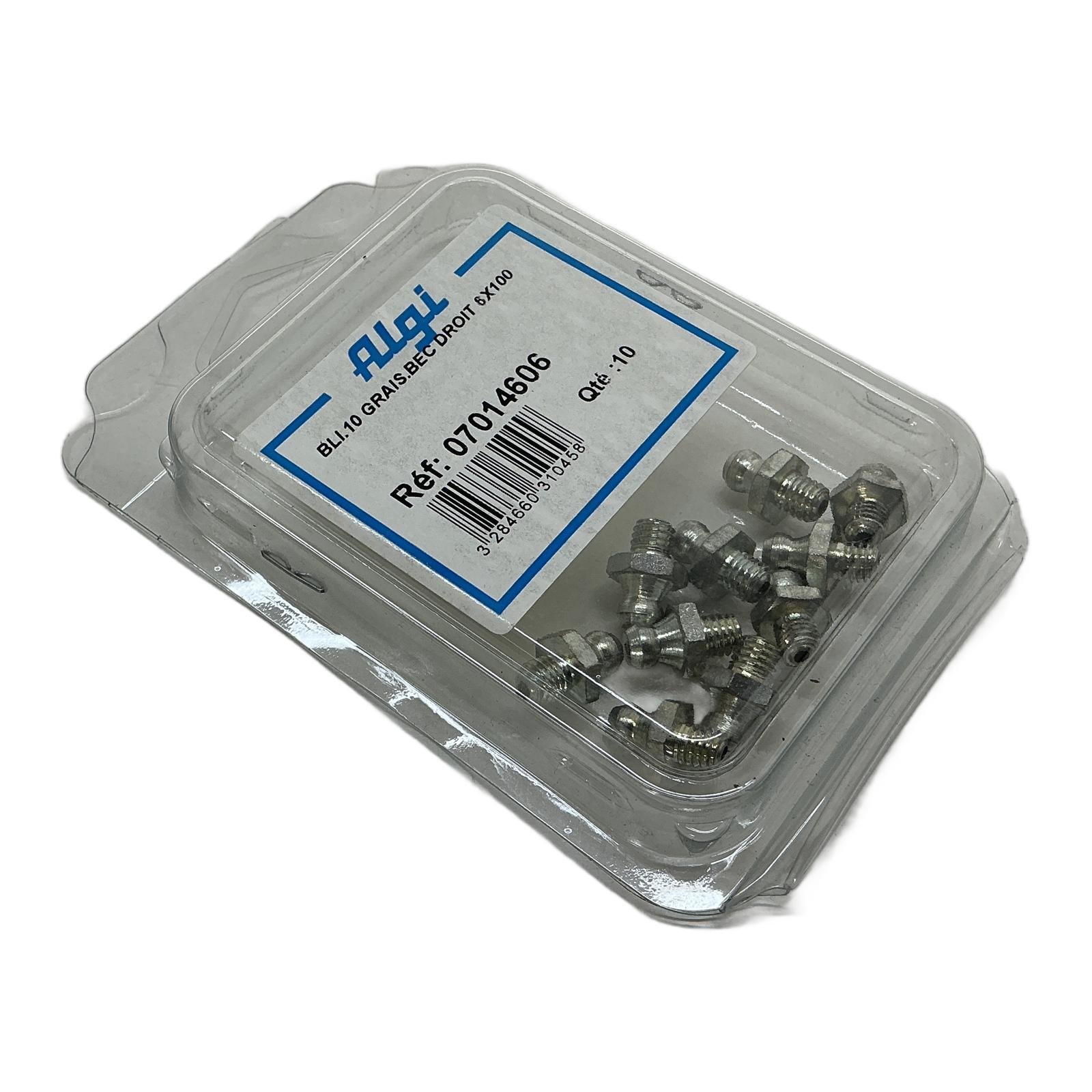 Algi Straight Grease Nipple M6x1.00 (Pack of 10) Description This is a blister pack containing ten straight grease nipples from Algi, model 07014606. These high-quality fittings are essential for creating reliable lubrication points in a variety of mechanical systems. They are manufactured from durable steel to withstand the rigors of industrial environments and ensure a secure connection for grease guns. Specifications Brand: Algi Product Type: Straight Grease Nipple Reference Number: 07014606 Thread Size: M6 x 1.00 mm Material: Steel Quantity: 10 pieces Label Info Model: BLI.10 GRAIS.BEC DROIT 6X100 Reference (Ref): 07014606 Quantity (Qte): 10 EAN: 3284660310458 Application These grease nipples are universally applicable for maintenance and repair tasks on industrial machinery, agricultural equipment, automotive components, and any other mechanical assembly requiring periodic lubrication. Country of Origin France CO2 Impact By purchasing this reconditioned set of grease nipples, you are contributing to a circular economy. The reuse of this item has saved an estimated 0.08 kg of CO2 compared to the production of a new one. This saving is equivalent to charging a smartphone almost 10 times. Availability This pack of 10 grease nipples is in stock and ready for immediate dispatch. Order now from profideals for expert support and fast delivery. FAQ What is the material and plating of these grease nipples?These Algi grease nipples are typically made from high-grade steel and are zinc-plated for excellent corrosion resistance in demanding industrial environments. Do these nipples conform to a specific DIN or ISO standard?Yes, straight grease nipples with an M6x1.00 thread typically conform to the DIN 71412 standard, type A, ensuring interchangeability with other standard fittings and grease gun couplers. What is the recommended installation torque for an M6x1.00 steel grease nipple?For a steel M6 grease nipple, the recommended installation torque is generally between 3 to 5 Newton-meters (Nm). Over-tightening can damage the threads, while under-tightening can lead to leaks. Last Update: Friday, March 13, 2026 profideals is not an authorized distributor, reseller or representative of the products featured on this website. All product names, trademarks, brands and logos used on this site are the property of their respective owners. The depiction, description or sale of products featuring these names, trademarks, brands and logos is for identification purposes only and is not intended to indicate any affiliation with or authorization by any rights holder.