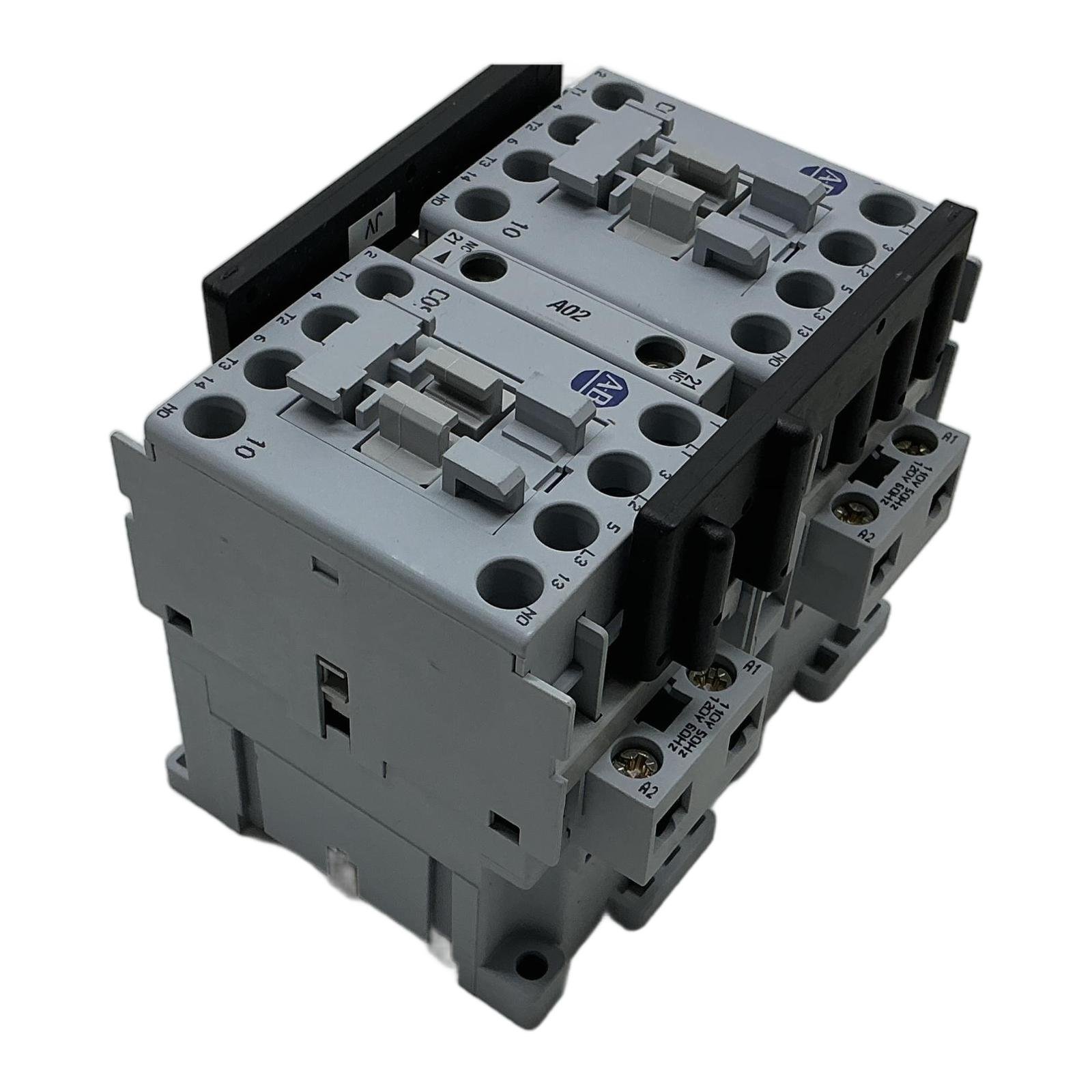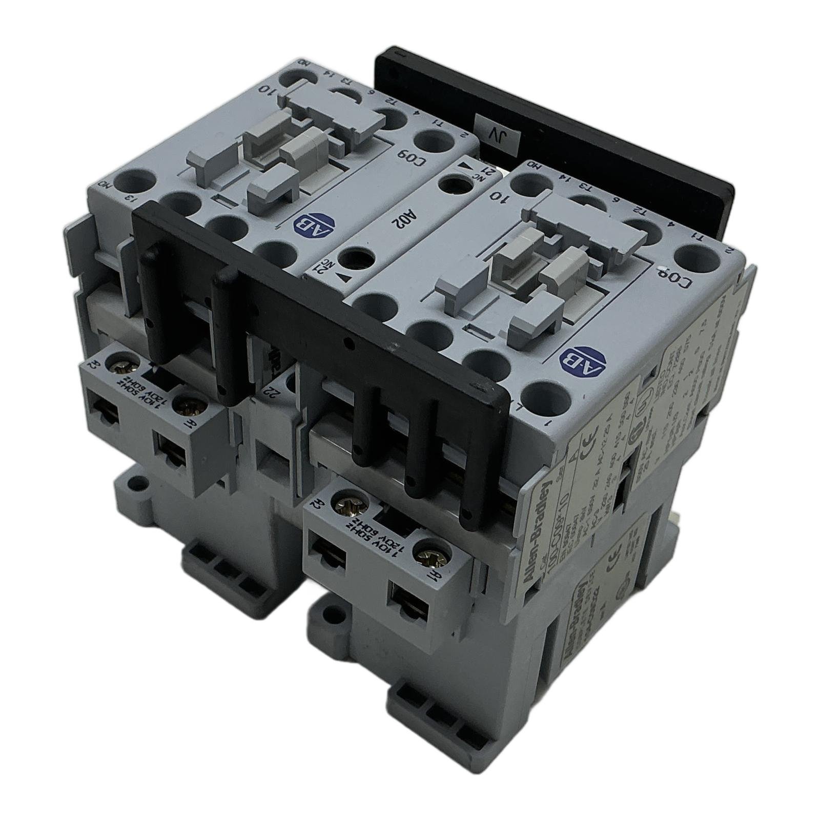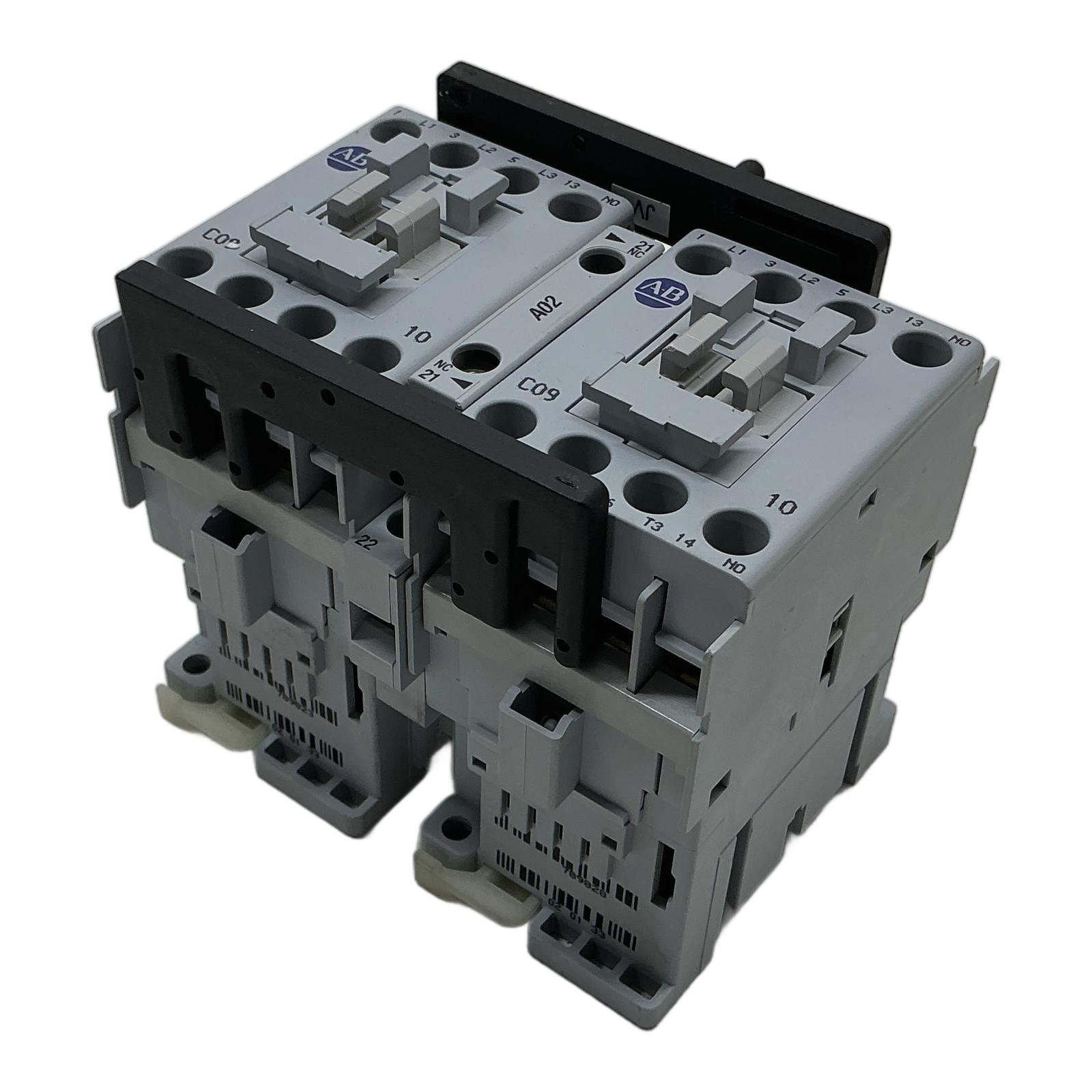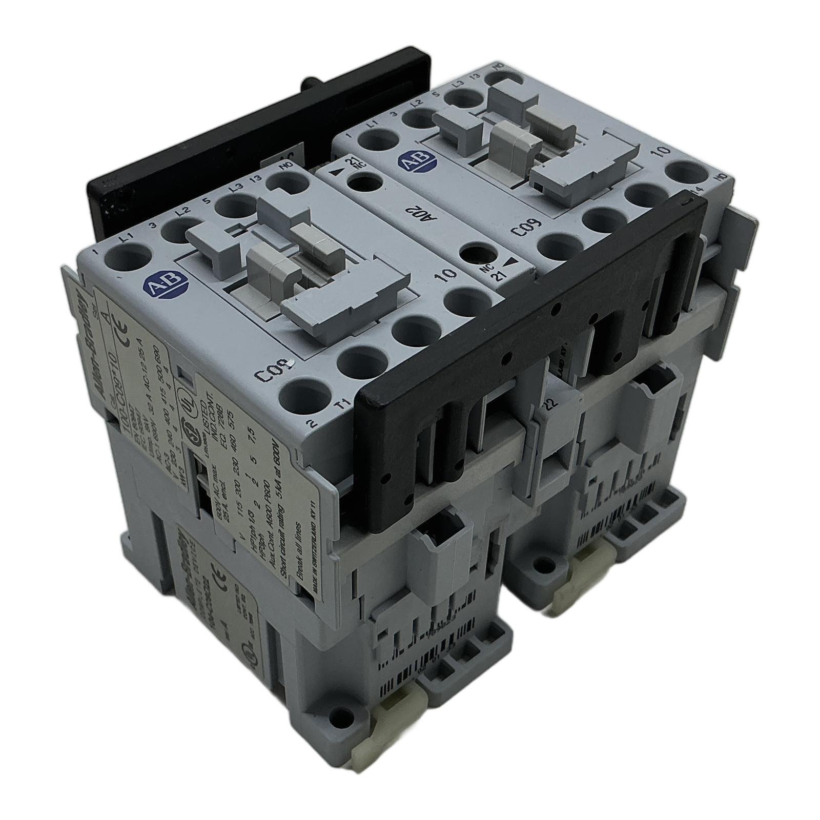 Allen-Bradley 104-C09D22 Reversing Contactor Description The Allen-Bradley 104-C09D22 is a pre-assembled reversing contactor from the Bulletin 104-C series. It provides a compact and reliable solution for starting, stopping, and reversing three-phase AC motors. This unit consists of two 100-C09 contactors that are mechanically and electrically interlocked for safety. It is designed for high performance in industrial environments. Specifications Manufacturer: Allen-Bradley Catalog Number: 104-C09D22 AC-3 Utilization Category (Motor Load): 9A AC-1 Utilization Category (Resistive Load): 32A Coil Voltage: 110V 50Hz / 120V 60Hz AC Main Poles: 3-Pole (per contactor) Auxiliary Contacts: 2 Normally Open (N.O.), 2 Normally Closed (N.C.) total Power Rating (400V): 4 kW Series: Bulletin 104-C Label Info Complete Device: 104-C09D22 Individual Contactor: 100-C09*10 Standards: EN 60947, IEC 60947, UL, CSA Short Circuit Rating: 5kA at 600V Application This reversing contactor is ideal for applications such as conveyors, hoists, machine tools, and other industrial machinery where changing the direction of motor rotation is required. Country of Origin Made in Switzerland. CO2 Impact Opting for a reconditioned 104-C09D22 instead of a new one prevents the emission of approximately 30 kg of CO2. This saving is comparable to driving a car for 150 kilometers. Availability This item is in stock and ready for immediate dispatch. Order now from profideals for expert support and fast delivery. FAQ What is the purpose of the mechanical interlock on the 104-C09D22? The mechanical interlock is a critical safety feature. It physically prevents both contactors from closing their main poles at the same time. This is essential in a reversing application to avoid a direct short circuit across the power lines, which would cause severe equipment damage and a safety hazard. Can I replace the coil in this contactor? What is the part number for a 24V DC coil? Yes, the coils on the Bulletin 100-C contactors are replaceable. For a 24V DC coil, you would need to order the Allen-Bradley part number 100-FPTC2D. Always ensure the power is disconnected before performing any maintenance. How does the ‘D’ in the catalog number 104-C09D22 relate to the coil voltage? For Allen-Bradley Bulletin 100-C contactors, the letter in this position is a code for the coil voltage. The code ‘D’ specifically designates a dual-frequency coil rated for 110V at 50Hz and 120V at 60Hz, making it versatile for use in different regions. profideals is not an authorized distributor, reseller or representative of the products featured on this website. All product names, trademarks, brands and logos used on this site are the property of their respective owners. The depiction, description or sale of products featuring these names, trademarks, brands and logos is for identification purposes only and is not intended to indicate any affiliation with or authorization by any rights holder. Last Update: Friday, March 13, 2026