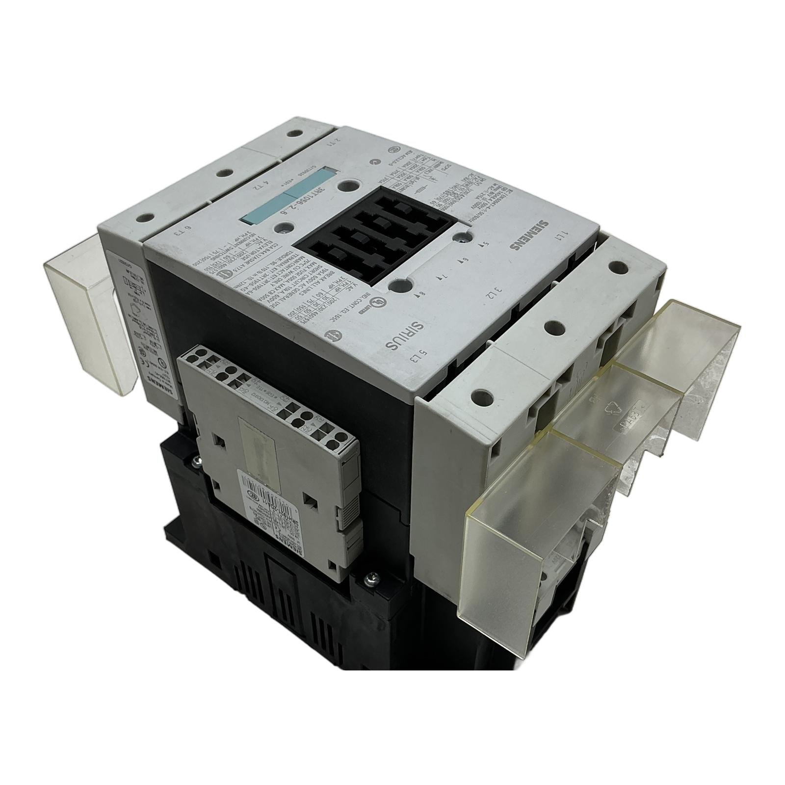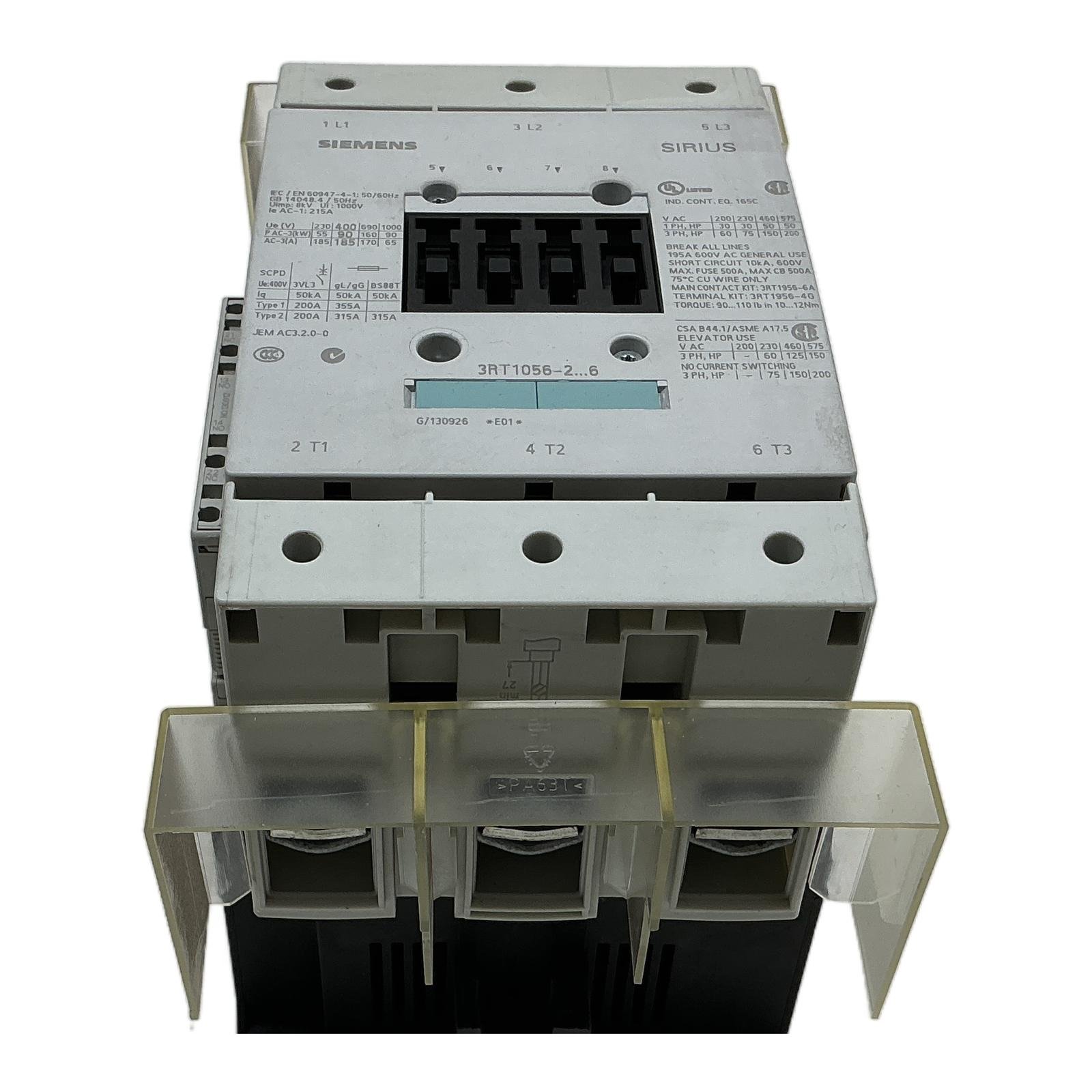 Siemens SIRIUS 3RT1056-2AM36 Power Contactor Description This is a Siemens SIRIUS 3RT1056-2AM36 power contactor, a robust 3-pole device designed for switching motors up to 90 kW at 400V. It belongs to the S6 size category and operates with a 110V AC (50Hz) / 120V AC (60Hz) control coil. This contactor is a reliable component for heavy-duty industrial applications and comes equipped with a 3RH1921-2DA11 auxiliary contact block. Specifications Manufacturer: Siemens Product Series: SIRIUS Type: Power Contactor Model: 3RT1056-2AM36 Poles: 3-Pole Size: S6 Rated Power (AC-3, 400V): 90 kW Rated Current (AC-3, 400V): 185 A Rated Current (AC-1): 215 A Coil Voltage: 110V AC at 50Hz / 120V AC at 60Hz Auxiliary Contacts (mounted): 3RH1921-2DA11 (2NO + 2NC) Label Info Standard: IEC/EN 60947-4-1 Rated Insulation Voltage (Ui): 1000V Rated Impulse Withstand Voltage (Uimp): 8kV Certifications: UL, CSA, CE Application Ideal for motor control in applications such as conveyors, pumps, fans, and other industrial machinery requiring high-power switching capabilities. Country of Origin Made in Germany. CO2 Impact By choosing this pre-owned contactor, you are helping to avoid 87.5 kg of CO2 emissions, which is comparable to the emissions from driving a car for 438 kilometers. Availability This unit is in stock and ready for immediate dispatch. Order now from profideals for expert support and fast delivery. FAQ What is the correct coil voltage for this 3RT1056-2AM36 contactor?The suffix ‘-2AM36’ in the model number indicates the coil voltage. This unit is designed for a control voltage of 110V AC at 50 Hz or 120V AC at 60 Hz. Can I use modern 3RT2 accessories with this obsolete 3RT1 contactor?No, accessories like auxiliary contacts and overload relays are generally not cross-compatible between the 3RT1 and the successor 3RT2 series due to differences in physical design. You must use accessories specified for the 3RT1 S6 size. What are the recommended tightening torques for the main power terminals?The label specifies a torque of 10 to 14 Nm (89 to 124 lb.in) for the main screw terminals (size M8). It is crucial to use a calibrated torque wrench to ensure a secure and safe connection. profideals is not an authorized distributor, reseller or representative of the products featured on this website. All product names, trademarks, brands and logos used on this site are the property of their respective owners. Last Update: March 13, 2026