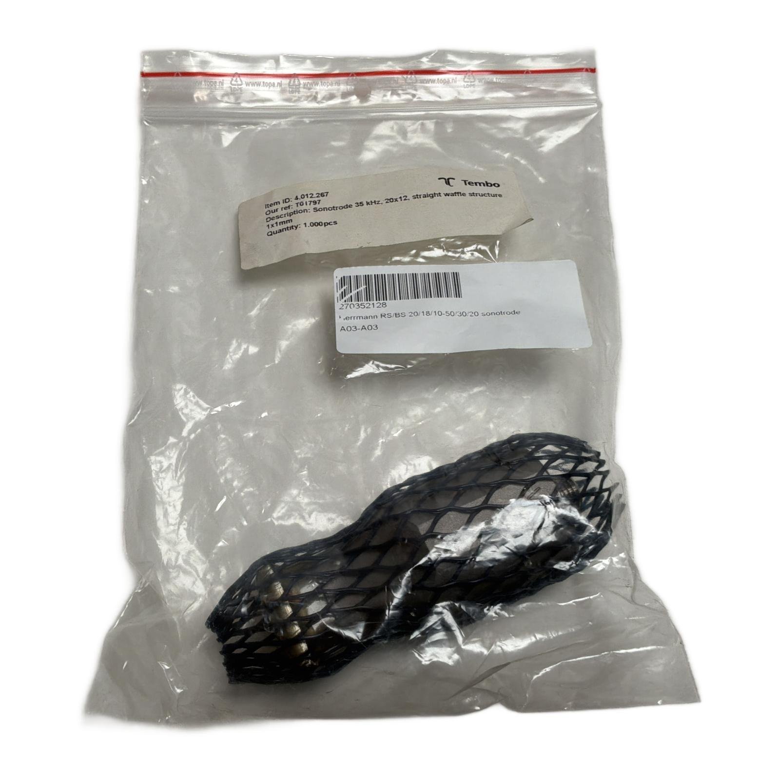 Herrmann 4.012.267 Sonotrode for Precision Ultrasonic Welding Product Description This high-quality Herrmann sonotrode, part number 4.012.267, is designed for precision ultrasonic welding applications. It operates at a frequency of 35 kHz, delivering a maximum welding amplitude of 37 µm for reliable and consistent bonds in industrial assembly processes. Product Specifications – Manufacturer: Herrmann – Part Number: 4.012.267 – Product Type: Sonotrode – Frequency: 35 kHz – Sonotrode Gain: 1:2.3 – Maximum Welding Amplitude: 37 µm – Weight: 0.23 kg – Welding Head Dimensions: 20×12 mm – Head Structure: Straight waffle, 1×1 mm – Coating: F2 Product Label Info Model Code / Product Markings: 4.012.267 Application This sonotrode is essential for advanced industrial assembly processes requiring precise ultrasonic welding. Country of Origin This product is manufactured in Germany. Method of Application Ensure proper integration and alignment for optimal performance in ultrasonic welding applications. Safety Instructions Handle with care to avoid damage to the sonotrode tip and maintain consistent welding quality. Availability Order now from profideals, items in stock and ready for fast worldwide delivery. Need urgent and express delivery, sourcing, or repairs? Contact us now. Documentation Official datasheet or product page Herrmann Resources Additional resources and manuals are available upon request. Contact us for details. Internal & External Links All products from Herrmann Explore similar products in Tools and Maintenance Frequently Asked Questions What is the Herrmann 4.012.267 Sonotrode used for? This part is typically used in industrial assembly processes for precision ultrasonic welding applications. What are the key advantages of the Herrmann 4.012.267 Sonotrode? Its high-quality construction and precise welding capabilities ensure strong and reliable bonds in manufacturing processes. Is 4.012.267 compatible with my system? If you’re using Herrmann ultrasonic welding systems, this model will likely be compatible. Contact us to verify. Alternatives to 4.012.267 For similar welding applications, consider exploring other Herrmann sonotrode models with different specifications. Can I sell my surplus stock to profideals? Yes, profideals accepts surplus stock for resale. Contact us for more information on surplus recovery and inventory clearance. Need Help? Call us at +31(0)165 20 11 80 or get in touch online. Last Update: 16/02/2026 profideals is not an authorized distributor of the products listed. Product names, trademarks, and logos belong to their respective owners. Our listings are for identification purposes only and do not imply affiliation or authorization.