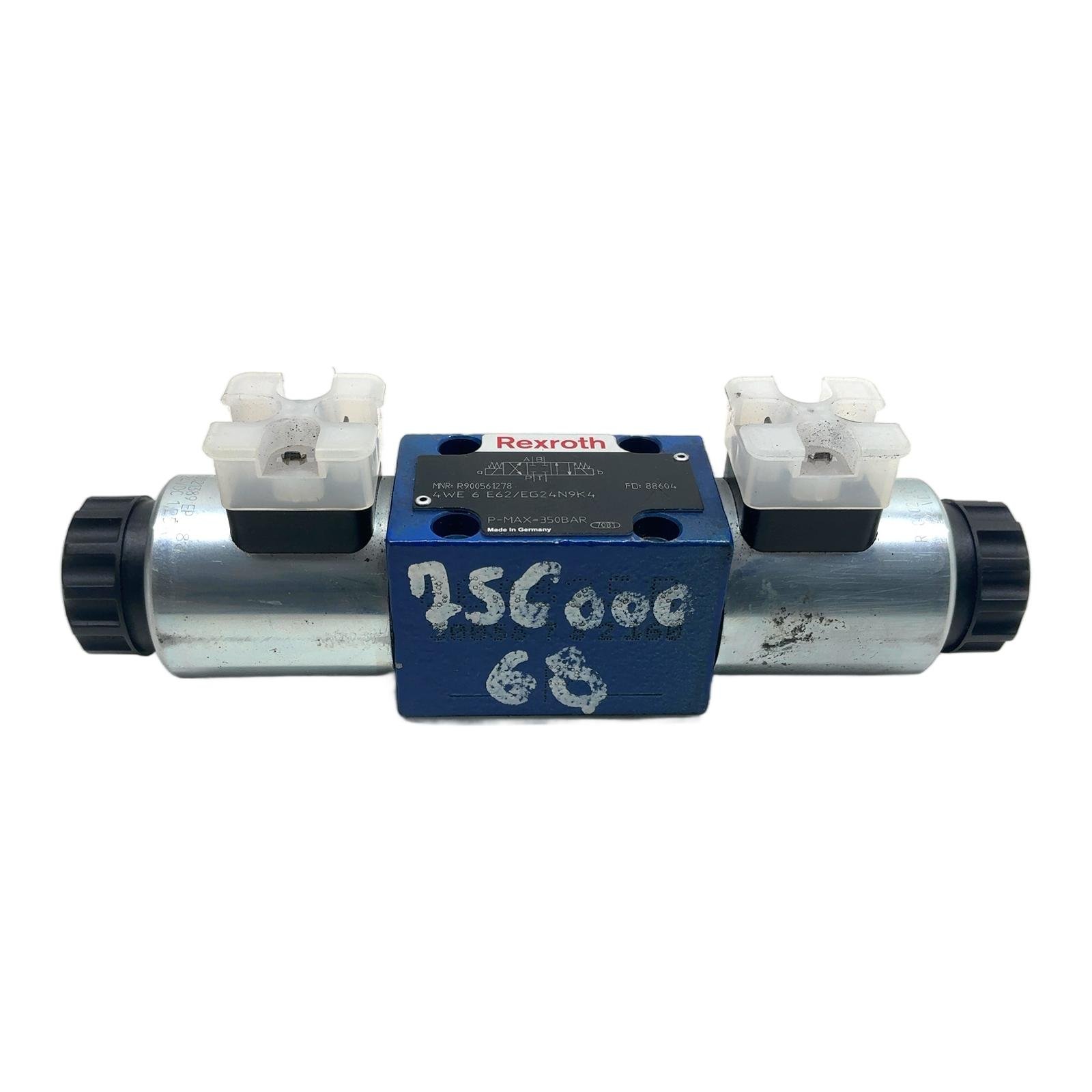 Rexroth 4WE 6 Series Hydraulic Directional Valve Description This is a Rexroth 4WE 6 E62/EG24N9K4 direct-operated directional spool valve. It is an industry-standard component for controlling fluid flow in hydraulic power systems. With its robust design and reliable 24V DC solenoid actuation, this valve ensures precise control and long service life. It is a 4/3-way valve (4 ports, 3 positions) with a spring-centered ‘E’ spool configuration. Specifications Manufacturer: Bosch Rexroth Part Number: R900561278 Type: 4WE 6 E62/EG24N9K4 Description: Directional Spool Valve Nominal Size: NG6 (CETOP 3) Actuation: Solenoid-operated Voltage: 24V DC Maximum Operating Pressure: 350 bar Mounting Interface: ISO 4401-03-02-0-05 Label Info MNR: R900561278 Type: 4WE 6 E62/EG24N9K4 FD: 88604 P-MAX: 350BAR Application This valve is suitable for a wide range of industrial hydraulic applications, including machine tools, presses, manufacturing lines, and general industrial machinery where reliable directional control is required. Country of Origin Made in Germany. CO2 Impact Choosing this pre-owned valve over a new one avoids the emission of approximately 15 kg of CO2. This saving is comparable to driving a standard passenger car for 75 kilometers. Availability This item is in stock and ready for immediate dispatch. Order now from profideals for expert support and fast delivery. FAQ What type of connector does this valve use?This valve uses a K4 individual connection style, which is compatible with a standard DIN EN 175301-803 (formerly DIN 43650) Form A connector. Please note that connectors are typically sold separately. What does the spool symbol ‘E’ mean?The spool symbol ‘E’ defines the flow path in the center (neutral) position. For this valve, it means all ports (P, A, B, T) are connected, which is often used for pump circulation at low pressure when the valve is not actuated. Can the solenoids be replaced individually?Yes, the solenoids on the Rexroth 4WE 6 series are modular and can be replaced. The part number for the 24V DC coil is R900021389. Always ensure the hydraulic system is depressurized before performing maintenance. Last Update: Friday, March 13, 2026 profideals is not an authorized distributor, reseller or representative of the products featured on this website. All product names, trademarks, brands and logos used on this site are the property of their respective owners.