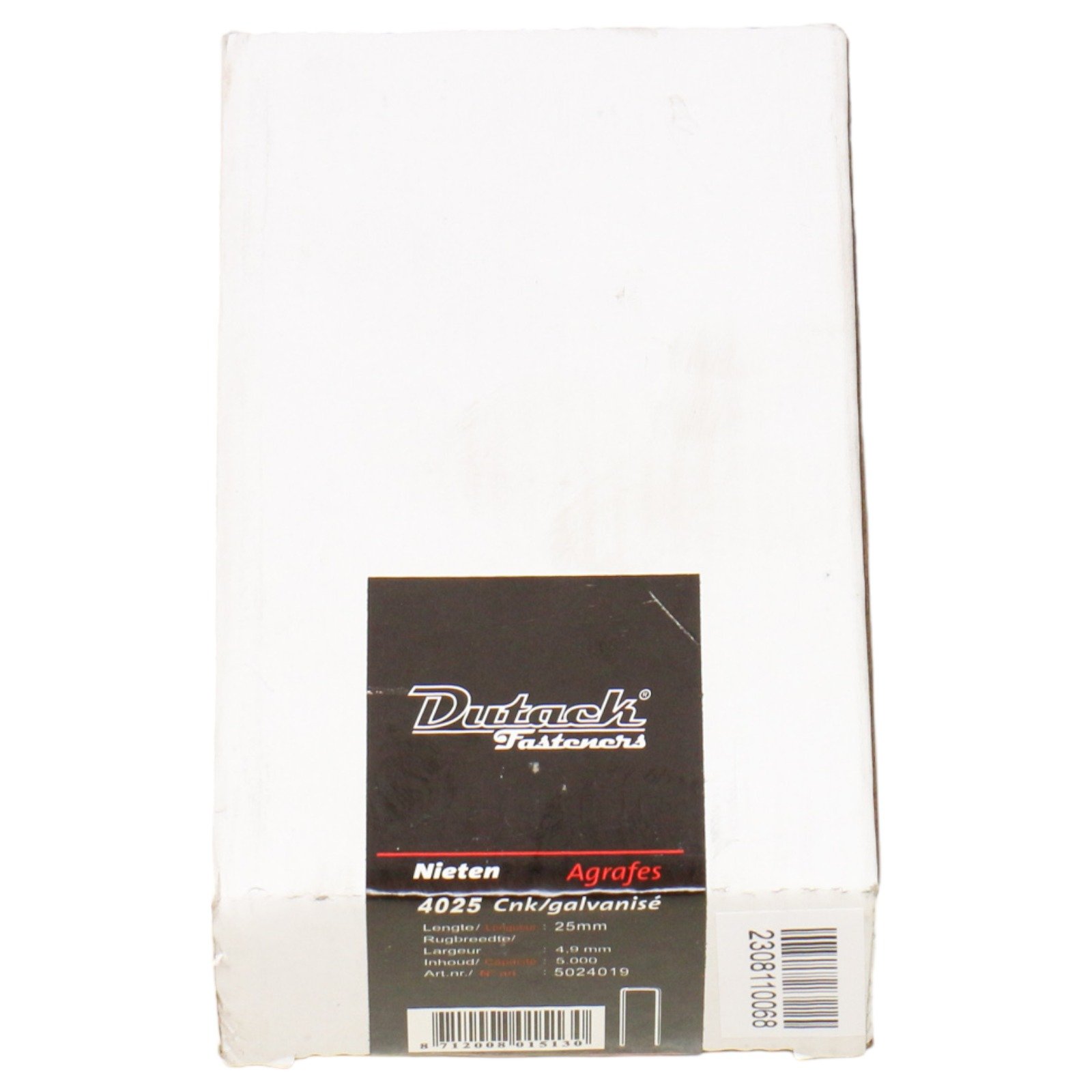 Nieten (Agrafes), 4025 CNK/Galvanise: Length: 25mm, Width4,9Mm, Content: 5000. Nieten (Agrafes) 4025 CNK/Galvanise: Length: 25mm Width: 4.9mm Content: 5000 Dutack fasteners are high-quality industrial fasteners designed for various applications. They are known for their durability and reliability, making them suitable for heavy-duty tasks in industries such as construction, automotive, and manufacturing. These fasteners are available for purchase at profideals, your trusted supplier for industrial components. Get your Dutack fasteners today and experience their exceptional performance in your industrial projects.