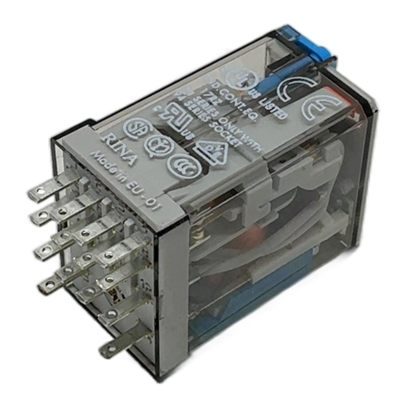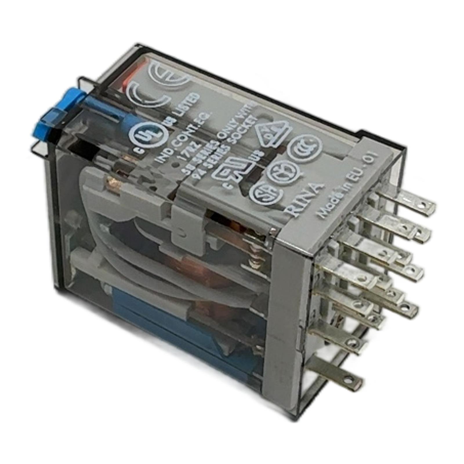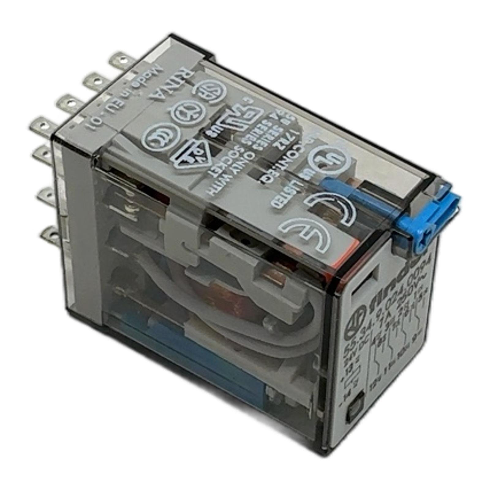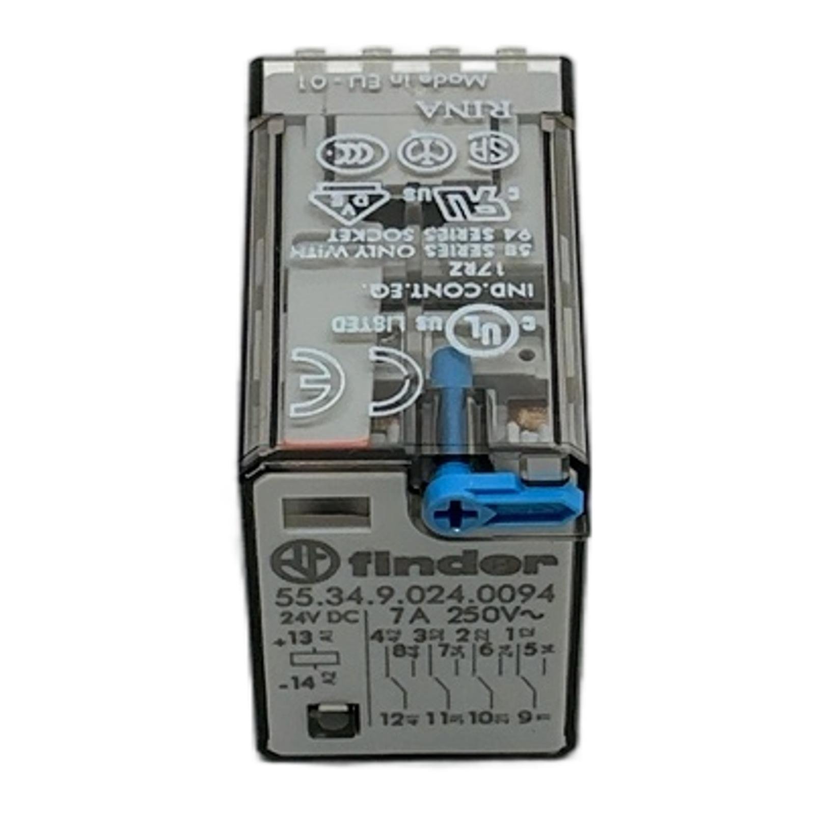 Finder Industrial Relay 24V DC 7A 55.34.9.024.0094 Description The Finder 55.34.9.024.0094 is a versatile miniature plug-in relay from the renowned 55 series. It is engineered for reliability in a wide range of industrial control applications, including automation panels, machinery, and process control systems. This model operates with a 24V DC coil and features four changeover contacts (4PDT) capable of switching loads up to 7A. It is equipped with a lockable test button for manual operation during commissioning, a mechanical indicator for visual status feedback, and an integrated LED to signal coil energization. Specifications Manufacturer: Finder Series: 55 Series Coil Voltage: 24V DC Contact Configuration: 4 CO (4PDT – 4 Pole Double Throw) Contact Current Rating: 7A Contact Voltage Rating: 250V AC Mounting Type: Plug-in (for 94 series sockets) Number of Pins: 14 Special Features: Lockable test button, Mechanical indicator, LED Label Info Brand: Finder Type: 55.34.9.024.0094 Coil: 24V DC Contact Load: 7A 250V AC Application This relay is ideally suited for use in industrial automation, building management systems, control panels, and any application requiring reliable, high-density switching of electrical loads. Country of Origin Manufactured in Italy. CO2 Impact Opting for a refurbished unit like this prevents the emission of approximately 1.4 kg of CO2 compared to manufacturing a new one. This saving is equivalent to the emissions from driving a standard car for 7 kilometers. Availability This item is in stock and ready for immediate dispatch. Order now from profideals for expert support and fast delivery. FAQ Question?What is the purpose of the blue lockable test button?The blue test button allows for manual actuation of the relay contacts without energizing the coil. The lockable feature enables you to force the contacts into the closed position for testing or commissioning purposes, which is useful for verifying circuit logic. Question?What is the correct socket or base for this 55.34 series relay?This relay is compatible with Finder’s 94 series sockets. Depending on your wiring preference, you can use screw terminal sockets (like 94.04, 94.84.3) or PCB mount sockets (like 94.54). Always verify the socket type matches the 14-pin configuration of this relay. Question?Is the integrated LED polarity-sensitive on this 24V DC model?Yes, for DC coil versions with an LED, polarity must be observed for the LED to function correctly. The positive terminal is pin 13, and the negative terminal is pin 14, as indicated on the relay housing. Reversing the polarity will not damage the relay coil but the LED will not illuminate. profideals is not an authorized distributor, reseller or representative of the products featured on this website. All product names, trademarks, brands and logos used on this site are the property of their respective owners. Friday, March 13, 2026