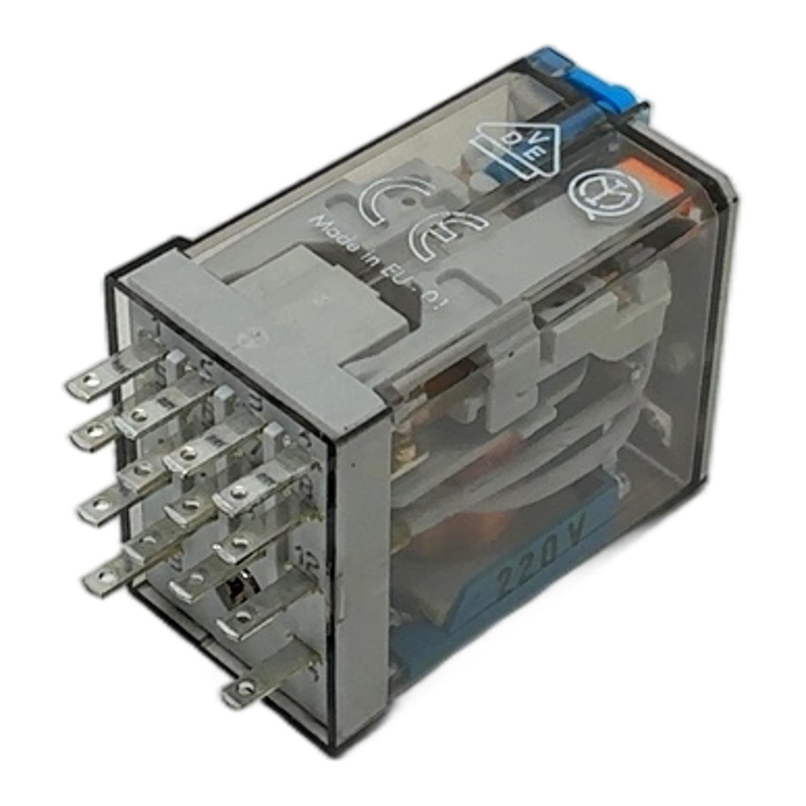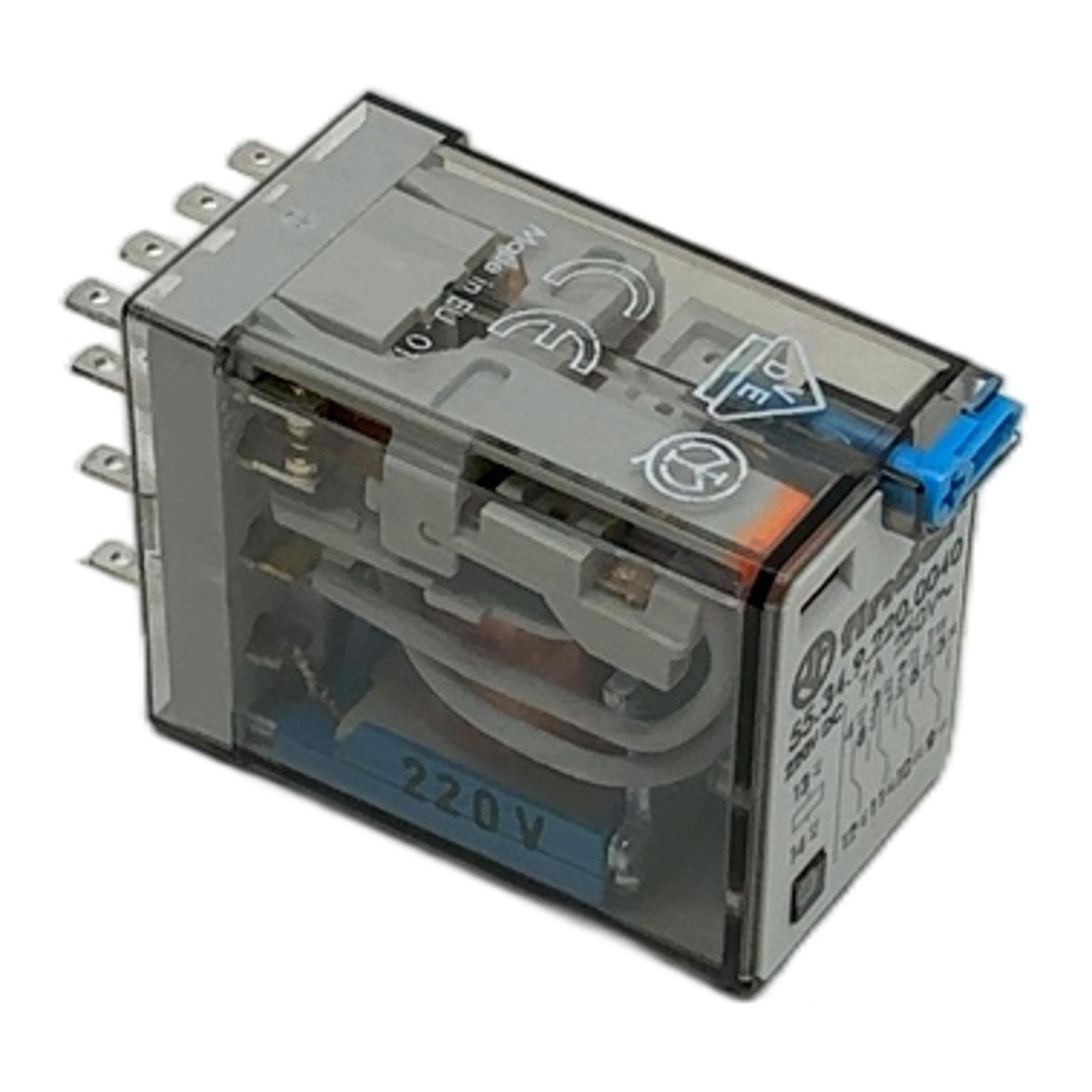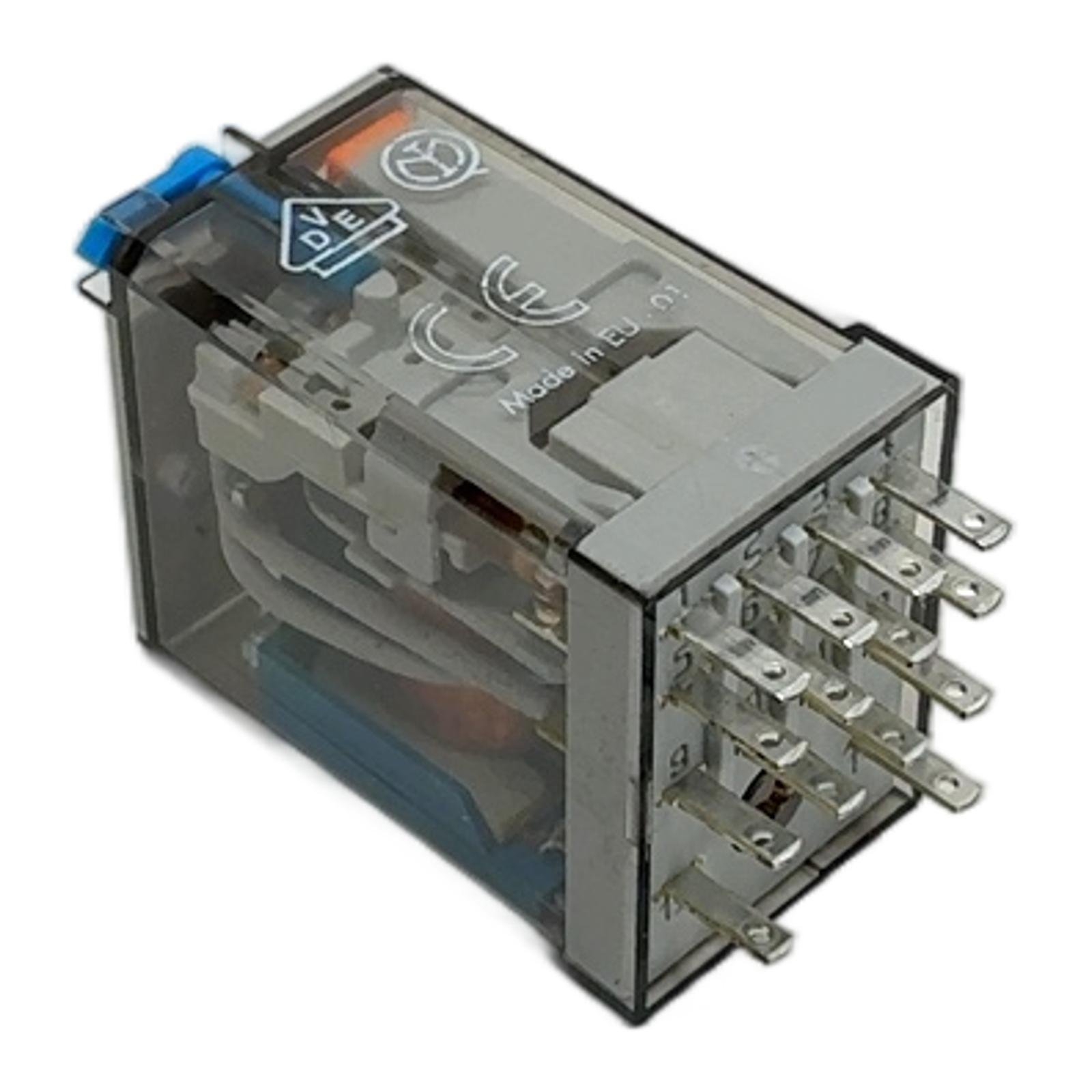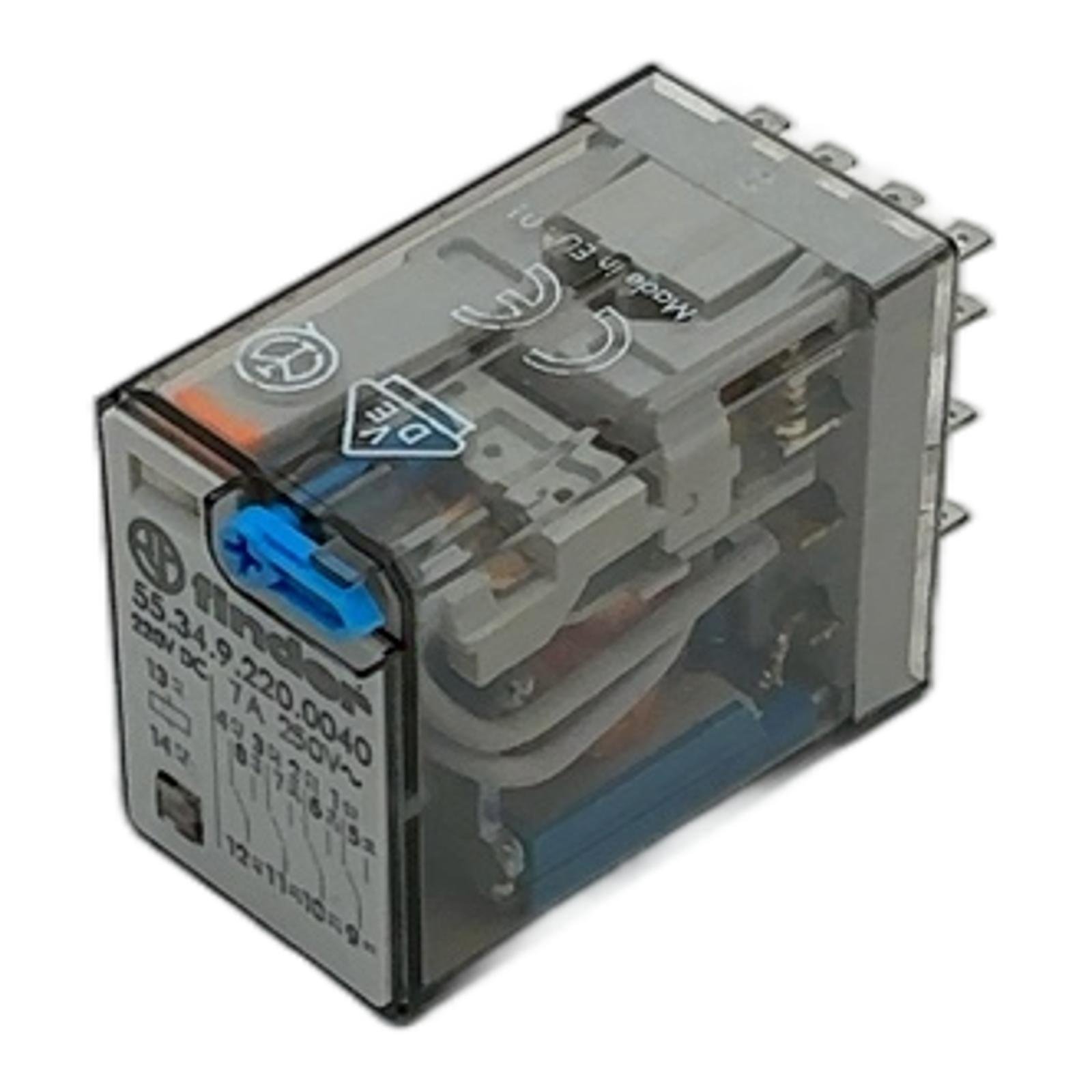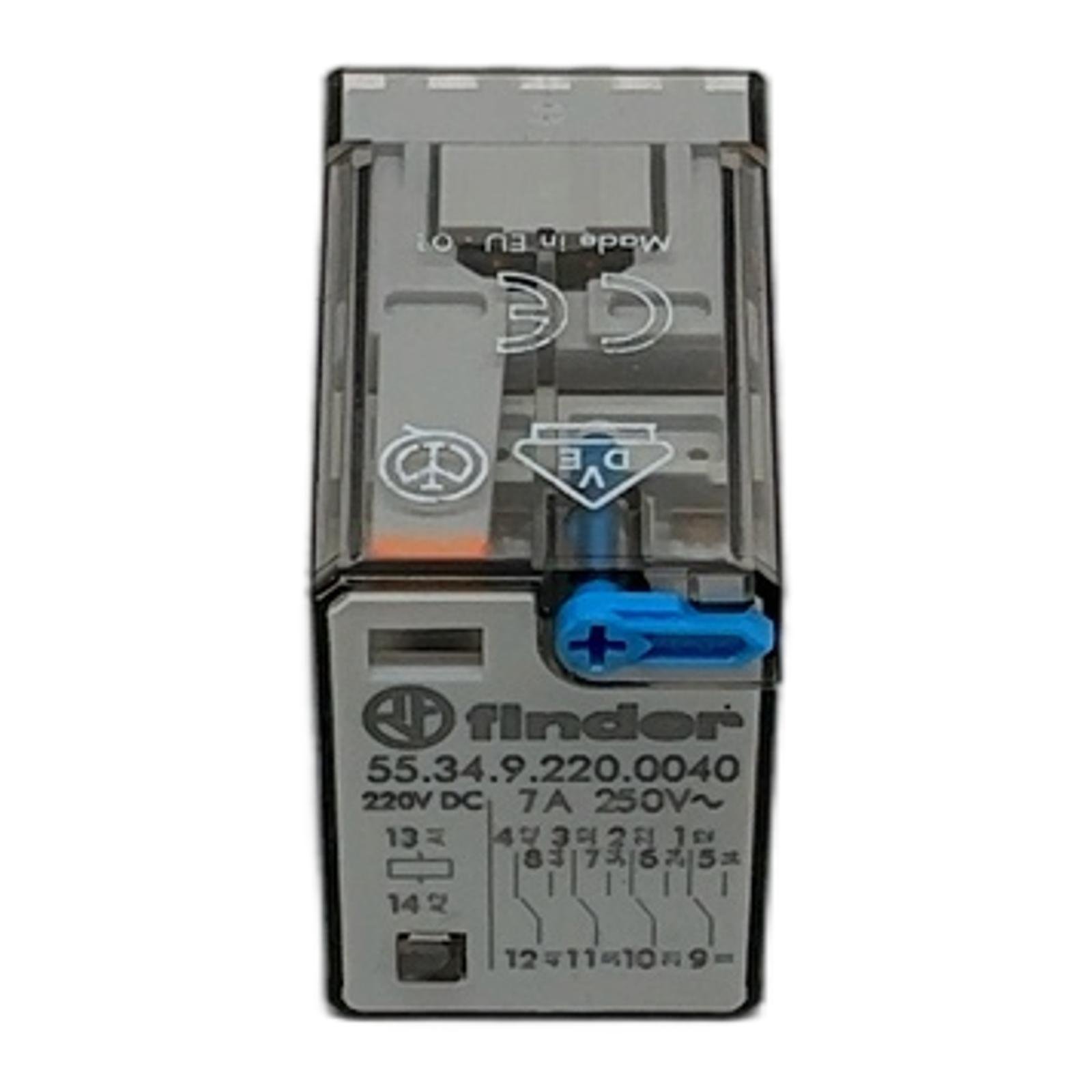 Finder 55.34.9.220.0040 Plug-in Relay Description The Finder 55.34.9.220.0040 is a high-quality miniature plug-in relay designed for a wide array of general-purpose applications in industrial automation and control systems. Part of the well-regarded 55 Series, this relay offers four changeover contacts (4PDT), providing excellent flexibility for complex switching tasks. It operates on a 220V DC coil and is capable of switching loads up to 7A at 250V AC. The relay features a lockable test button and a mechanical flag indicator for easy system diagnostics and commissioning. Order now from profideals for expert support and fast delivery. Specifications Manufacturer: Finder Series: 55 Series Model: 55.34.9.220.0040 Coil Voltage: 220V DC Contact Configuration: 4PDT (4 Changeover contacts) Contact Current Rating: 7 A Contact Voltage Rating: 250V AC Contact Material: AgNi (Silver Nickel) Mounting Type: Plug-in (compatible with 94 series sockets) Label Info Finder 55.34.9.220.0040 220V DC 7A 250V~ Application This versatile relay is commonly used in control panels, industrial machinery, building automation, and HVAC systems for tasks such as signal switching, motor control, and interfacing between different voltage levels. Country of Origin This product is manufactured by Finder, a company with primary production facilities in Italy. CO2 Impact Opting for this pre-owned component avoids the emission of approximately 1.4 kg of CO2 compared to manufacturing a new one, contributing to a more sustainable industrial environment. Availability This item is in stock and ready for immediate dispatch. FAQ What type of socket is compatible with the Finder 55.34.9.220.0040 relay?This relay is designed to be used with Finder’s 94 series sockets, such as the 94.04 (screw terminal) or 94.84.3 (screwless terminal) models for panel or 35mm DIN rail mounting. Can I use this 220V DC coil relay in an AC circuit?No, the coil is specifically rated for 220V DC (Direct Current). Applying AC voltage will likely damage the coil and cause the relay to fail. The contacts, however, are rated to switch AC loads up to 250V AC. What does the 4PDT (4 CO) contact configuration mean?4PDT stands for “Four Pole Double Throw”. This means the relay contains four separate, electrically isolated switches. Each switch (or pole) has a common terminal that connects to one of two other terminals (the “throws”). This is also known as 4 changeover (CO) contacts, making it highly versatile for controlling multiple circuits simultaneously. profideals is not an authorized distributor, reseller or representative of the products featured on this website. All product names, trademarks, brands and logos used on this site are the property of their respective owners. Last Update: Friday, March 13, 2026