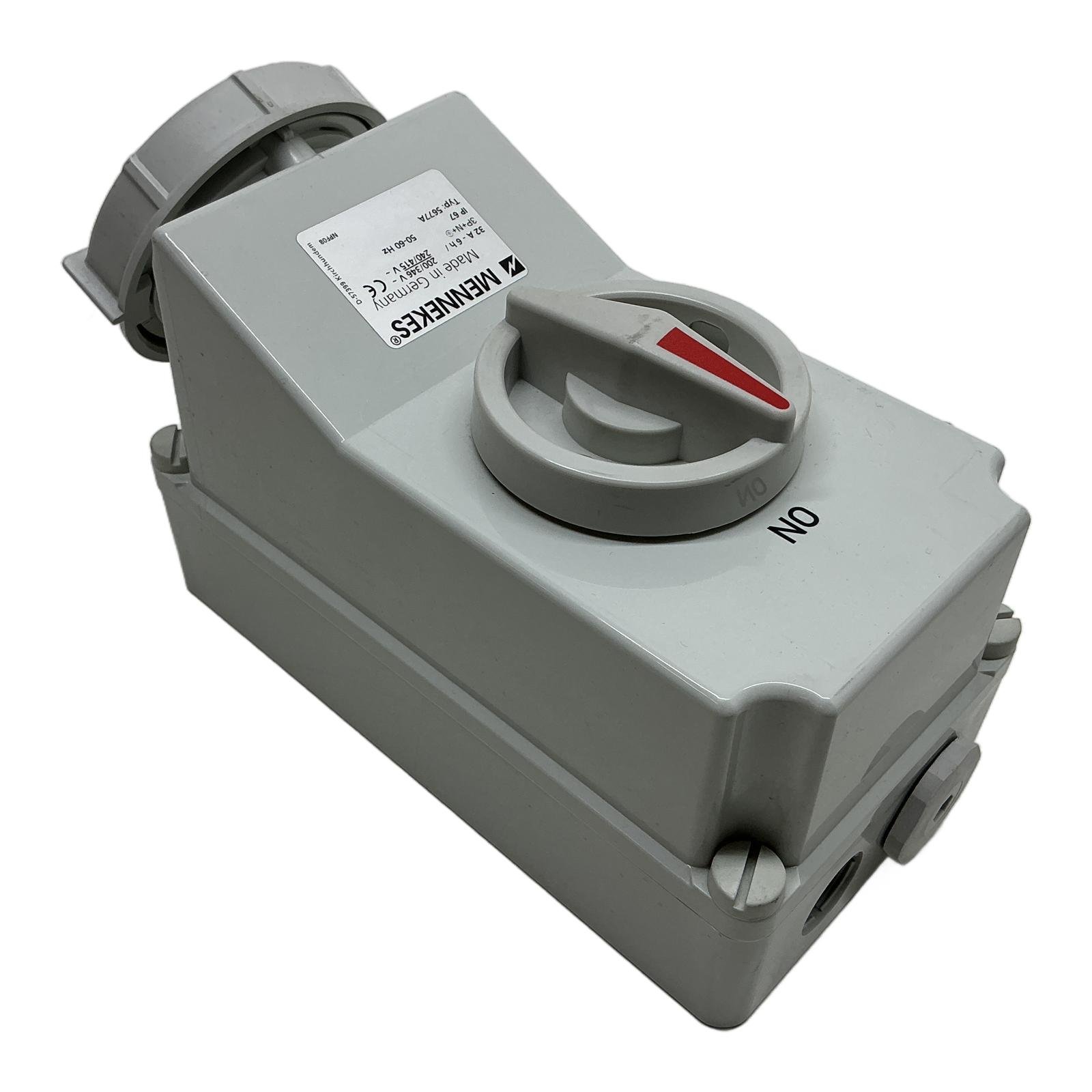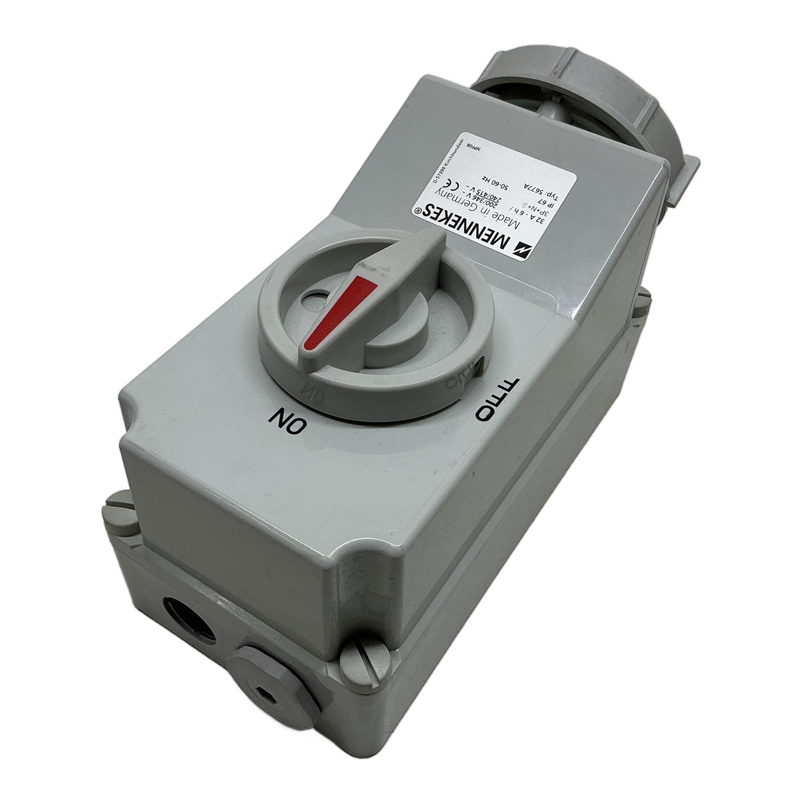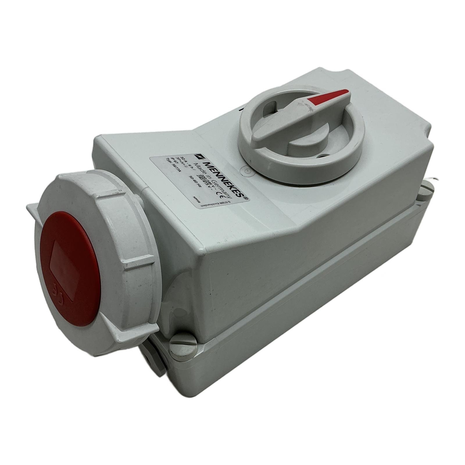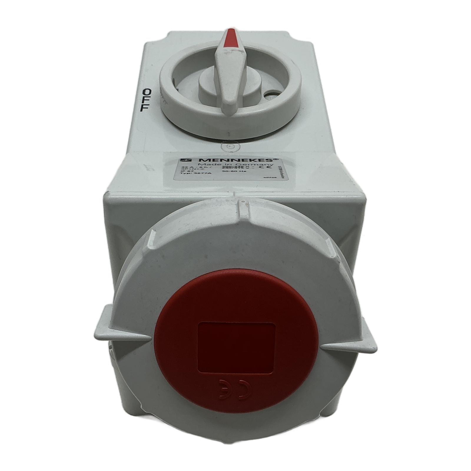 Mennekes 32A 5-Pole Switched & Interlocked Wall Socket Description The Mennekes 5677A is a high-quality wall-mounted socket outlet featuring an integrated switch with a mechanical interlock. Part of the robust AMAXX series, it is designed for demanding industrial environments where safety and reliability are paramount. The IP67 rating ensures protection against dust ingress and temporary immersion in water, making it suitable for both indoor and outdoor applications. Specifications Manufacturer: Mennekes Type: 5677A Current Rating: 32 A Voltage Rating: 200/346V to 240/415V AC Frequency: 50-60 Hz Number of Poles: 5 (3P+N+E) Clock Position: 6h Ingress Protection: IP67 Connection: Screw terminals Features: Switched, mechanically interlocked Label Info Typ: 5677A 32A – 6h 3P+N+E 200/346V – 240/415V~ IP 67 Made in Germany Application Ideal for use in workshops, manufacturing plants, construction sites, and agricultural settings for connecting heavy machinery and portable equipment safely. Country of Origin This product is manufactured in Germany. CO2 Impact Opting for this reused industrial component prevents the emission of approximately 32 kg of CO2, which is comparable to the emissions from a 160 km car journey. Your purchase contributes to a more sustainable industrial sector. Availability In stock and ready for immediate dispatch. Order now from profideals for expert support and fast delivery. FAQ What does the “interlocked” feature mean on the Mennekes 5677A?The mechanical interlock is a safety feature that prevents the switch from being turned ‘ON’ unless a plug is fully inserted. Conversely, the plug cannot be removed while the switch is in the ‘ON’ position. This prevents making or breaking a circuit under load, reducing the risk of arc flash and enhancing operator safety. Can this socket be used outdoors?Yes, the IP67 rating signifies that the socket is completely dust-tight and is protected against the effects of temporary immersion in water (up to 1 meter for 30 minutes). This makes it perfectly suitable for outdoor installations and areas subject to washdowns. What is the recommended cable cross-section for wiring this 32A socket?For a 32A rated socket, a minimum cable cross-section of 4 mm squared is typically recommended, though 6 mm squared is often used for longer cable runs to minimize voltage drop. Always consult local electrical codes and a qualified electrician to ensure compliance and safety. profideals is not an authorized distributor, reseller or representative of the products featured on this website. All product names, trademarks, brands and logos used on this site are the property of their respective owners. Last Update: Friday, March 13, 2026