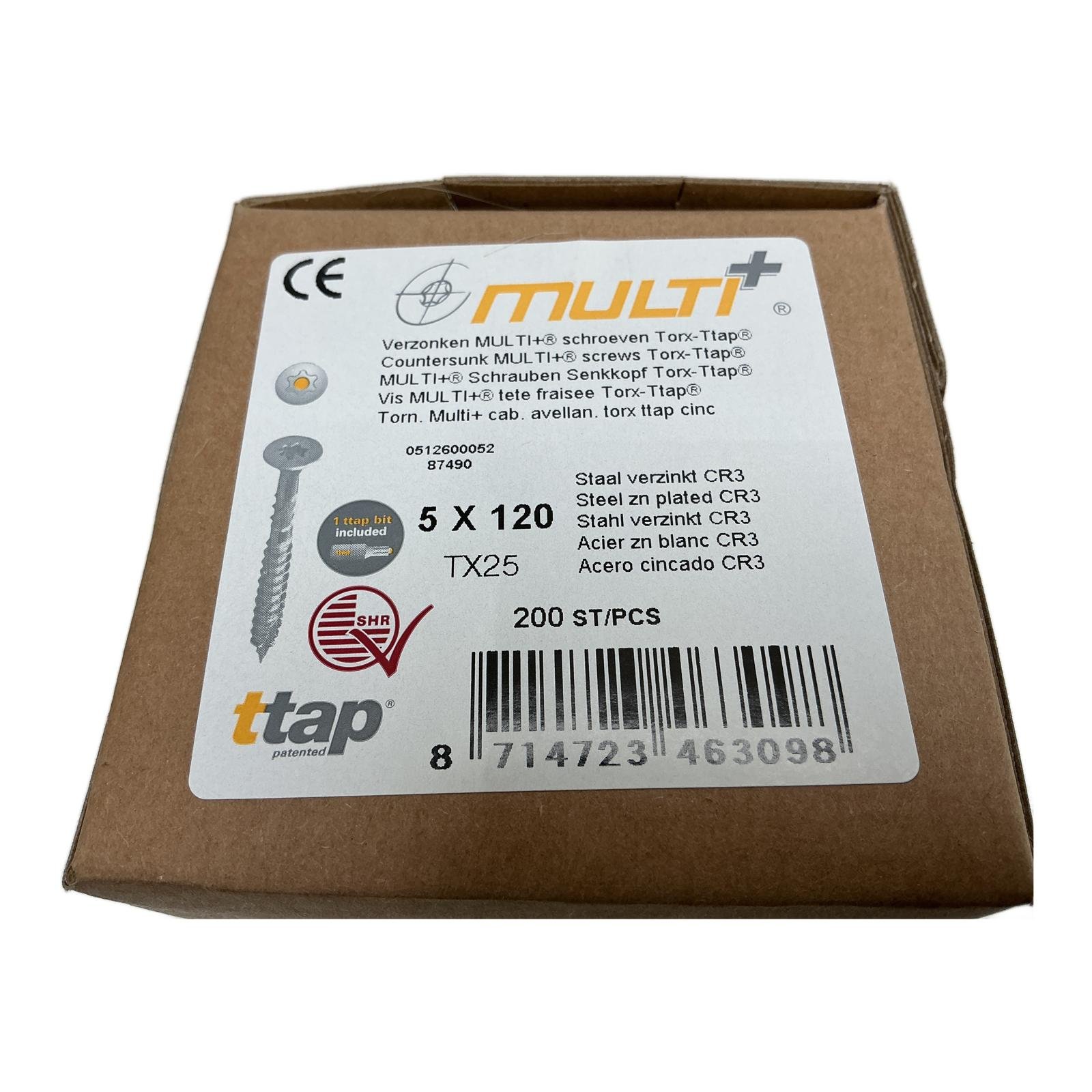 Steel wood screws Product Description This is a box of 200 high-quality MULTI+ countersunk screws, ideal for professional construction and woodworking projects. The screws feature the innovative Torx-Ttap drive system (TX25), which provides a stable, wobble-free connection for efficient and easy driving. A compatible ttap bit is conveniently included in the box. Manufactured from CR3 zinc-plated steel for excellent durability and corrosion resistance. Product Specifications – Brand: MULTI+ – Type: Countersunk Screw – Dimensions: 5 x 120 mm – Drive: Torx-Ttap (TX25) – Material: Steel, zinc-plated (CR3) – Quantity: 200 pieces per box – Included: 1 ttap bit – Part Number: 0512600052 – HS Item Description: Steel wood screws – HS Code (Commodity Code): 73181290 Product Label Info Model Code / Product Markings: 5×120/60 TF TX25 0512600052 Application Ideal for professional construction and woodworking projects. Country of Origin This product is manufactured in Not Specified. Method of Application Use with compatible tools for efficient driving. Safety Instructions Handle with care to avoid injury. Dispose of properly after use. Availability Order now from profideals, items in stock and ready for fast worldwide delivery. Need urgent and express delivery, sourcing, or repairs? Contact us now. Documentation Official datasheet or product page MULTI+ Resources Additional resources and manuals are available upon request. Contact us for details. Internal & External Links All products from MULTI+ Explore similar products in Tools and Maintenance Frequently Asked Questions What is the Steel wood screws used for? This part is typically used in construction and woodworking projects. It provides a stable connection for efficient driving. What are the key advantages of Steel wood screws? High-quality, durable screws that offer excellent corrosion resistance. Is 5×120/60 TF TX25 0512600052 compatible with my system? If you’re working on construction or woodworking projects, these screws will likely be compatible with your tools. Alternatives to 5×120/60 TF TX25 0512600052 For similar screws, consider exploring other sizes or types within the MULTI+ range. Can I sell my surplus stock to profideals? Yes, profideals accepts surplus stock. Contact us for more information on surplus recovery and resale options. Need Help? Call us at +31(0)165 20 11 80 or get in touch online. Last Update: 26/02/2026 profideals is not an authorized distributor of the products listed. Product names, trademarks, and logos belong to their respective owners. Our listings are for identification purposes only and do not imply affiliation or authorization.