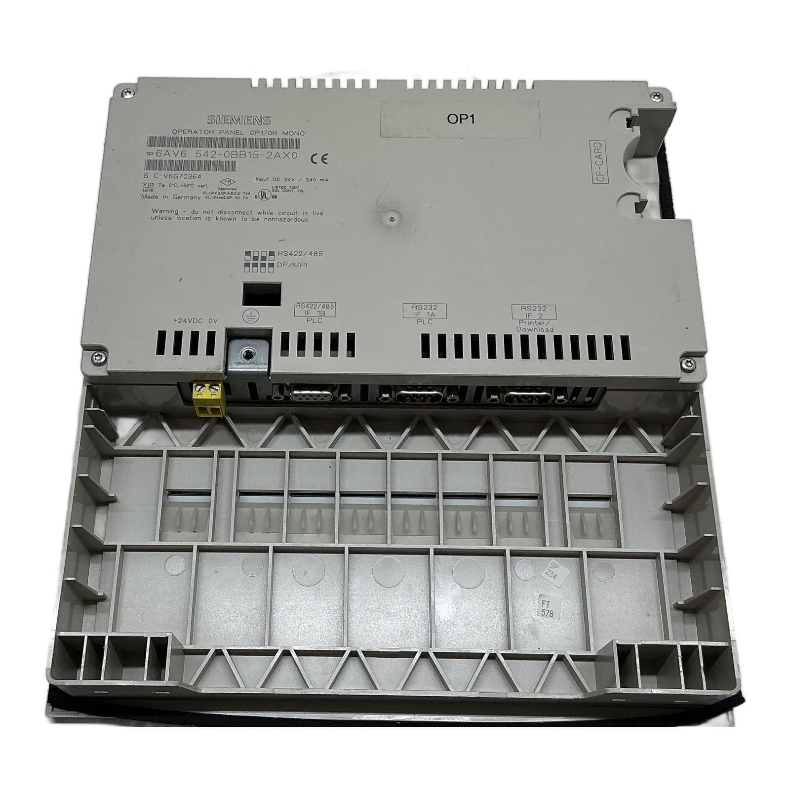 HMI Operator Panel Product Description This Siemens SIMATIC OP170B MONO operator panel is a robust Human Machine Interface (HMI) designed for controlling and monitoring machines and processes in industrial environments. Product Specifications – Manufacturer: Siemens – Product Line: SIMATIC HMI – Model: Operator Panel OP170B MONO – Type Number: 6AV6542-0BB15-2AXO – Input Voltage: 24V DC – Current Consumption: 240 mA – Display: Monochrome LCD – Interfaces: RS422/485 (DP/MPI), RS232 – Memory: CF-Card Slot Product Label Info Model Code / Product Markings: 6AV6542-0BB15-2AXO Application This operator panel is designed for use in industrial automation environments for efficient control and monitoring. Country of Origin This product is manufactured in Germany. Method of Application Integrate this operator panel into your Siemens automation system for seamless control and monitoring capabilities. Safety Instructions Handle this panel with care and follow the recommended voltage range for optimal performance. Availability Order now from profideals, items in stock and ready for fast worldwide delivery. Need urgent and express delivery, sourcing, or repairs? Contact us now. Documentation Official datasheet or product page Siemens Resources Additional resources and manuals are available upon request. Contact us for details. Internal & External Links All products from Siemens Explore similar products in Automation Frequently Asked Questions What is the HMI Operator Panel used for? This part is typically used in industrial automation environments for machine control and monitoring purposes. What are the key advantages of the HMI Operator Panel? It offers efficient data entry, system interaction, and seamless integration with Siemens automation systems. Is 6AV6542-0BB15-2AXO compatible with my system? If you’re using Siemens control systems, especially the SIMATIC HMI family, then this model will likely be compatible. Contact us to verify. Alternatives to 6AV6542-0BB15-2AXO If you’re looking for a similar part, consider exploring other Siemens operator panels within the SIMATIC HMI family. Can I sell my surplus stock to profideals? Yes, absolutely. profideals collaborates with companies to recover surplus stock. Contact us for more information. Need Help? Call us at +31(0)165 20 11 80 or get in touch online. Last Update: 17/03/2026 profideals is not an authorized distributor of the products listed. Product names, trademarks, and logos belong to their respective owners. Our listings are for identification purposes only and do not imply affiliation or authorization.
