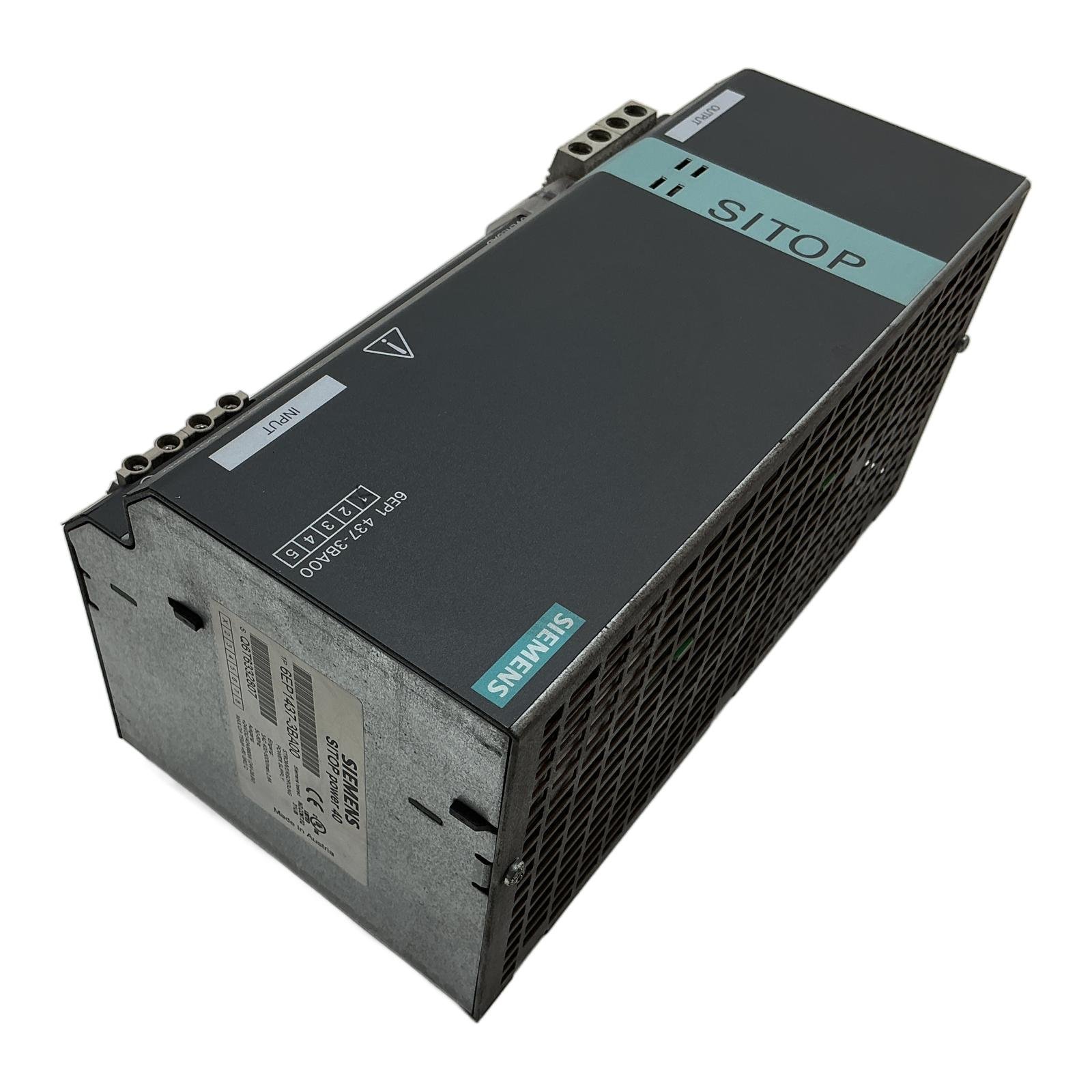 Siemens SITOP Power 40 Power Supply Description The Siemens SITOP power 40, model 6EP1437-3BA00, is a high-performance, three-phase power supply engineered for stability and reliability in industrial settings. It provides a regulated 24V DC output at 40A, making it an ideal power source for a wide range of automation components. Its robust design ensures continuous operation even under challenging conditions. Specifications Manufacturer: Siemens Product Series: SITOP power 40 Model Number: 6EP1437-3BA00 Input Voltage: 3-Phase 400-500V AC Frequency: 50/60Hz Output Voltage: 24V DC (adjustable 24-28.8V) Output Current: 40A Power: 960W Mounting: DIN Rail or direct mount Label Info Type: STROMVERSORGUNG / POWER SUPPLY Part no: 1P 6EP1437-3BA00 Serial no: S Q6T6332807 Application This power supply is perfectly suited for powering complex control systems, including PLCs, industrial PCs, sensors, and actuators in manufacturing, process control, and building automation. Country of Origin Made in Austria. CO2 Impact By purchasing this pre-owned unit, you help avoid the emission of approximately 140 kg of CO2, which would be generated during the production of a new device. This choice supports a more sustainable industrial ecosystem. Availability This item is a discontinued model but is available from our stock. Order now from profideals for expert support and fast delivery. FAQ What is the adjustable output voltage range for this SITOP power supply?The Siemens SITOP 6EP1437-3BA00 has an adjustable output voltage range from 24V to 28.8V DC, allowing for fine-tuning to compensate for voltage drops in long cable runs. Can this power supply be operated in parallel with another unit for redundancy or increased power?Yes, the SITOP power 40 series is designed with a parallel operation characteristic. You can connect multiple identical units in parallel to increase the total output current or to implement a redundant power supply system. What do the ‘OVERLOAD’ and ‘SHUT DOWN’ signals indicate?The ‘OVERLOAD’ signal is an early warning that the unit is operating above its rated current, typically indicating a high load condition. The ‘SHUT DOWN’ signal indicates that the unit has protectively switched off its output due to a severe overload or short circuit, protecting both the power supply and the connected equipment. profideals is not an authorized distributor, reseller or representative of the products featured on this website. All product names, trademarks, brands and logos used on this site are the property of their respective owners. Last Update: Friday, March 13, 2026