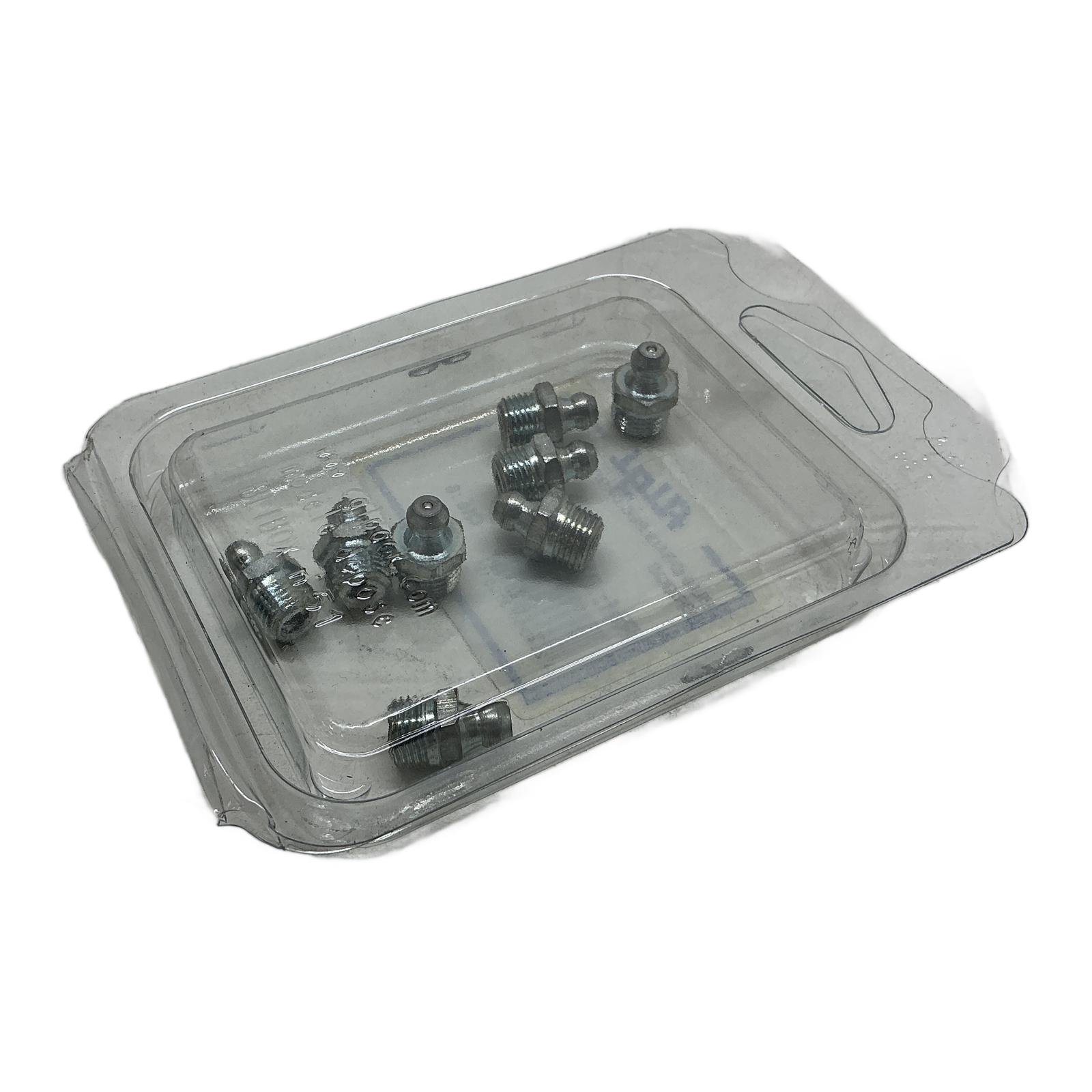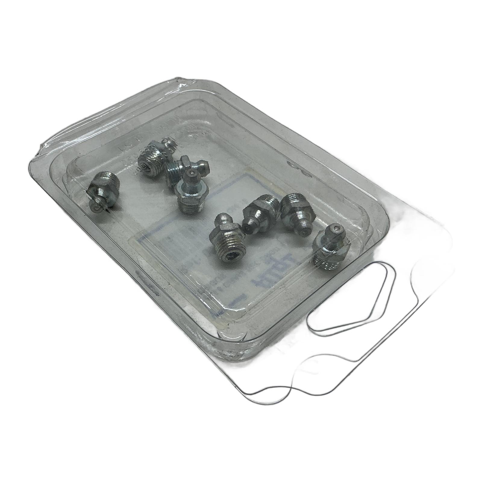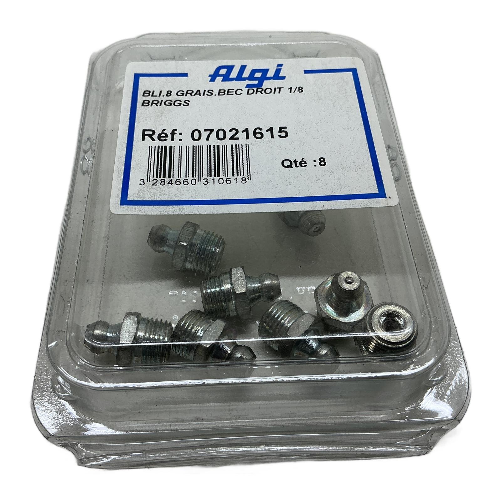 Algi Pack of 8 Straight Grease Nipples Description This is a pack of eight high-quality straight grease nipples, model 07021615, manufactured by Algi. These fittings, also known as Zerk fittings, provide a secure point for injecting lubricant into mechanical systems. They are essential for routine maintenance to ensure the longevity and smooth operation of bearings and other moving parts. Specifications Manufacturer: Algi Reference Number: 07021615 Type: Straight Grease Nipple Thread: 1/8-27 NPTF (Briggs) Material: Steel Quantity: 8 pieces Label Info Description: BLI.8 GRAIS.BEC DROIT 1/8 BRIGGS Reference (Ref): 07021615 Quantity (Qte): 8 EAN: 3284660310618 Application These grease nipples are widely used in automotive, industrial, agricultural, and construction machinery for lubricating chassis components, bearings, joints, and any other part requiring periodic greasing. Country of Origin This product is manufactured in France. CO2 Impact By choosing these refurbished or surplus parts, you are helping to avoid 0.13 kg of CO2 emissions compared to new production. This saving is equivalent to charging a smartphone over 15 times. Availability This pack is in stock and ready for immediate dispatch. Order now from profideals for expert support and fast delivery. FAQ What is the difference between 1/8-27 NPTF and 1/8 BSP thread?1/8-27 NPTF (National Pipe Taper Fuel), also known as Briggs thread, is a US standard with tapered threads for a tight seal, common in North America. 1/8 BSP (British Standard Pipe) is a UK standard, which can be parallel (BSPP) or tapered (BSPT), and has a different thread angle and pitch. They are not interchangeable. Always verify the required thread type for your application. What is the recommended installation torque for these grease nipples?While Algi does not specify a torque for this particular part, a general guideline for a steel 1/8 NPTF fitting into a cast iron or steel port is approximately 10-12 Nm (Newton-meters) or 7-9 ft-lbs. Over-tightening can damage the threads or the fitting itself. Are these nipples suitable for high-pressure lubrication systems?Yes, these Algi grease nipples are manufactured to standard specifications suitable for use with most manual, air-operated, or electric grease guns. They are designed to handle the high pressures generated during lubrication cycles, typically up to several thousand PSI. Last Update: Friday, March 13, 2026 profideals is not an authorized distributor, reseller or representative of the products featured on this website. All product names, trademarks, brands and logos used on this site are the property of their respective owners. The depiction, description or sale of products featuring these names, trademarks, brands and logos is for identification purposes only and is not intended to indicate any affiliation with or authorization by any rights holder.
