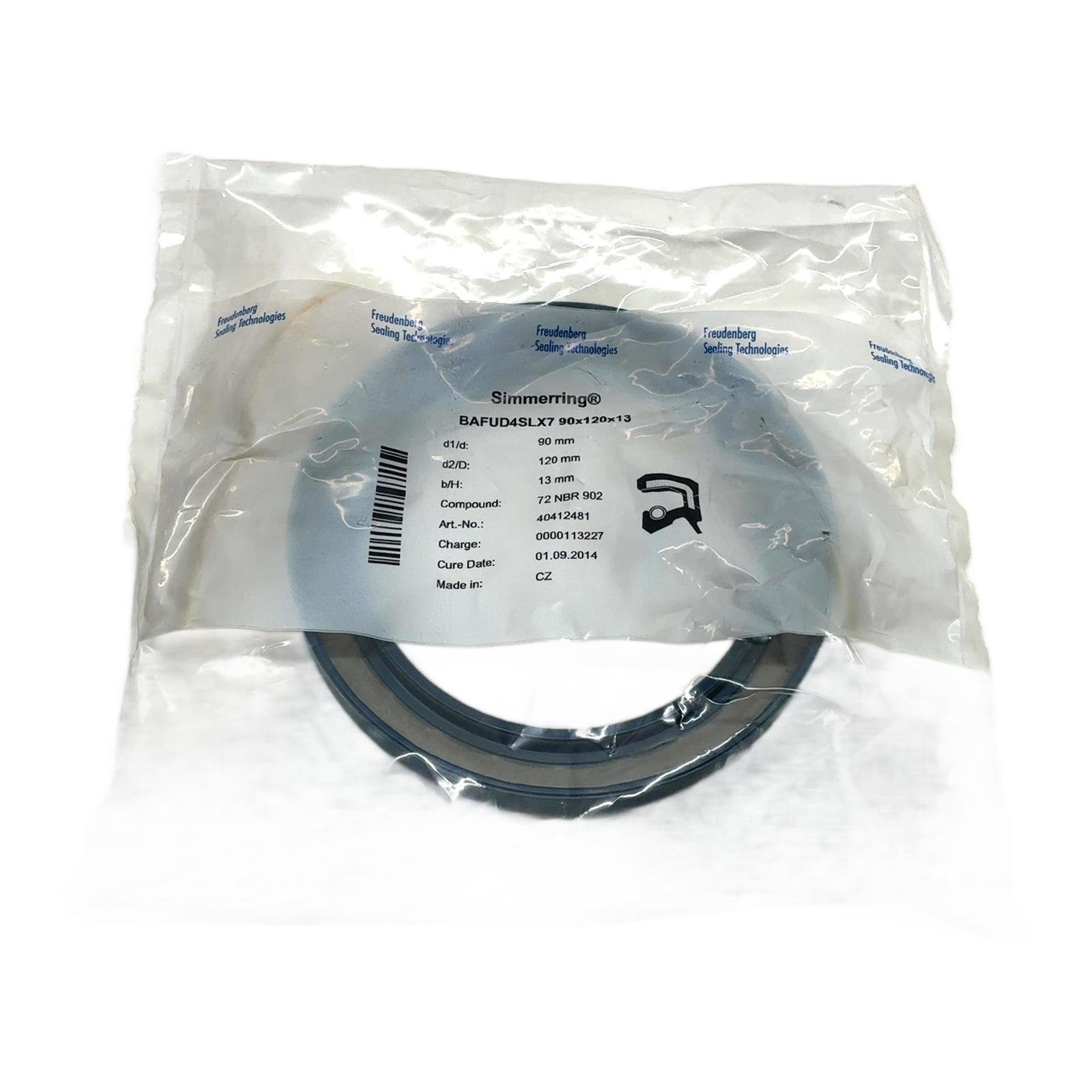 Freudenberg Simmerring BAFUD4SLX7 Oil Seal Description This is a genuine Freudenberg Simmerring, a premium radial shaft seal designed for optimal performance and longevity. The BAFUD4SLX7 model is engineered for reliable sealing of rotating shafts, effectively retaining lubricants while excluding dirt, moisture, and other contaminants. Its construction from 72 NBR 902 compound ensures good resistance to oils, fuels, and greases, making it suitable for a wide range of standard industrial applications. Specifications Manufacturer: Freudenberg Sealing Technologies Product: Simmerring Radial Shaft Seal Model: BAFUD4SLX7 Inner Diameter: 90 mm Outer Diameter: 120 mm Width: 13 mm Material Compound: 72 NBR 902 Label Info Art. No.: 40412481 Charge: 0000113227 Cure Date: 01.09.2014 Application Ideal for use in general machinery, gearboxes, pumps, electric motors, and drive systems where reliable sealing is critical to operational integrity and service life. Country of Origin Made in the Czech Republic (CZ). CO2 Impact Choosing this surplus part over a new one avoids approximately 3.0 kg of CO2 emissions, contributing to a more sustainable industrial practice. Availability This item is in stock and ready for immediate dispatch. It is a new-old-stock (NOS) product in its original, sealed packaging. Order now from profideals for expert support and fast delivery. FAQ What is the significance of the ’72 NBR 902′ compound?’72’ refers to the Shore A hardness of the material, which is a medium hardness suitable for many applications. ‘NBR’ stands for Nitrile Butadiene Rubber, a common elastomer known for its excellent resistance to mineral oils and greases. ‘902’ is Freudenberg’s specific formulation code for this NBR compound. Can this seal be used in high-temperature applications?NBR material generally has a continuous operating temperature range of approximately -30 deg C to 100 deg C. For applications with consistently higher temperatures, a seal made from a material like FKM (Viton) would be a more suitable choice. What is the recommended installation procedure to avoid damaging the sealing lip?Always ensure the shaft and housing bore are clean and free of burrs. Lubricate the seal and the shaft with the system’s operating medium. Use a proper installation tool that applies even pressure on the seal’s outer diameter to press it into the housing. Never hammer directly on the seal, as this can damage the sensitive sealing lip and the metal case. profideals is not an authorized distributor, reseller or representative of the products featured on this website. All product names, trademarks, brands and logos used on this site are the property of their respective owners. Last Update: Friday, March 13, 2026