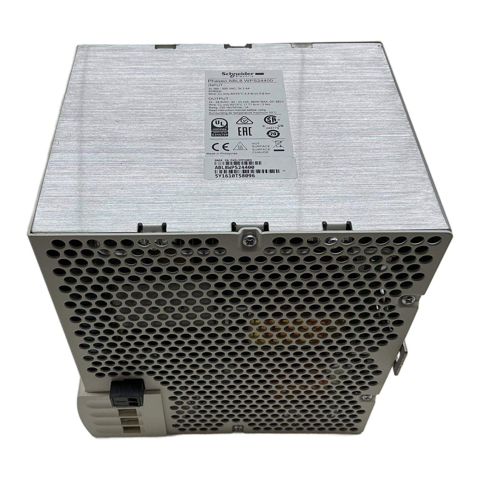Industrial DC Power Supply Product Description The Schneider Electric ABL8WPS24400 is a high-performance power supply from the Phaseo series, designed for industrial applications requiring a stable and reliable 24V DC source. Product Specifications – Product Series: Phaseo – Input Voltage: 3 x 380…500 V AC (three-phase) – Input Current: 3 x 2.4 A – Frequency: 50/60 Hz – Output Voltage: 24…28.8 V DC (adjustable) – Output Current: 40…33.33 A – Output Power: 960 W – Operating Temperature: Max 50°C – Protections: Protection against overloads and short-circuits – HS Item Description: Industrial DC Power Supply – HS Code: 85044090 Product Label Info Model Code / Product Markings: ABL8WPS24400 GTIN-13: 3389110837887 Application Ideal for powering demanding automation systems, including PLCs, motors, and control panels. Country of Origin This product is manufactured in France. Method of Application Designed for industrial applications requiring a stable and reliable 24V DC source. Safety Instructions Ensure proper grounding and follow manufacturer guidelines for installation. Availability Order now from profideals, items in stock and ready for fast worldwide delivery. Need urgent and express delivery, sourcing, or repairs? Contact us now. Documentation Official datasheet or product page Schneider Electric Resources Additional resources and manuals are available upon request. Contact us for details. Internal & External Links All products from Schneider Electric Explore similar products in Automation Frequently Asked Questions What is the Industrial DC Power Supply used for? This part is typically used in industrial automation systems to provide a stable 24V DC power source. What are the key advantages of the Industrial DC Power Supply? High output power, adjustable voltage and current, and built-in protections for safety. Is ABL8WPS24400 compatible with my system? If you’re using Schneider Electric control systems, then this model will likely be compatible. Contact us to verify. Alternatives to ABL8WPS24400 Consider other Schneider Electric power supply models for similar functionality. Can I sell my surplus stock to profideals? Yes, profideals accepts surplus stock for resale. Contact us for more information. Need Help? Call us at +31(0)165 20 11 80 or get in touch online. Last Update: 15/03/2026 profideals is not an authorized distributor of the products listed. Product names, trademarks, and logos belong to their respective owners. Our listings are for identification purposes only and do not imply affiliation or authorization.