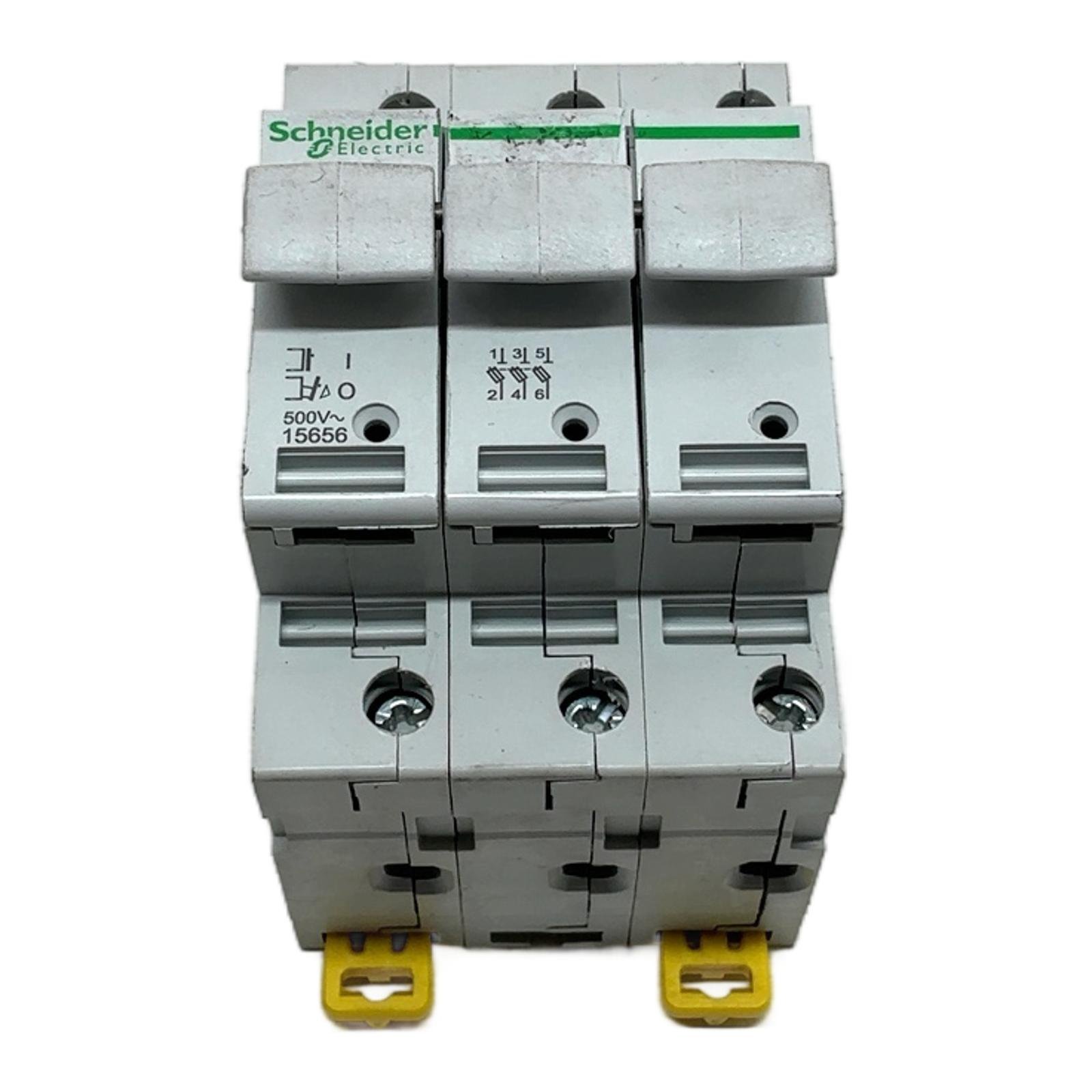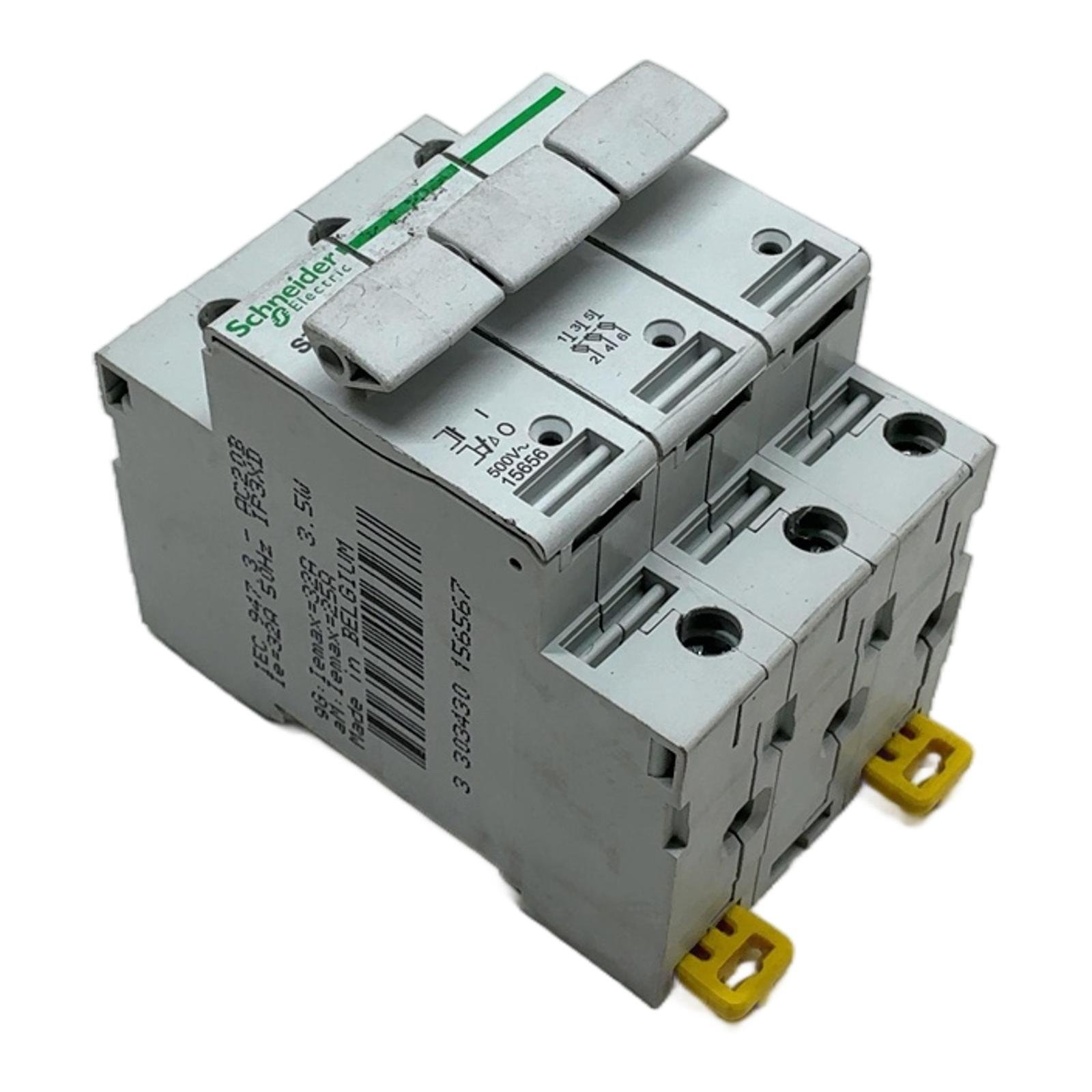 Schneider Electric Acti9 STI 15656 Fuse Disconnector Description The Schneider Electric 15656 is a robust 3-pole fuse disconnector from the trusted Acti9 STI series. It is designed to provide overcurrent protection and safe circuit isolation for industrial and commercial applications. This unit is mounted on a standard DIN rail and accommodates 10.3x38mm cylindrical fuses, offering a reliable solution for protecting three-phase systems. Specifications Manufacturer: Schneider Electric Part Number: 15656 Series: Acti9 STI Number of Poles: 3P (3-pole) Rated Current (Ie): 32A Rated Voltage (Ue): 500V AC Fuse Size: 10.3 x 38 mm Compatible Fuse Types: gG (up to 32A), aM (up to 25A) Mounting: DIN Rail Standard: IEC 60947-3 Label Info Brand: Schneider Electric Model: STI 10.3×38 Part Nr.: 15656 EAN: 3303430156567 Voltage: 500V~ Current: Ie=32A (gG), Iemax=25A (aM) Application Ideal for use in distribution boards, machine control panels, and automation systems to protect motors, transformers, and other electrical loads from short circuits and overloads. Country of Origin Made in Belgium. CO2 Impact By purchasing this pre-owned component, you are contributing to a circular economy and helping to avoid approximately 8.0 kg of CO2 emissions associated with the production of a new one. Availability This item is in stock and ready for immediate dispatch. Order now from profideals for expert support and fast delivery. FAQ What type of fuses are compatible with the Schneider 15656? This disconnector is designed for cylindrical industrial fuses of size 10.3 x 38 mm. It is compatible with both gG type fuses up to 32A and aM (motor protection) type fuses up to 25A. Can this fuse disconnector be used in a 3-phase system? Yes, as a 3-pole (3P) device, it is specifically designed for use in three-phase electrical systems to provide simultaneous disconnection and protection for all three phases. What is the breaking capacity of this device? The breaking capacity is determined by the installed fuse, not the holder itself. The holder is rated according to IEC 60947-3 for isolation purposes. You must select a 10.3x38mm fuse with an appropriate breaking capacity (e.g., 20 kA, 100 kA) for your specific application’s short-circuit current level. profideals is not an authorized distributor, reseller or representative of the products featured on this website. All product names, trademarks, brands and logos used on this site are the property of their respective owners. Laatst bijgewerkt: Friday, March 13, 2026