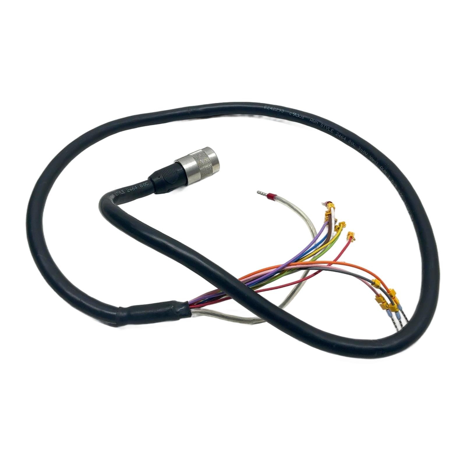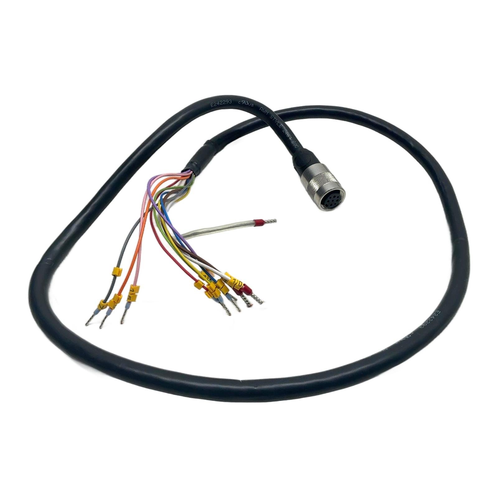 Generic 9-Pin Female Encoder/Signal Cable Description This is a versatile and robust connection cable designed for a wide range of industrial automation applications. It features a durable 9-pin female circular connector on one end and professionally terminated wires with insulated ferrules on the other, making it ready for integration into your system. The cable adheres to the AWM Style 2464 standard, ensuring high-quality performance and safety. Specifications Connector Type: 9-Pin Female Circular, Screw-Locking Termination: Pre-stripped wires with insulated ferrules Cable Standard: AWM Style 2464 Voltage Rating: 300V Temperature Rating: 80 deg C Flame Resistance: VW-1, FT1 Label Info UL File No: E242293 Cable Marking: cRUus AWM STYLE 2464 80C 300V VW-1 AWM I A/B 80C 300V FT1 Application Ideal for connecting encoders, servo motors, sensors, and other devices in factory automation, robotics, and machinery. The open-ended design allows for custom wiring to terminal blocks or other connectors. Country of Origin The bulk cable is manufactured in China (based on UL file number). The final assembly origin is not specified. CO2 Impact Choosing this reused cable assembly saves an estimated 6.0 kg of CO2 compared to a new one. This is equivalent to the emissions from driving a standard car for 30 kilometers. Availability This item is in stock and ready for immediate dispatch. Order now from profideals for expert support and fast delivery. FAQ What is the pinout for this 9-pin connector? The pinout is not standard and depends on the specific equipment it was intended for. Users must verify the pinout with their device’s documentation before connecting to avoid damage. Can this cable be used for RS232 or CAN bus communication? While the cable has enough conductors, its suitability for specific protocols like RS232 or CAN bus depends on factors like shielding, impedance, and wire gauge, which are defined by the AWM 2464 standard. It is primarily designed for sensor and encoder signals, but compatibility should be verified. What are the wire gauges of the internal conductors? The AWM 2464 standard covers a range of wire gauges. Without a specific datasheet for this exact cable, the gauge is not specified, but it is typically between 20 AWG and 28 AWG for this type of application cable. Last Update: Friday, March 13, 2026 profideals is not an authorized distributor, reseller or representative of the products featured on this website. All product names, trademarks, brands and logos used on this site are the property of their respective owners. The depiction, description or sale of products featuring these names, trademarks, brands and logos is for identification purposes only and is not intended to indicate any affiliation with or authorization by any rights holder.