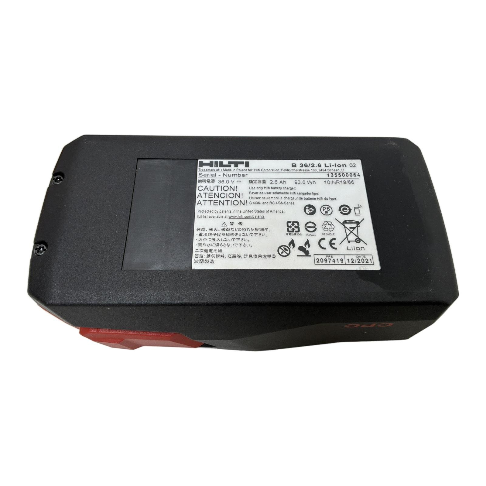 Lithium-ion accumulator (battery pack) Product Description This is a genuine Hilti B 36/2.6 Li-Ion battery pack designed to deliver reliable and long-lasting power for Hilti’s 36V cordless tools. It features CPC technology for intelligent power management and a built-in state-of-charge indicator. Product Specifications – Manufacturer: Hilti – Model: B 36/2.6 – Technology: Li-Ion – Voltage: 36 V – Capacity: 2.6 Ah – Energy: 93.6 Wh – Cell Type: 10INR19/66 Product Label Info Model Code / Product Markings: B36/2.6 Application Designed for use with Hilti’s 36V cordless tools. Country of Origin This product is manufactured in Germany. Method of Application Compatible with Hilti C 4/36 and RC 4/36 series chargers. Safety Instructions Handle with care and follow manufacturer guidelines for charging and storage. Availability Order now from profideals, items in stock and ready for fast worldwide delivery. Need urgent and express delivery, sourcing, or repairs? Contact us now. Documentation Official datasheet or product page Hilti Resources Additional resources and manuals are available upon request. Contact us for details. Internal & External Links All products from Hilti Explore similar products in Tools and Maintenance Frequently Asked Questions What is the Lithium-ion accumulator (battery pack) used for? This part is typically used in cordless tools, providing reliable power for various applications. What are the key advantages of Lithium-ion accumulator (battery pack)? It offers a balance of runtime and weight, with intelligent power management features. Is B36/2.6 compatible with my system? If you’re using Hilti cordless tools, especially the 36V range, then this model will likely be compatible. Contact us to verify. Alternatives to B36/2.6 If you’re looking for a similar battery pack, consider other models in Hilti’s 36V range. These offer comparable performance and compatibility. Can I sell my surplus stock to profideals? Yes, absolutely. We collaborate with companies to recover surplus stock. Contact us for more information. Need Help? Call us at +31(0)165 20 11 80 or get in touch online. Last Update: 23/02/2026 profideals is not an authorized distributor of the products listed. Product names, trademarks, and logos belong to their respective owners. Our listings are for identification purposes only and do not imply affiliation or authorization.