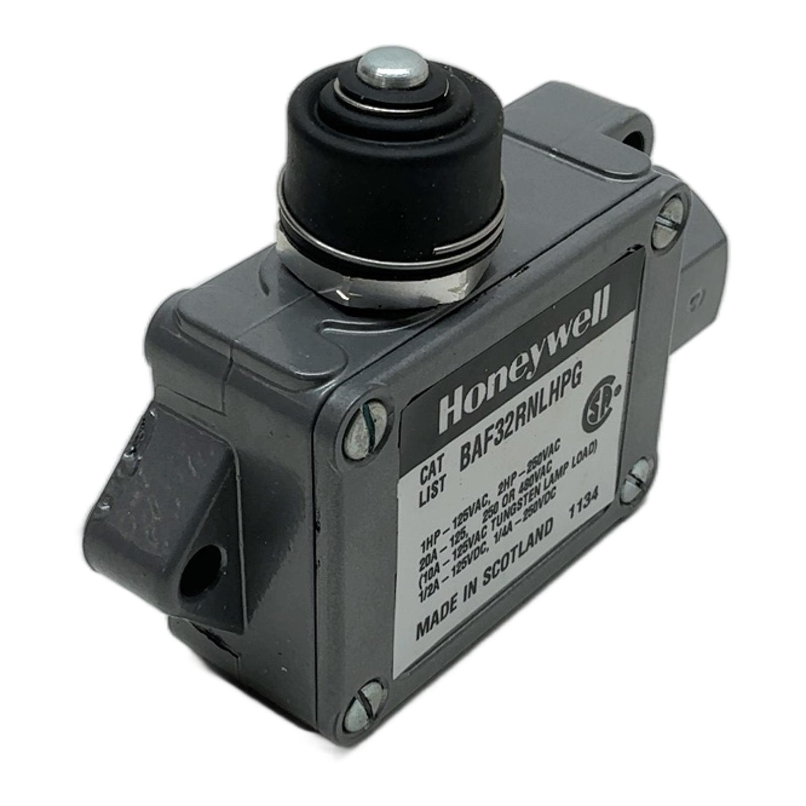 Honeywell BAF3-2RN-LHPG Limit Switch Description The Honeywell BAF3-2RN-LHPG is a high-quality enclosed limit switch from the MICRO SWITCH BAF series, known for its reliability and durability in industrial environments. It features a top pin plunger actuator and is housed in a rugged die-cast enclosure, providing protection against harsh conditions. This switch is ideal for applications requiring precise position detection on industrial machinery. Specifications Manufacturer: Honeywell Type Number: BAF3-2RN-LHPG Actuator Type: Top Pin Plunger Contact Configuration: SPDT (Single Pole, Double Throw) Current Rating: 20A Voltage Rating: 125/250/480 VAC; 125/250 VDC Conduit Entry: 1/2 in – 14NPT Housing Material: Die-cast Zinc Label Info CAT LIST: BAF32RNLHPG 1HP – 125VAC, 2HP – 250VAC 20A – 125, 250 OR 480VAC 10A – 125VAC TUNGSTEN LAMP LOAD 1/2A – 125VDC, 1/4A – 250VDC Application This limit switch is commonly used in machine tools, conveyors, material handling equipment, and various automated systems for end-of-travel sensing, presence/absence detection, and machine control. Country of Origin Made in Scotland, United Kingdom. CO2 Impact By purchasing this pre-owned component, you are helping to avoid the production of a new one, which saves approximately 10.0 kg of CO2. This is comparable to the emissions from driving a car for 50 kilometers. Availability This item is in stock and ready for immediate dispatch. Order now from profideals for expert support and fast delivery. FAQ What does the ‘SPDT’ circuitry mean for wiring this switch? SPDT stands for Single Pole, Double Throw. This means the switch has three terminals: a common (C), a normally open (NO), and a normally closed (NC). In its resting state, the circuit is complete between C and NC. When the actuator is pressed, the connection to NC breaks, and a new connection is made between C and NO. This allows you to control two different circuits with one switch action. Is the actuator on the BAF3-2RN-LHPG adjustable or replaceable? The top pin plunger on this specific model is typically not adjustable in length. However, the BAF series is modular. Different actuator heads (e.g., roller levers, wobbles) can often be installed on the same switch body, but you should always consult the datasheet to ensure compatibility. What is the IP rating of this limit switch, and what kind of environments is it suitable for? The Honeywell BAF series switches are typically rated for NEMA 1, 3, 4, and 13. This corresponds to an IP rating of approximately IP65/IP66. This makes it dust-tight and protected against water jets, making it suitable for general industrial environments, machine tools, and areas where it might be exposed to oil, coolants, and non-corrosive liquids. profideals is not an authorized distributor, reseller or representative of the products featured on this website. All product names, trademarks, brands and logos used on this site are the property of their respective owners. Last Update: March 13, 2026