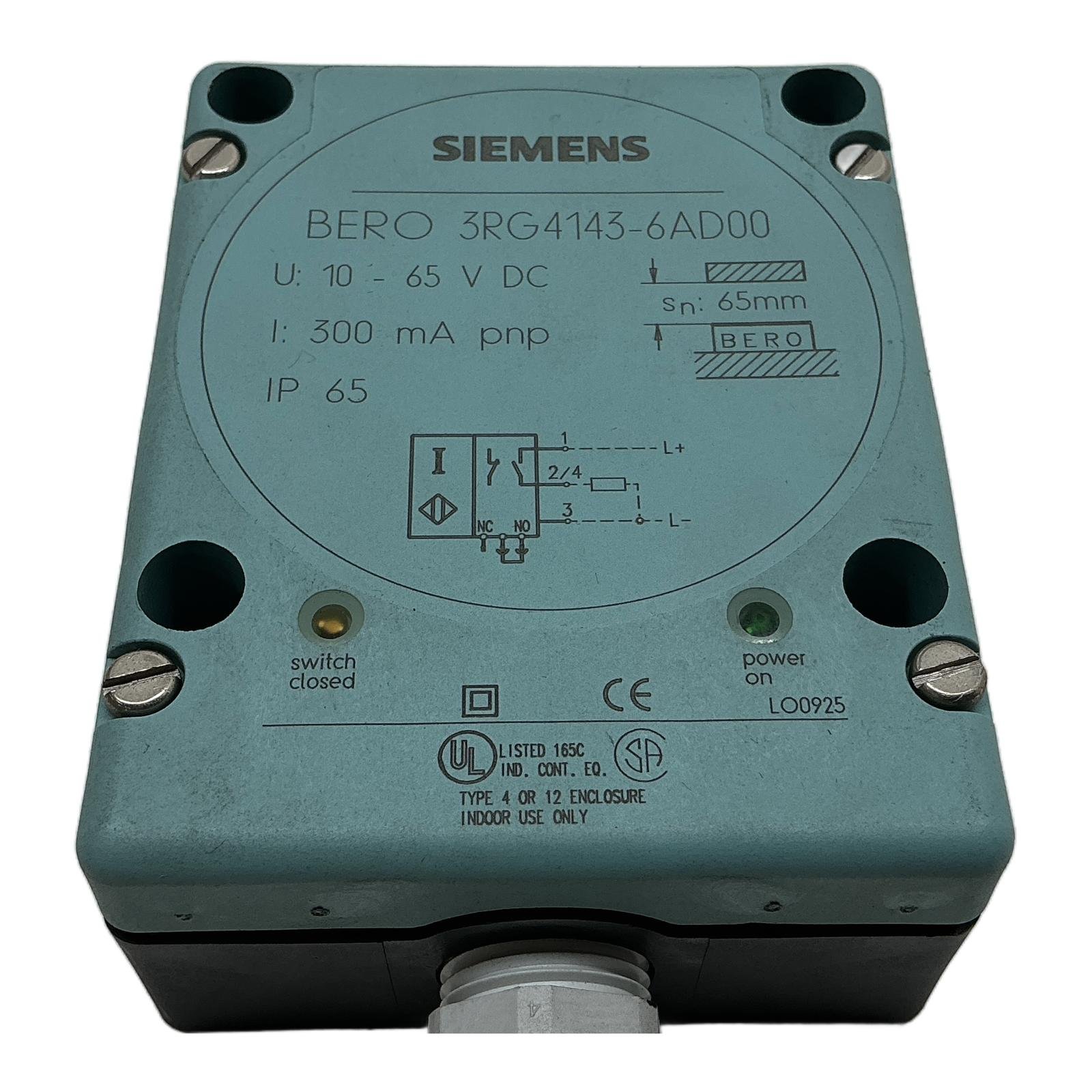 <h2>Siemens BERO 3RG4143-6AD00 Inductive Proximity Switch</h2> <h3>Description</h3> <p>The Siemens BERO 3RG4143-6AD00 is a robust inductive proximity switch designed for non-contact detection of metallic objects. It features a large sensing distance of 65mm and operates within a wide voltage range of 10 to 65 V DC. Housed in a durable rectangular enclosure with an IP65 rating, this sensor is well-suited for various industrial automation applications, including conveyor systems, positioning tasks, and machine control. Its PNP output with a changeover contact (NO/NC) provides flexible integration options.</p> <h3>Specifications</h3> <ul> <li>Manufacturer: Siemens</li> <li>Product Series: BERO</li> <li>Part Number: 3RG4143-6AD00</li> <li>Type: Inductive Proximity Switch</li> <li>Sensing Distance (Sn): 65 mm</li> <li>Operating Voltage: 10 – 65 V DC</li> <li>Output Type: PNP</li> <li>Switching Current: 300 mA</li> <li>Switching Function: Normally Open (NO) / Normally Closed (NC) Changeover</li> <li>Protection Class: IP65</li> <li>Housing Material: Plastic</li> </ul> <h3>Label Info</h3> <ul> <li>U: 10 – 65 V DC</li> <li>I: 300 mA pnp</li> <li>Sn: 65mm</li> <li>IP 65</li> </ul> <h3>Application</h3> <p>This sensor is ideal for use in factory automation, logistics, material handling, and manufacturing machinery where reliable detection of metal parts from a distance is required. Common applications include position sensing on conveyor belts, detecting the presence of machine parts, and controlling automated processes.</p> <h3>Country of Origin</h3> <p>Germany</p> <h3>CO2 Impact</h3> <p>By purchasing this pre-owned sensor, you help avoid the emission of approximately 18 kg of CO2. This saving is comparable to the emissions from driving a car for 90 kilometers or charging a smartphone 2160 times. Choosing refurbished components is a smart decision for both your budget and the environment.</p> <h3>Availability</h3> <p>This is an obsolete item, no longer in production by Siemens. Availability is limited to existing stock. The direct successor recommended by the manufacturer is the Siemens 3RG4143-6CD00.</p> <h3>FAQ</h3> <strong>What is the difference between a PNP and NPN output on a sensor?</strong><br><p>A PNP (Positive-Negative-Positive) sensor sources current, meaning it provides a positive voltage output when activated. An NPN (Negative-Positive-Negative) sensor sinks current, meaning it provides a path to ground (negative) when activated. The choice between PNP and NPN depends on the input requirements of your PLC or control device, with PNP being more common in Europe.</p> <strong>What does “non-flush mountable” mean for this sensor?</strong><br><p>Non-flush mountable means that the sensor’s active face must protrude from the surrounding metal mounting surface. A metal-free zone must be maintained around the sensing head to prevent interference with the inductive field, which could reduce the sensing distance or cause false triggering. This design allows for a larger sensing range compared to a flush-mountable version of the same size.</p> <strong>Can this DC sensor be protected against reverse polarity?</strong><br><p>Yes, most modern industrial DC sensors from reputable manufacturers like Siemens, including the BERO series, have built-in reverse polarity protection. This prevents damage to the sensor’s internal electronics if the positive and negative supply wires are accidentally swapped during installation.</p> <p>Order now from profideals for expert support and fast delivery.</p> <p>Last Update: Friday, March 13, 2026</p> <p><em>profideals is not an authorized distributor, reseller or representative of the products featured on this website. All product names, trademarks, brands and logos used on this site are the property of their respective owners. The depiction, description or sale of products featuring these names, trademarks, brands and logos is for identification purposes only and is not intended to indicate any affiliation with or authorization by any rights holder.</em></p>