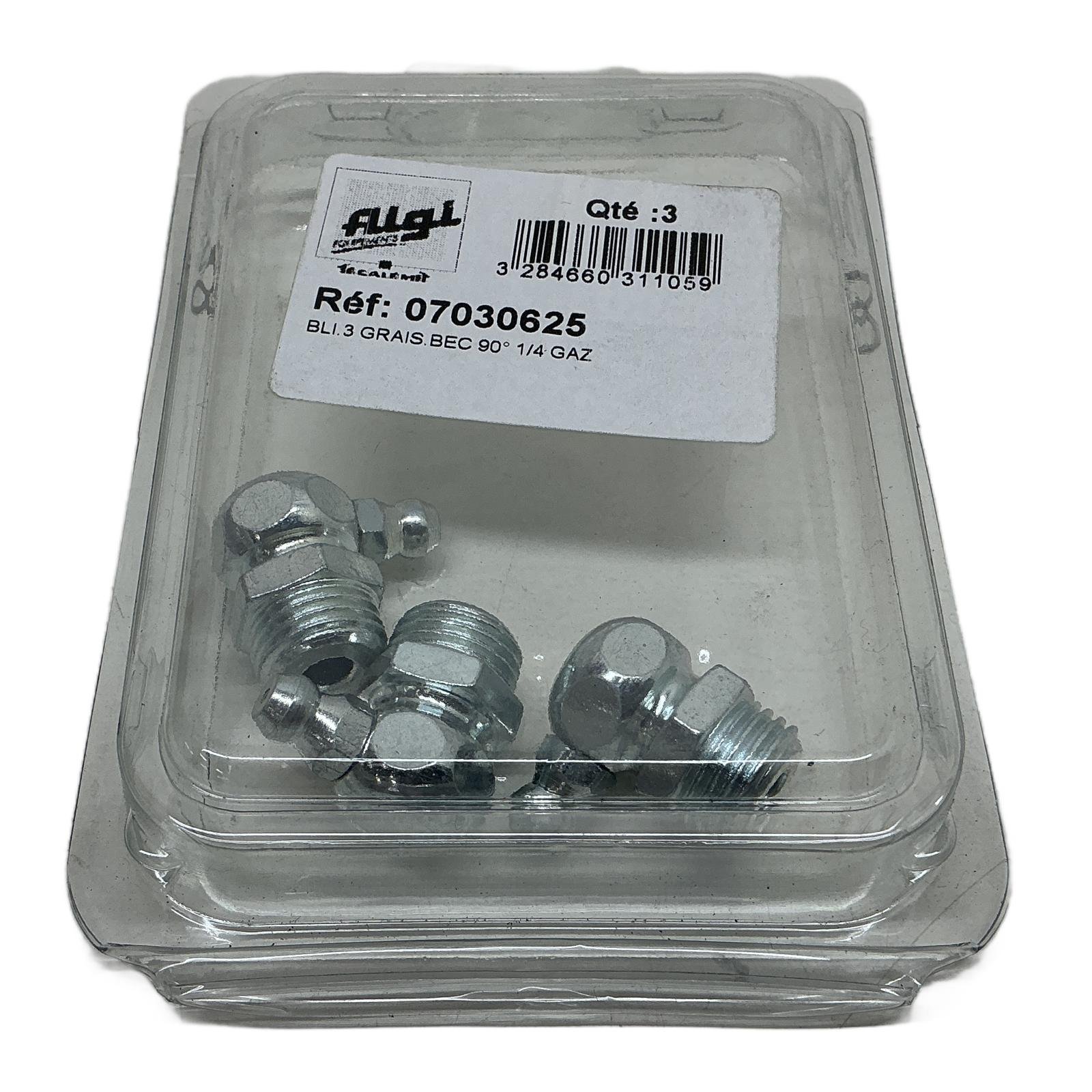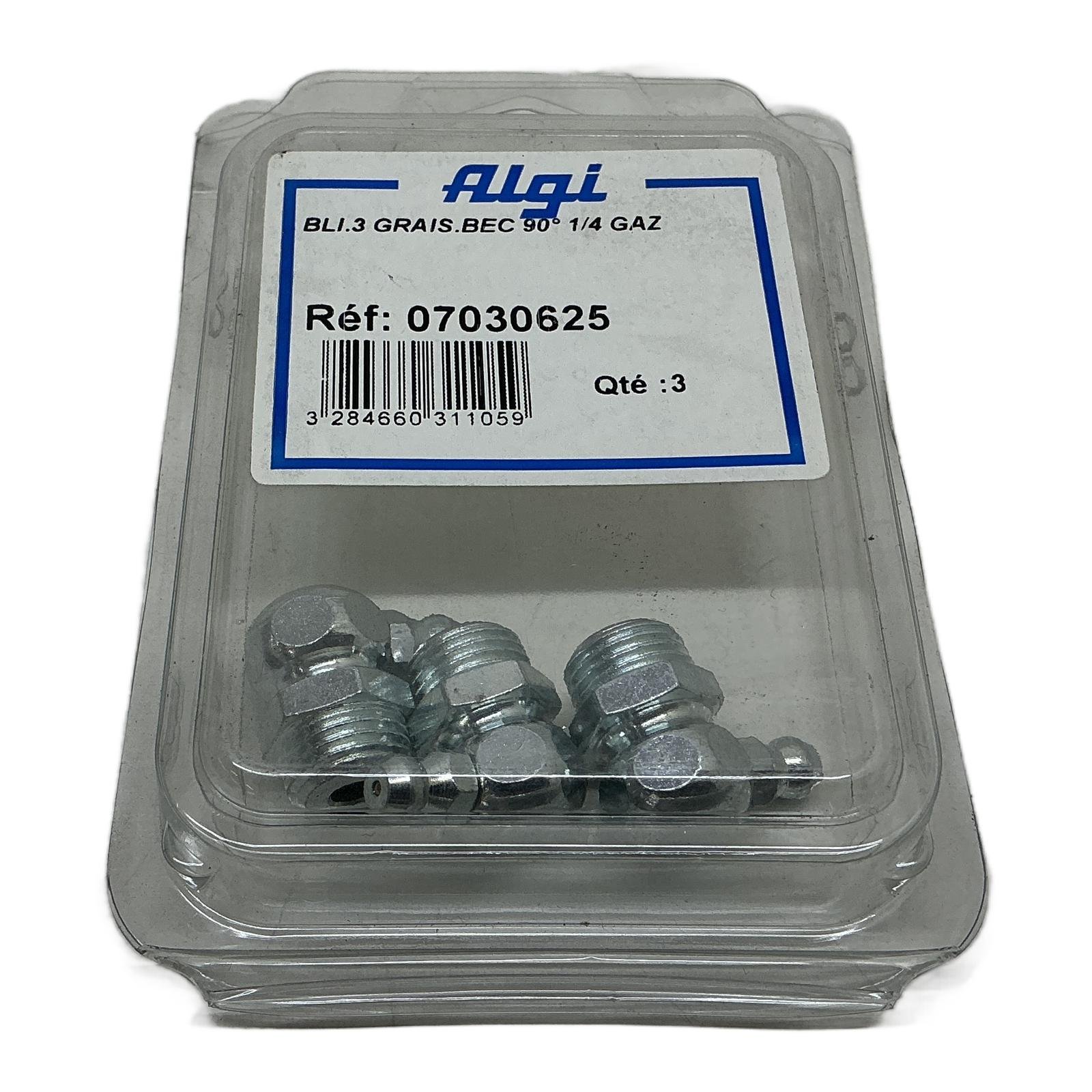 Algi Pack of 3 Angled Grease Nipples, 1/4 inch BSP Description This is an original Algi pack containing three 90-degree angled grease nipples, reference number 07030625. These high-quality fittings are designed for applying lubricant to mechanical parts and are essential for routine maintenance. The 1/4 inch BSP (Gaz) thread is a common standard in many industrial and automotive applications. The 90-degree angle allows for easy access to lubrication points in tight or hard-to-reach spaces. Specifications Manufacturer: Algi Part Number: 07030625 Product Type: Grease Nipple Angle: 90 degrees Thread Size: 1/4 inch BSP (Gaz) Material: Steel (Zinc Plated) Quantity: 3 nipples per pack Label Info Description: BLI.3 GRAIS.BEC 90 1/4 GAZ Reference (Ref): 07030625 EAN: 3284660311059 Application Ideal for use in agricultural machinery, construction equipment, automotive chassis, and general industrial machinery where periodic greasing is required to ensure longevity and proper function of moving parts. Country of Origin Manufactured in France. CO2 Impact By purchasing this existing part, you avoid the production of a new one, saving an estimated 0.1 kg of CO2. This is equivalent to the energy needed to fully charge a smartphone 12 times. Availability This item is in stock and ready for immediate dispatch. Condition is new in original sealed packaging. Order now from profideals for expert support and fast delivery. FAQ Question?What does the ‘1/4 GAZ’ thread designation mean?’GAZ’ is a common European term for BSP (British Standard Pipe) threads. A ‘1/4 GAZ’ or ‘1/4 BSP’ thread has a nominal outer diameter of approximately 13.16 mm. Question?What is the material and finish of these nipples?These grease nipples are typically made from steel for strength and durability, and are zinc-plated to provide corrosion resistance. Question?Are these compatible with standard hydraulic grease gun couplers?Yes, the head of these nipples is designed to conform to international standards (like DIN), ensuring a secure connection with most standard hydraulic jaw-type grease gun couplers. profideals is not an authorized distributor, reseller or representative of the products featured on this website. All product names, trademarks, brands and logos used on this site are the property of their respective owners. Last Update: Friday, March 13, 2026