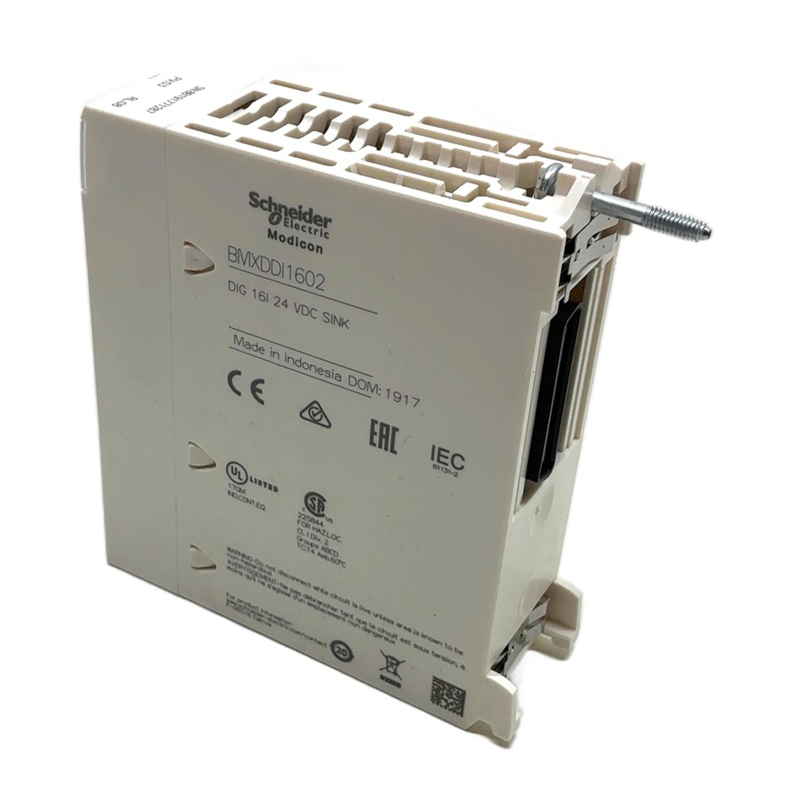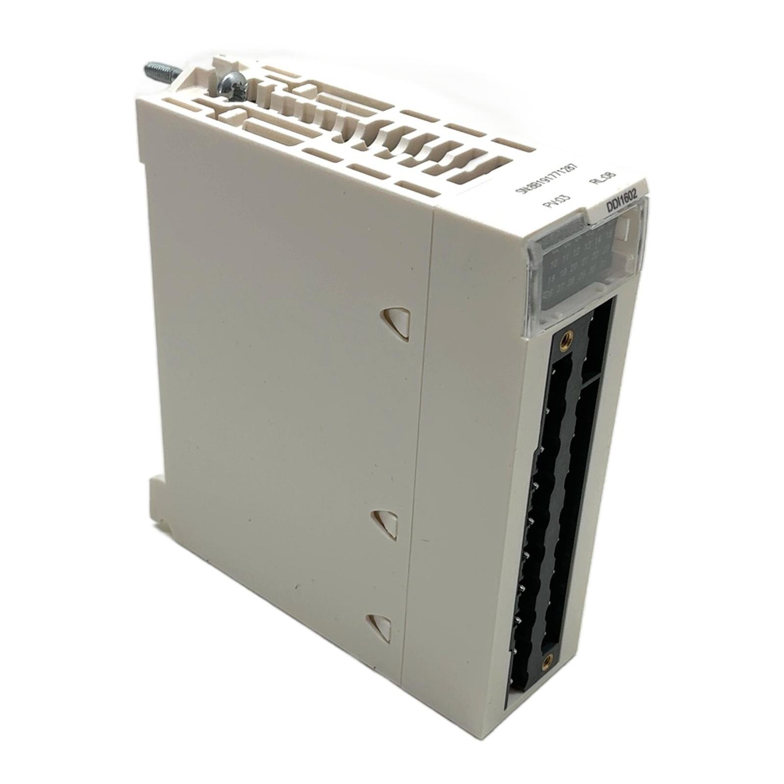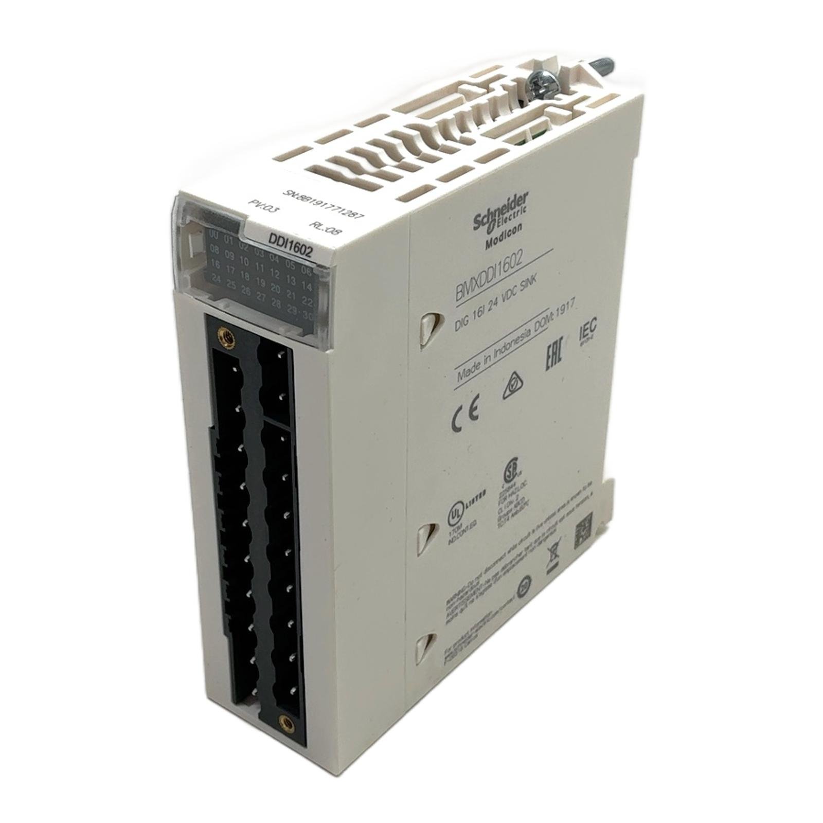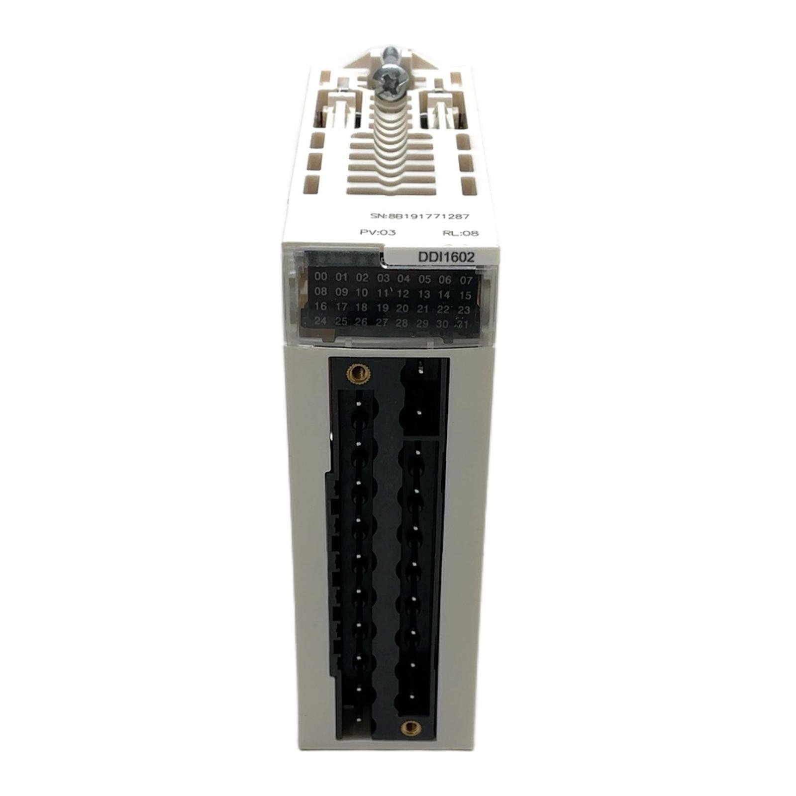 Schneider Electric Modicon M340/M580 Digital Input Module Description The BMXDDI1602 is a high-density discrete DC input module for the Schneider Electric Modicon M340 and M580 automation platforms. It provides 16 sinking logic inputs, making it ideal for connecting sensors, switches, and other 24V DC field devices to your control system. Its compact design and robust construction ensure reliable performance in demanding industrial environments. Specifications Manufacturer: Schneider Electric Product Line: Modicon M340 / M580 Model Number: BMXDDI1602 Product Type: Digital Input Module Number of Inputs: 16 Input Logic: Sink (Positive Logic) Input Voltage: 24V DC Input Current: 2.5 mA Connector Type: 20-way connector Label Info PV: 03 RL: 08 SN: 8B191771287 DOM: 1917 (Week 17, 2019) Application This module is widely used in various automation applications, including manufacturing, process control, material handling, and building automation, where a high number of digital signals need to be monitored. Country of Origin Made in Indonesia. CO2 Impact Opting for a refurbished BMXDDI1602 module prevents the emission of approximately 6.0 kg of CO2 compared to manufacturing a new one. This choice supports sustainable industrial practices. Availability This item is in stock and ready for immediate dispatch. Order now from profideals for expert support and fast delivery. FAQ What PLC platforms is the BMXDDI1602 compatible with?This module is designed for use with the Schneider Electric Modicon M340 and Modicon M580 PLC systems. What is the difference between a ‘sink’ and ‘source’ input module?A sinking (sink) input module, like the BMXDDI1602, provides a path to ground (0V). The connected field device must supply the positive voltage (24V). In contrast, a sourcing module supplies the positive voltage, and the field device completes the circuit to ground. Does this module require a separate terminal block for wiring?No, the BMXDDI1602 features an integrated 20-way connector on its front face for direct wiring, simplifying installation and reducing panel space. Last Update: March 13, 2026 profideals is not an authorized distributor, reseller or representative of the products featured on this website. All product names, trademarks, brands and logos used on this site are the property of their respective owners.