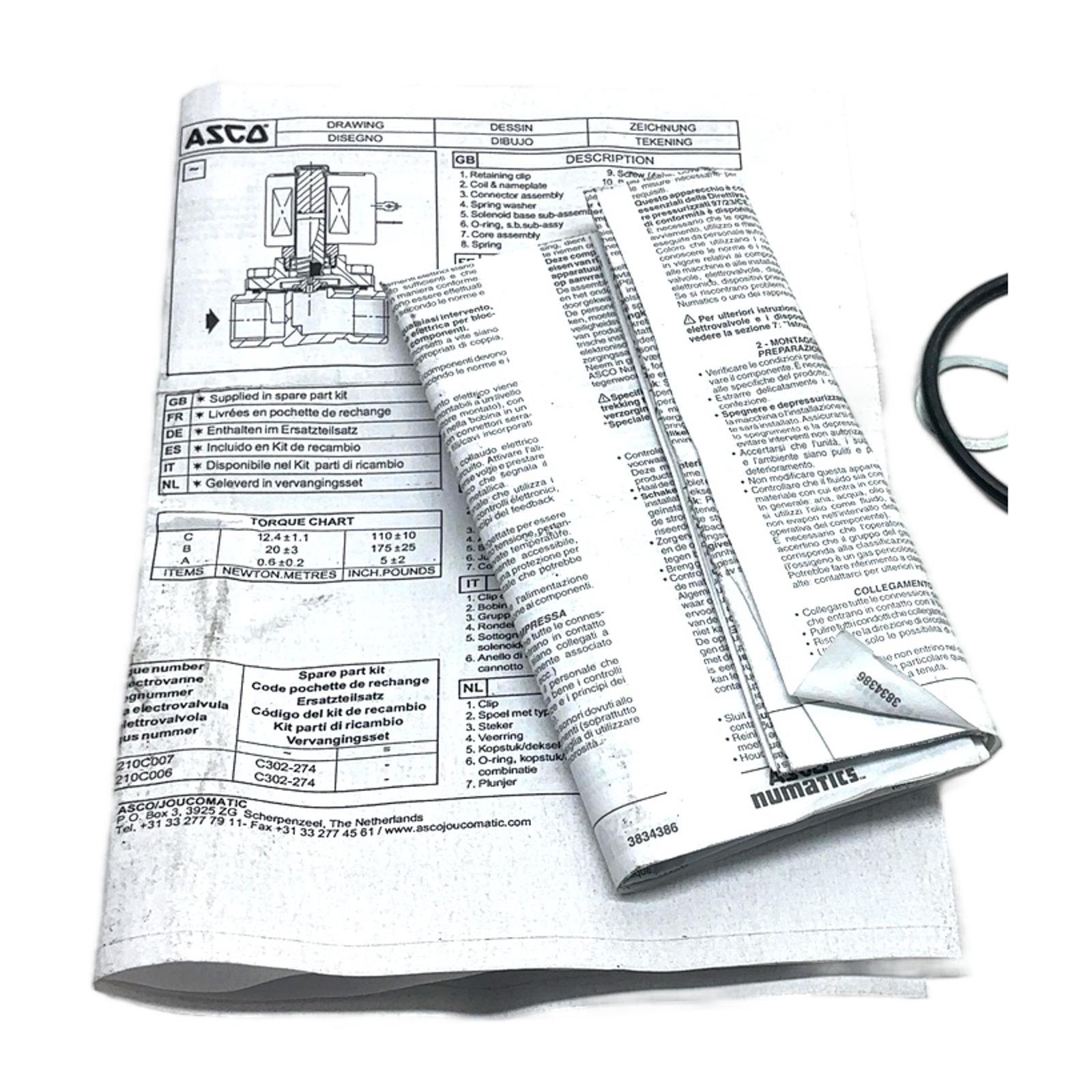 ASCO Solenoid Valve Repair Kit C302274 Description This is a genuine ASCO spare part kit, part number C302274, designed for the maintenance and repair of ASCO solenoid valves. This kit contains all the essential wear parts, including the diaphragm, spring, plunger, and seals, to restore your valve to its original operating specifications. It is a cost-effective solution for extending the life of your equipment and ensuring reliable performance in critical applications. Specifications Manufacturer: ASCO Part Number: C302274 Alternate Part Number: MO389502001 Product Type: Solenoid Valve Repair Kit Compatibility: Primarily for ASCO 8210 and 8222 series valves Kit Contents: Diaphragm/valve assembly, spring, plunger, O-rings, clip, washer Label Info Brand: ASCO Model: C302274 Material No: MO389502001 Application This repair kit is used for routine maintenance or repair of solenoid valves in various industries, including process automation, fluid control, and industrial machinery. It addresses common issues such as leaking seals or faulty valve operation, preventing costly downtime. Country of Origin This ASCO product is manufactured in the Netherlands. CO2 Impact By using this reconditioned spare part instead of a new one, you contribute to a more sustainable future by avoiding the emission of 0.5 kg of CO2. This saving is equivalent to the energy needed to fully charge a modern smartphone 60 times. Availability This item is in stock and ready for immediate dispatch. Order now from profideals for expert support and fast delivery. FAQ What materials are the diaphragm and O-rings made from in this C302274 kit? While the standard kit typically uses NBR (Nitrile) for general-purpose applications with air, inert gas, and water, it’s crucial to verify compatibility with your specific media. For aggressive chemicals or higher temperatures, alternative kits with FKM (Viton) or EPDM seals might be required. Is this kit compatible with both AC and DC versions of the ASCO 8210 series valves? Yes, the internal mechanical parts like the diaphragm, spring, and O-rings in this kit are generally compatible with both AC and DC-powered versions of the specified valve series. The electrical characteristics are determined by the solenoid coil, which is a separate component not included in this rebuild kit. What is the most common cause of failure that necessitates using this repair kit? The most frequent reason for a valve rebuild is diaphragm failure. Over time, the flexible diaphragm material can become brittle, crack, or deform due to age, chemical exposure, or continuous cycling. This leads to internal or external leaks, and the valve failing to open or close properly. This kit directly addresses that wear item. profideals is not an authorized distributor, reseller or representative of the products featured on this website. All product names, trademarks, brands and logos used on this site are the property of their respective owners. Last Update: March 13, 2026