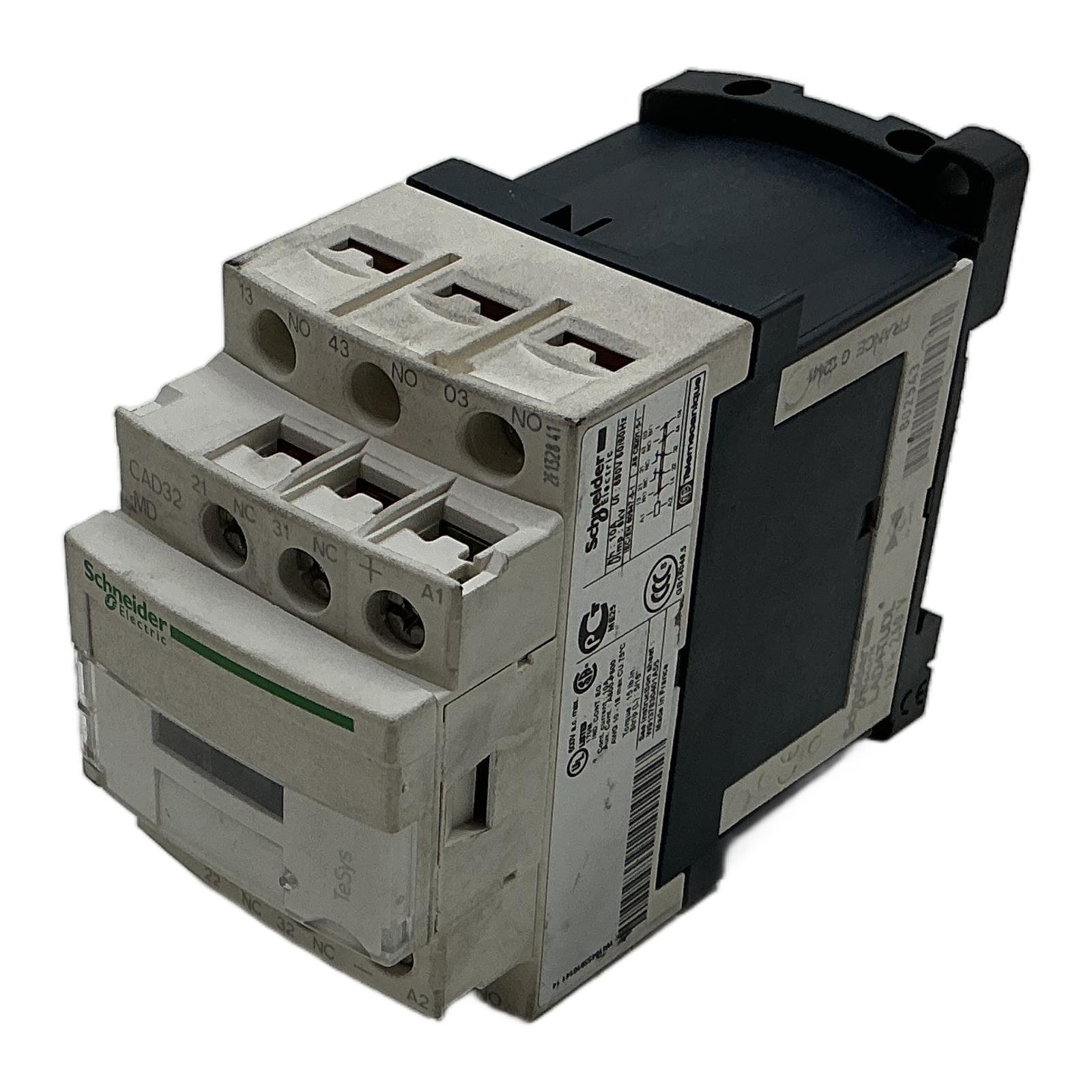 Schneider Electric TeSys D Control Relay Description The CAD32MD is a high-performance control relay from the Schneider Electric TeSys D series, engineered for demanding industrial automation and control systems. It provides reliable switching for control circuits, ensuring high machine availability. This model operates on a 220V DC coil and offers a flexible contact arrangement. Specifications Manufacturer: Schneider Electric Product Line: TeSys D Model: CAD32MD Coil Voltage: 220V DC Contact Configuration: 3 Normally Open (NO) + 2 Normally Closed (NC) Rated Operational Current (Ie): 10 A at