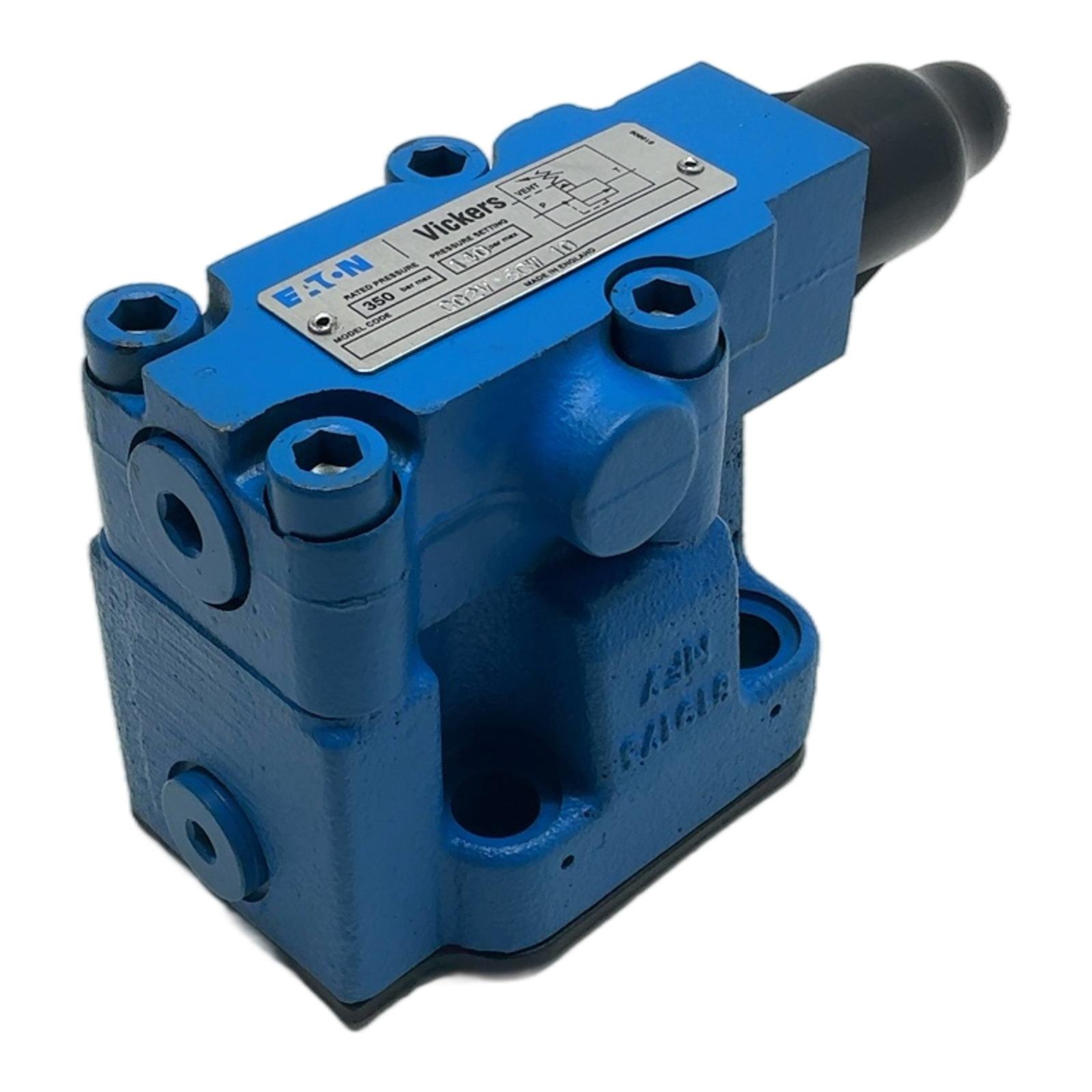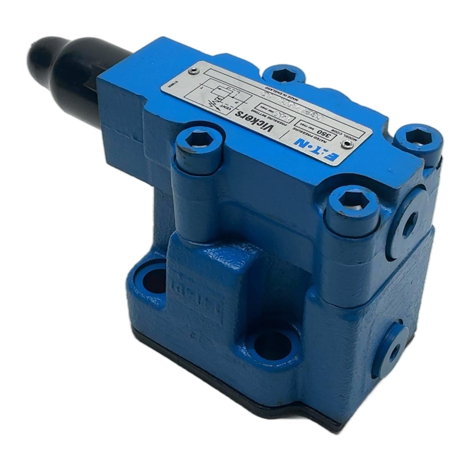 Eaton Vickers CG2V 6CW 10 Pressure Relief Valve Description The Eaton Vickers CG2V 6CW 10 is a high-performance, pilot-operated pressure relief valve. It is designed to limit pressure in hydraulic circuits, providing essential protection for system components. With a robust cast iron body and precision internal parts, this valve offers reliable and stable pressure control. Its standard NG6 (CETOP 3 / D03) subplate mounting interface allows for easy integration into new and existing hydraulic systems. Specifications Manufacturer: Eaton Vickers Model: CG2V 6CW 10 Type: Pilot-Operated Pressure Relief Valve Mounting Standard: NG6 / CETOP 3 / D03 Maximum Rated Pressure: 350 bar (5000 psi) Control Type: Manual Adjustment (under cap) Label Info Brand: EATON Vickers Model Code: CG2V 6CW 10 Rated Pressure: 350 bar max Application This valve is suitable for a wide range of industrial hydraulic applications, including machine tools, presses, injection molding machines, and material handling equipment, where precise and reliable pressure limitation is critical for safe operation. Country of Origin Made in England. CO2 Impact By purchasing this pre-owned component, you are contributing to a circular economy and helping to prevent 4.4 kg of CO2 emissions. This saving is comparable to the emissions from driving a standard passenger car for 22 kilometers. Availability This item is in stock and ready for immediate dispatch. Order now from profideals for expert support and fast delivery. FAQ What is the mounting interface for the CG2V 6CW 10 valve?This valve conforms to the NG6 (also known as CETOP 3 or D03) mounting standard, ensuring interchangeability with other valves of the same size and standard. How is the pressure setting adjusted on this valve?The pressure setting is adjusted via a screw mechanism located under the protective black cap. Always consult the official Eaton technical datasheet for the correct adjustment procedure and pressure range for the ‘CW’ model. What type of hydraulic fluid is compatible with this valve?Eaton Vickers CG2V series valves are generally compatible with standard mineral oil-based hydraulic fluids (HL, HLP). For use with synthetic fluids or water-glycols, it is crucial to verify the seal material compatibility in the product’s technical datasheet to prevent leakage or damage. Last Update: Friday, March 13, 2026 profideals is not an authorized distributor, reseller or representative of the products featured on this website. All product names, trademarks, brands and logos used on this site are the property of their respective owners.