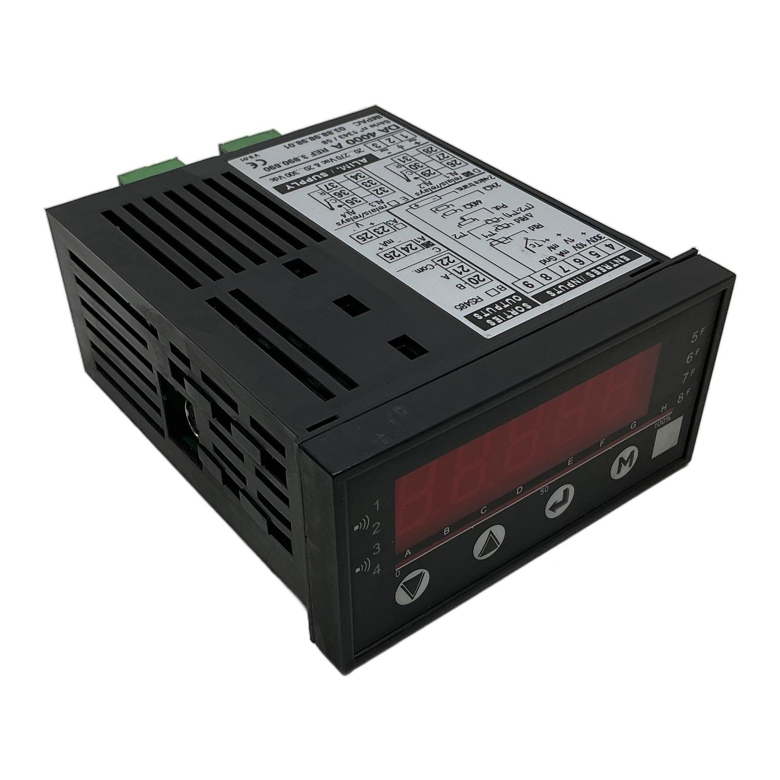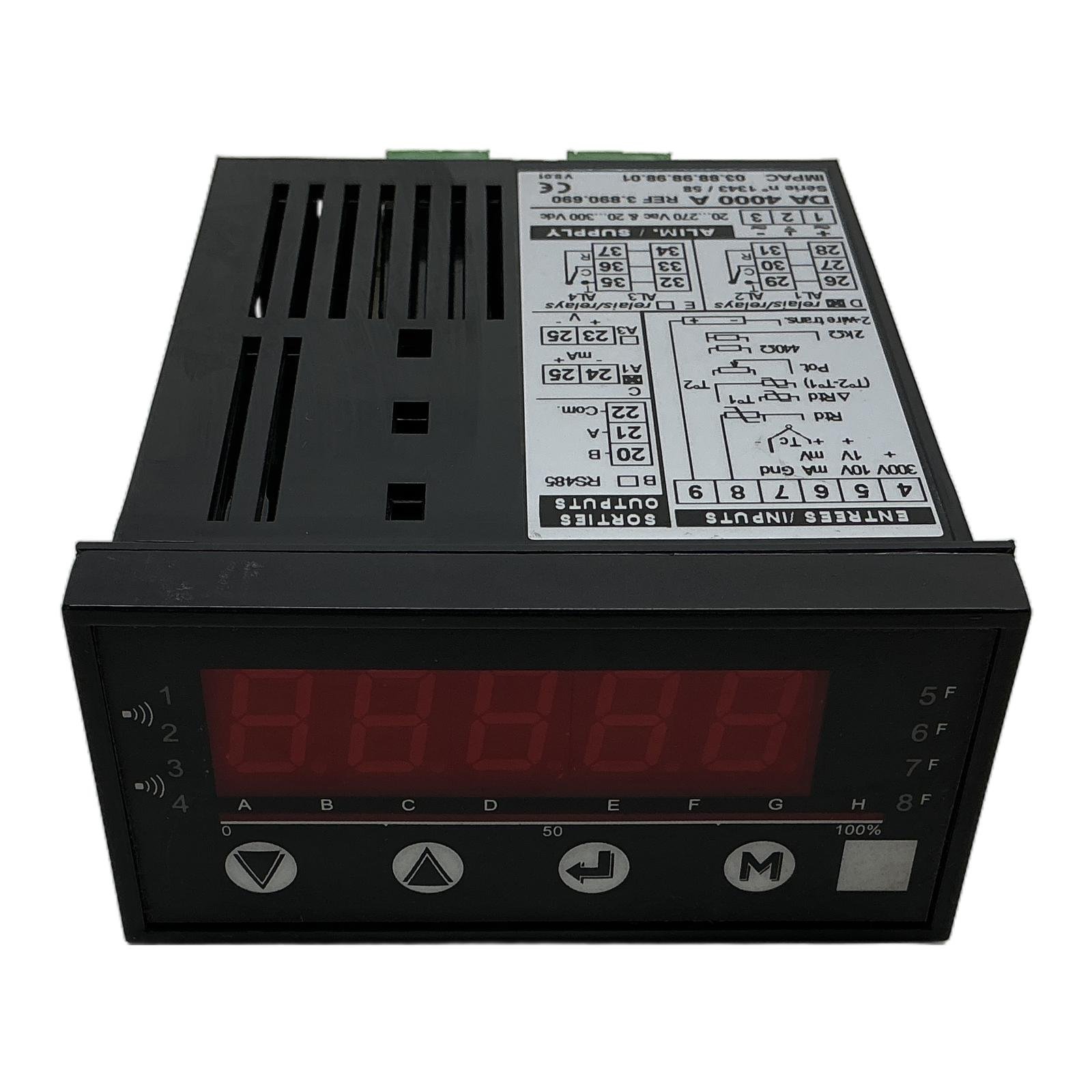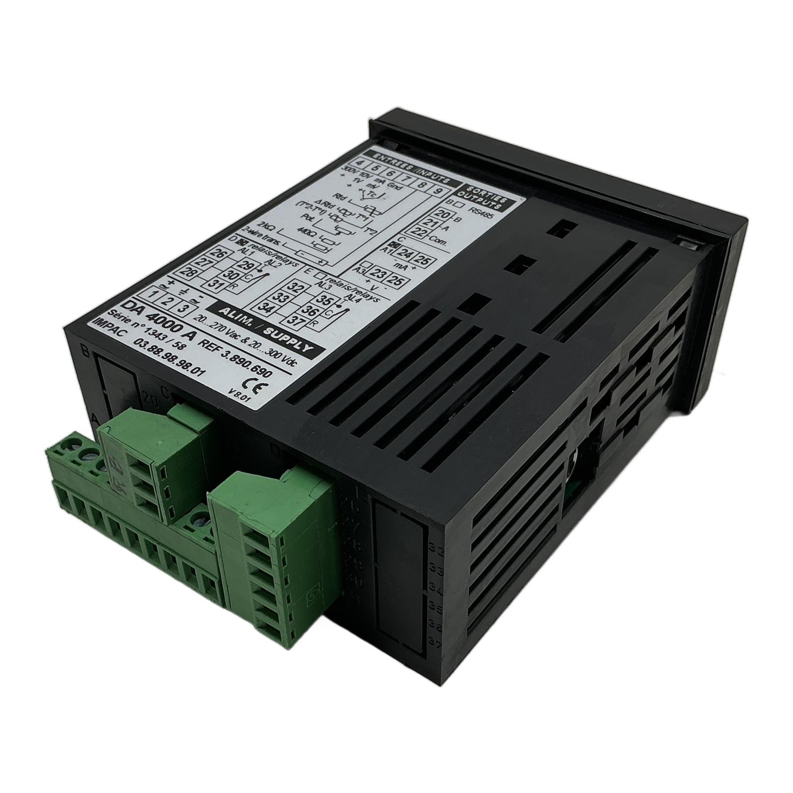 IMPAC DA 4000 A Universal Digital Process Indicator Description The IMPAC DA 4000 A is a high-performance, panel-mount universal digital indicator, engineered for precision and versatility in industrial process monitoring. Its wide-range power supply and universal input capabilities allow it to interface with a vast array of sensors, including thermocouples, RTDs, and transmitters with voltage or current outputs. Equipped with configurable relay outputs and RS485 communication, this device is ideal for integration into control systems for alarming and data logging. Order now from profideals for expert support and fast delivery. Specifications Model: DA 4000 A Reference Number: 3.890.690 Power Supply: 20 to 270 V AC & 20 to 300 V DC Inputs: Universal (mV, V, mA, Thermocouple, RTD, Potentiometer) Outputs: 4x Relays, RS485, Analog (mA/V options) Display: 5-digit LED, red Mounting Type: Panel Mount Version: V 8.01 Label Info Manufacturer: IMPAC Serie n: 1343 / 58 Made in France Application This indicator is perfectly suited for applications in manufacturing, process control, and laboratory settings where accurate display and control of temperature, pressure, flow, or other process variables are critical. Country of Origin This product is manufactured in France. CO2 Impact By purchasing this pre-owned IMPAC indicator, you are actively contributing to a circular economy and reducing industrial waste. This choice prevents the emission of approximately 12.0 kg of CO2, which would have been generated during the production of a new unit. Availability This item is in stock and ready for immediate dispatch. FAQ What types of thermocouple inputs does the DA 4000 A support?The DA 4000 A is a universal indicator typically supporting common thermocouple types such as K, J, T, E, N, R, S, and B. Always refer to the specific device configuration or manual to confirm compatibility. How is the RS485 communication interface configured on this device?Configuration of the RS485 interface, including baud rate, parity, and device address, is done through the front panel programming menu. It allows the indicator to be integrated into a larger SCADA or PLC system using a protocol like Modbus RTU. Can the relay outputs be configured for different alarm types?Yes, the four relay outputs are fully programmable. They can be set up as high alarms, low alarms, window alarms (within a specific range), or for deviation alarms based on a setpoint, providing flexible control options. Last Update: Friday, March 13, 2026 profideals is not an authorized distributor, reseller or representative of the products featured on this website. All product names, trademarks, brands and logos used on this site are the property of their respective owners.