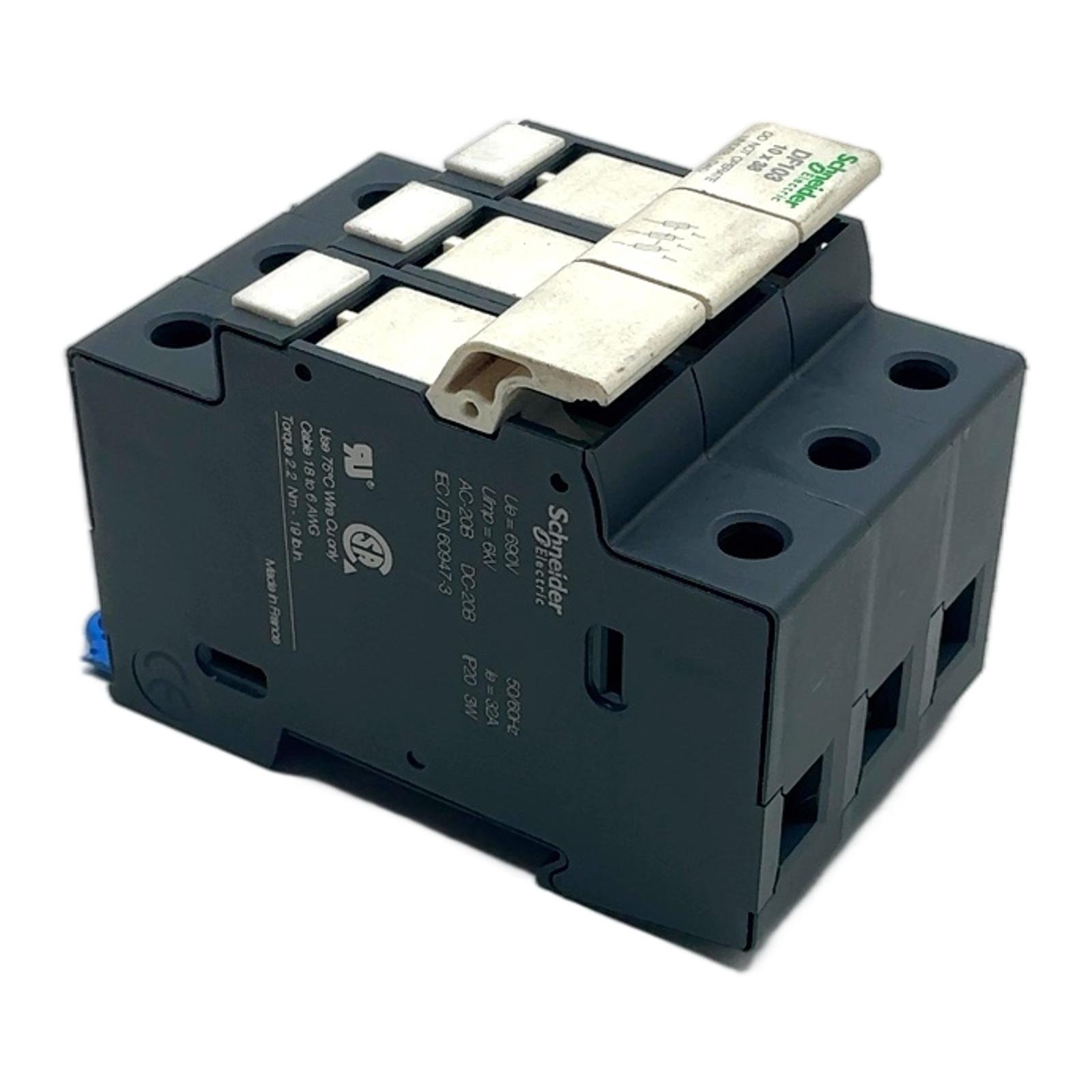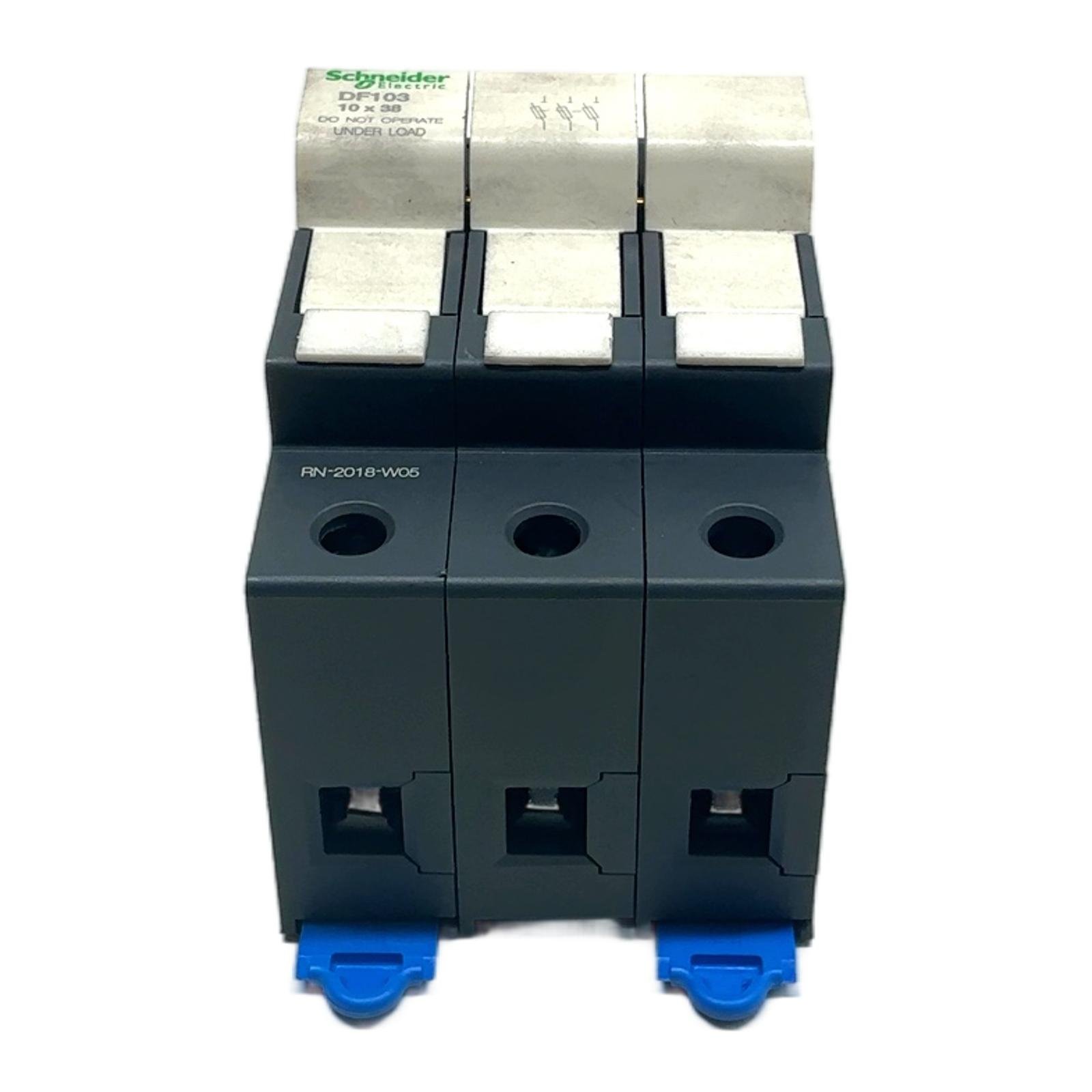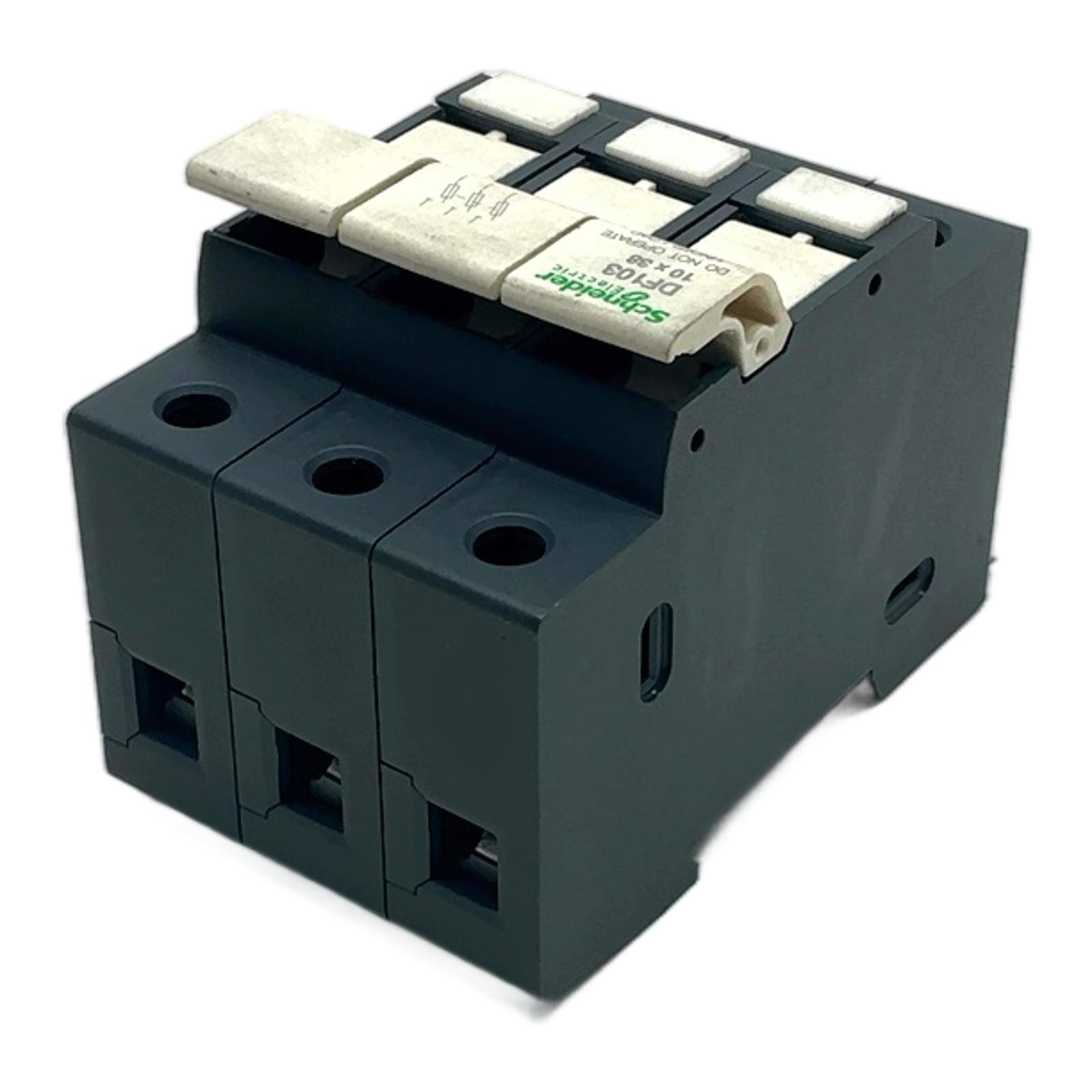 Schneider Electric TeSys DF103 Fuse Disconnector Description The Schneider Electric 18972, model DF103, is a high-performance 3-pole fuse disconnector from the TeSys range. It is engineered for reliable circuit protection in industrial control panels and machinery. This unit is rated for 32A and 690V AC, accommodating standard 10x38mm fuses. Its compact design and DIN rail mount capability make it an ideal choice for new installations and retrofits, ensuring compliance with IEC/EN 60947-3 standards. Specifications Manufacturer: Schneider Electric Model: DF103 Reference Number: 18972 Number of Poles: 3 Rated Operational Current (le): 32A Rated Operational Voltage (Ue): 690V AC, 50/60Hz Fuse Size: 10 x 38 mm Mounting: 35mm DIN Rail Protection Rating: IP20 Label Info Ue: 690V le: 32A Uimp: 6kV Standard: IEC/EN 60947-3 Application This fuse disconnector is commonly used for the protection of motor circuits, transformers, and other electrical loads in industrial automation, HVAC systems, and power distribution panels. Country of Origin Made in France. CO2 Impact Opting for this component helps avoid the emission of approximately 7.2 kg of CO2, contributing to a more sustainable industrial environment. Availability This item is in stock and ready for immediate dispatch. Order now from profideals for expert support and fast delivery. FAQ What type of fuses should be used with this DF103 holder?This holder is designed for cylindrical fuses of size 10x38mm. You should use fuses with an appropriate interrupting rating for your application, such as Class aM or gG types, up to a maximum of 32A. What is the short-circuit withstand rating of this device?The short-circuit withstand rating depends on the installed fuse. Always pair it with a fuse that has a breaking capacity suitable for the prospective short-circuit current at the point of installation, typically up to 100kA. Are there any considerations for operating this fuse holder at high ambient temperatures?Yes, like most electrical components, its current-carrying capacity may need to be derated at ambient temperatures above the manufacturer’s specified reference (usually 40 deg C). Refer to the Schneider Electric technical datasheet for specific derating curves. profideals is not an authorized distributor, reseller, or representative of the products featured on this website. All product names, trademarks, brands, and logos used on this site are the property of their respective owners. Laatst bijgewerkt: Friday, March 13, 2026