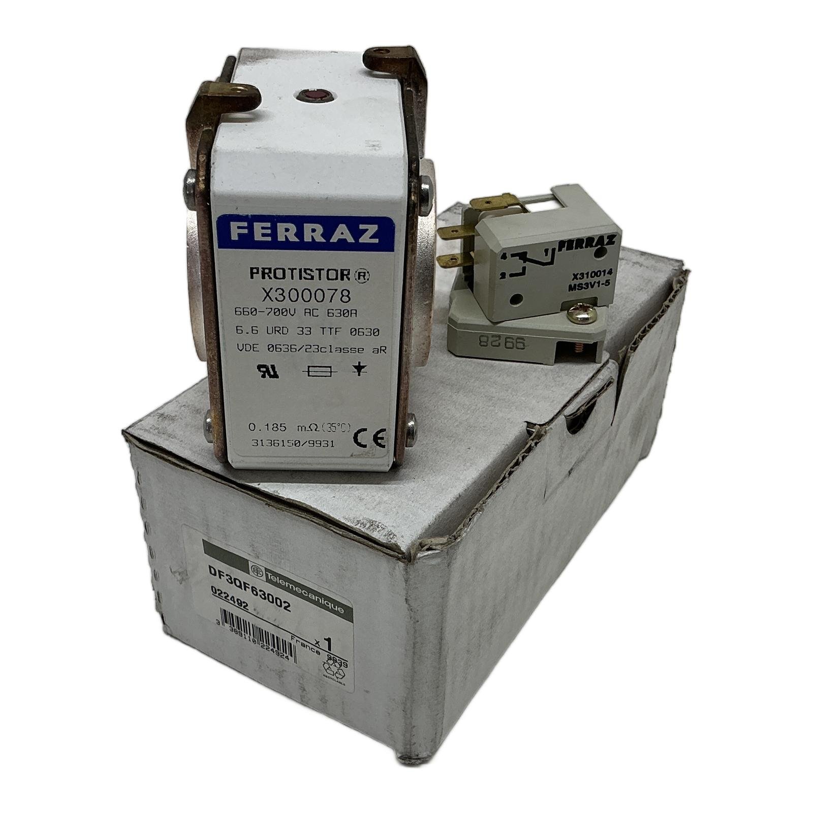 Product Details Description This is a Telemecanique DF3QF63002, a high-speed semiconductor fuse assembly. It features a genuine Ferraz Shawmut PROTISTOR fuse (model X300078) designed for superior protection of power electronics. These fuses are essential for safeguarding sensitive components like diodes, SCRs, and IGBTs from damaging short-circuits and overcurrents. This item is new old stock in its original packaging, providing reliable performance for critical applications. Specifications Manufacturer: Mersen (Ferraz Shawmut) Brand (Assembly): Telemecanique Part Number (Assembly): DF3QF63002 Part Number (Fuse): X300078 Current Rating: 63A Voltage Rating: 700V AC Type: High-Speed Semiconductor Fuse Series: PROTISTOR Label Info FERRAZ PROTISTOR X300078 66A-700V AC B38R 0.185 mOhm (at 20 deg C) Application Ideal for use in variable speed drives, power converters, rectifiers, and other power electronic equipment where fast-acting protection is critical. Country of Origin Made in France. CO2 Impact Reusing this industrial part saves an estimated 10.0 kg of CO2 compared to producing a new one. This saving is equivalent to the emissions from driving an average car for 50 kilometers. Availability In stock and ready for dispatch. Order now from profideals for expert support and fast delivery. FAQ Question?What does the ‘Protistor’ designation mean? Answer:’Protistor’ is Mersen’s (formerly Ferraz Shawmut) brand name for their line of high-speed, current-limiting fuses designed specifically for the protection of power semiconductors like diodes, thyristors, and IGBTs. They have a very low I2t value to clear faults quickly and prevent damage to sensitive electronic components. Question?Can I use a standard industrial fuse instead of this semiconductor fuse? Answer:No, it is highly inadvisable. Standard industrial fuses (like class gG or aM) are designed for motor or general circuit protection and do not have the speed or low I2t characteristics required to protect semiconductors. Using a standard fuse will likely result in the destruction of the electronic components it is supposed to protect during a fault event. Question?The assembly has a Telemecanique part number, but the fuse is Ferraz. Is this a compatible part? Answer:Yes, this is a common practice in the industry. Telemecanique (now part of Schneider Electric) often sourced high-quality specialized components like these Ferraz Protistor fuses and integrated them into their own systems, assigning their own part number (DF3QF63002) to the complete assembly, which may include the fuse and an indicator or microswitch. The core component is the Ferraz X300078 fuse. Last Update: Friday, March 13, 2026 profideals is not an authorized distributor, reseller or representative of the products featured on this website. All product names, trademarks, brands and logos used on this site are the property of their respective owners.