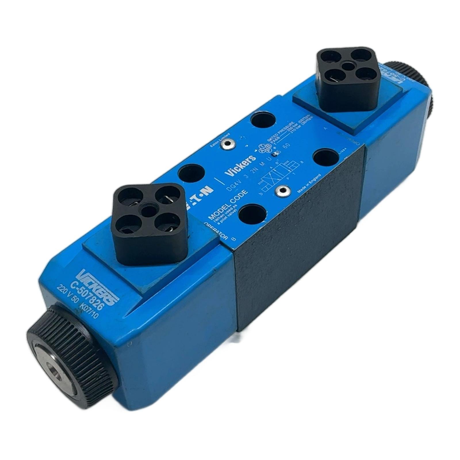 Eaton Vickers DG4V-3 Solenoid Operated Directional Valve Description This Eaton Vickers DG4V-3 is a high-quality, solenoid-operated directional control valve, designed for reliable performance in demanding industrial hydraulic systems. It features a robust NG6 (D03) interface for standard subplate mounting. With its double solenoid and spring-centered, all-ports-blocked configuration, it provides precise and safe control of hydraulic actuators. This valve is an industry-standard component known for its durability and long service life. Specifications Manufacturer: Eaton Vickers Model: DG4V-3-2N-M-U-C6-60 Type: 4-Way, 3-Position Directional Control Valve Actuation: Double Solenoid, Spring Centered Spool Type: 2N (All ports blocked in center position) Mounting Interface: NG6 / CETOP 3 / NFPA D03 Coil Voltage: 220V AC, 50 Hz Coil Part Number: C-507826 Maximum Pressure (Ports P, A, B): 350 bar / 5075 psi Maximum Pressure (Port T): 210 bar / 3045 psi Label Info Brand: EATON Vickers Model Code: DG4V 3 2N M U H5 60 Coil: VICKERS C-507826 220V 50 K07/10 Application This valve is ideally suited for a wide range of hydraulic applications, including machine tools, industrial power units, presses, injection molding machines, and mobile equipment requiring precise directional control. Country of Origin Made in England. CO2 Impact By choosing this pre-owned component, you are helping to avoid the emission of approximately 12.0 kg of CO2. This saving is equivalent to the emissions from driving a car for 60 kilometers. Availability This item is in stock and ready for immediate dispatch. Order now from profideals for expert support and fast delivery. FAQ What is the significance of the ‘2N’ spool type in the model code DG4V-3-2N-M-U-H5-60?The ‘2N’ designates a specific spool configuration. It is a 3-position, spring-centered valve where, in the neutral (center) position, all ports (P, T, A, and B) are blocked, preventing any fluid flow. Can I use a different voltage coil on this DG4V-3 valve body?Yes, the Eaton Vickers DG series valves are modular. The coils (part no. C-507826 for 220V AC) can be removed and replaced with other compatible coils of different voltages (e.g., 24V DC or 110V AC), provided they are designed for the DG4V-3 valve series. What is the maximum recommended hydraulic fluid cleanliness for this valve?For optimal performance and longevity of the DG4V-3 series, Eaton Vickers recommends using hydraulic fluid with a cleanliness level of at least ISO 4406 code 20/18/15. profideals is not an authorized distributor, reseller or representative of the products featured on this website. All product names, trademarks, brands and logos used on this site are the property of their respective owners. Last Update: Friday, March 13, 2026