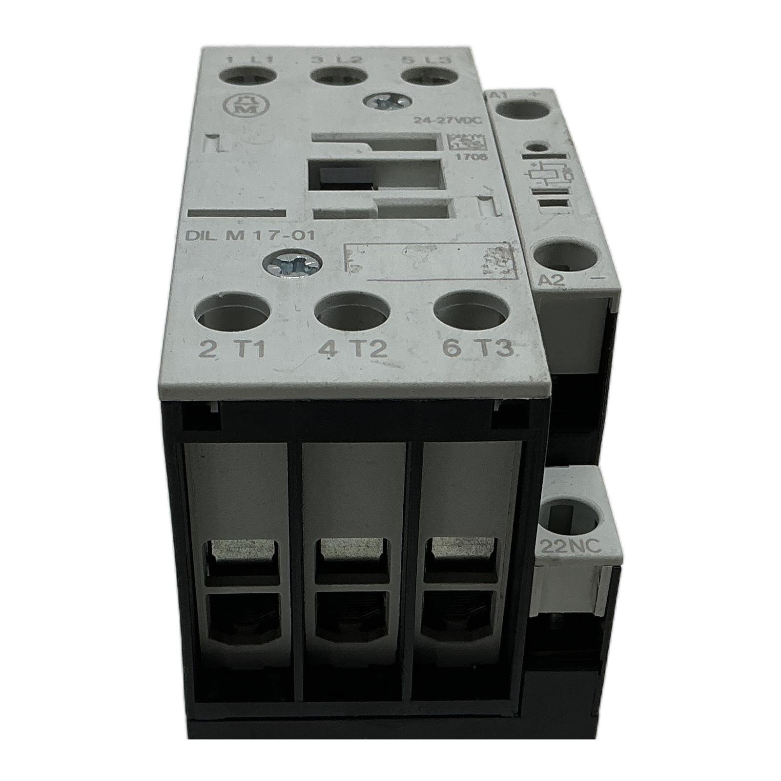 Moeller DIL M17-01 ContactorDescriptionThe Moeller DIL M17-01 is a high-performance 3-pole contactor designed for reliable switching of motors and other industrial loads. It operates with a 24-27VDC control coil and is rated for motor applications up to 7.5 kW at 400V (AC-3). As a component from the proven DIL M series, it offers durability and a compact design, making it suitable for a wide range of automation and control panel applications. This is an obsolete but reliable component for maintaining existing systems. Order now from profideals for expert support and fast delivery.SpecificationsManufacturer: MoellerType: DIL M17-01Family: DIL M(C)17Coil Voltage: 24-27 VDCNumber of Poles: 3Auxiliary Contacts: 1x Normally Closed (NC)Rated Power (AC-3, 400V): 7.5 kWRated Thermal Current (AC-1, Ith): 30 ACondition: Used, tested and functionalLabel InfoMoeller DIL M(C)17IEC/EN 60947Ui: 1000VUimp: 8000VAC-1 / Ith: 30AApplicationThis contactor is ideal for direct-on-line starting of electric motors, as well as for controlling heating elements, lighting, and other non-inductive or slightly inductive loads in industrial environments.Country of OriginGermanyCO2 ImpactBy purchasing this refurbished Moeller contactor, you are helping to prevent the emission of approximately 14 kg of CO2. This saving is equivalent to the CO2 absorbed by a mature tree in a full year or driving a standard passenger car for 70 kilometers.AvailabilityThis product is an obsolete item from Moeller, now part of Eaton. Availability is limited to existing stock. The direct modern replacement is the Eaton DILM17-01 series.FAQWhat is the modern equivalent for this Moeller DIL M17-01 contactor?The direct technical equivalent from the current manufacturer, Eaton, is the DILM17-01(24VDC), part number 101217. It offers the same performance characteristics and a similar form factor.Can I use this 24-27VDC coil with a standard 24VDC PLC output?Yes, absolutely. The 24-27VDC coil voltage range is specifically designed to ensure reliable operation with standard 24VDC power supplies and PLC transistor outputs, accommodating minor voltage fluctuations.What do the markings ’21NC’ and ’22NC’ on the auxiliary contact mean?These numbers identify the terminals for the built-in auxiliary contact. The ‘NC’ designation stands for ‘Normally Closed’, meaning the circuit between terminals 21 and 22 is closed when the contactor coil is de-energized and opens when the coil is energized.Last Update: Friday, March 13, 2026PLC2DAY is not an authorized distributor, reseller or representative of the products featured on this website. All product names, trademarks, brands and logos used on this site are the property of their respective owners.
