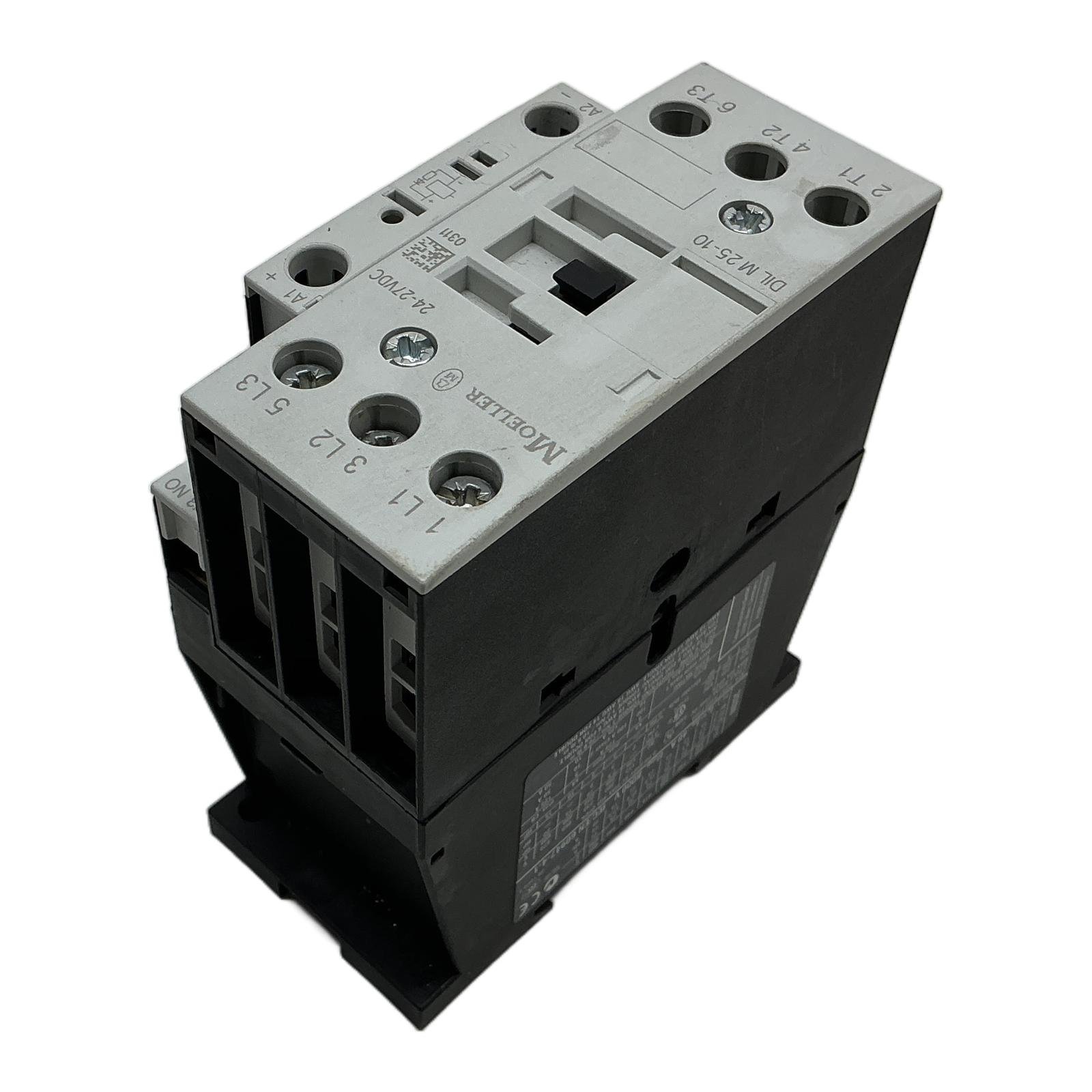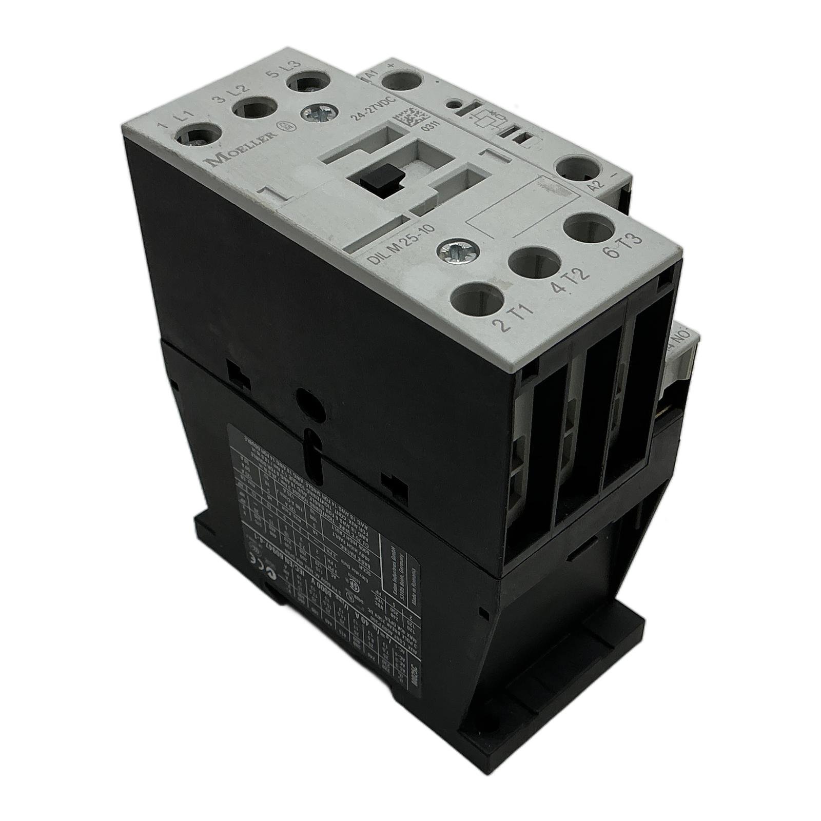 Eaton (Moeller) DILM25-10 3-Pole Contactor Description The Eaton DILM25-10 is a high-quality 3-pole contactor from the renowned Moeller series, designed for switching electrical motors and non-inductive loads. With a DC-operated coil voltage of 24V, it offers reliable performance in a compact design. It is built to meet international standards such as IEC/EN 60947, ensuring safety and durability in various industrial automation and control systems. Specifications Manufacturer: Eaton (Moeller) Model: DILM25-10 Part Number: 277129 Coil Voltage: 24-27V DC Number of Poles: 3 Utilization Category AC-3 (400V): 11 kW / 25 A Conventional Free Air Thermal Current (AC-1): 40 A Integrated Auxiliary Contacts: 1 Normally Open (NO) Rated Impulse Withstand Voltage (Uimp): 8000 V Connection Type: Screw Terminals Label Info Brand: MOELLER Type: DIL M 25-10 Coil: 24-27VDC Standards: IEC/EN 60947-4-1, UL, CSA (SP) Application This contactor is ideal for motor control applications, including pumps, fans, conveyors, and other machinery. It is also suitable for switching resistive loads (AC-1) in heating and lighting systems. Country of Origin Made in Romania. CO2 Impact Opting for a refurbished version of this component helps save approximately 18 kg of CO2 emissions compared to a new one, contributing to a more sustainable industrial environment. Availability This item is in stock and ready for immediate dispatch. Order now from profideals for expert support and fast delivery. FAQ What is the difference between the AC-1 and AC-3 rating for the DILM25-10? The AC-1 rating (40A) is for non-inductive or slightly inductive loads, like resistance heaters. The AC-3 rating (25A) is specifically for squirrel-cage motors and applies to switching the motor during its run-time. The AC-3 rating is lower because switching an inductive motor load is more demanding on the contactor’s contacts. Can additional auxiliary contact blocks be mounted on this DILM25-10 contactor? Yes, the Eaton DILM series is modular. You can mount additional front- or side-mounted auxiliary contact blocks to expand the number of control circuits, providing greater flexibility for your application. What is the rated impulse withstand voltage (Uimp) and why is it important for this contactor? The Uimp of 8000V (8kV) indicates the contactor’s ability to withstand short-duration voltage spikes, such as those caused by lightning or switching transients, without insulation breakdown. A higher Uimp value signifies greater electrical insulation and safety, which is critical in industrial environments. profideals is not an authorized distributor, reseller or representative of the products featured on this website. All product names, trademarks, brands and logos used on this site are the property of their respective owners. Last Update: Friday, March 13, 2026