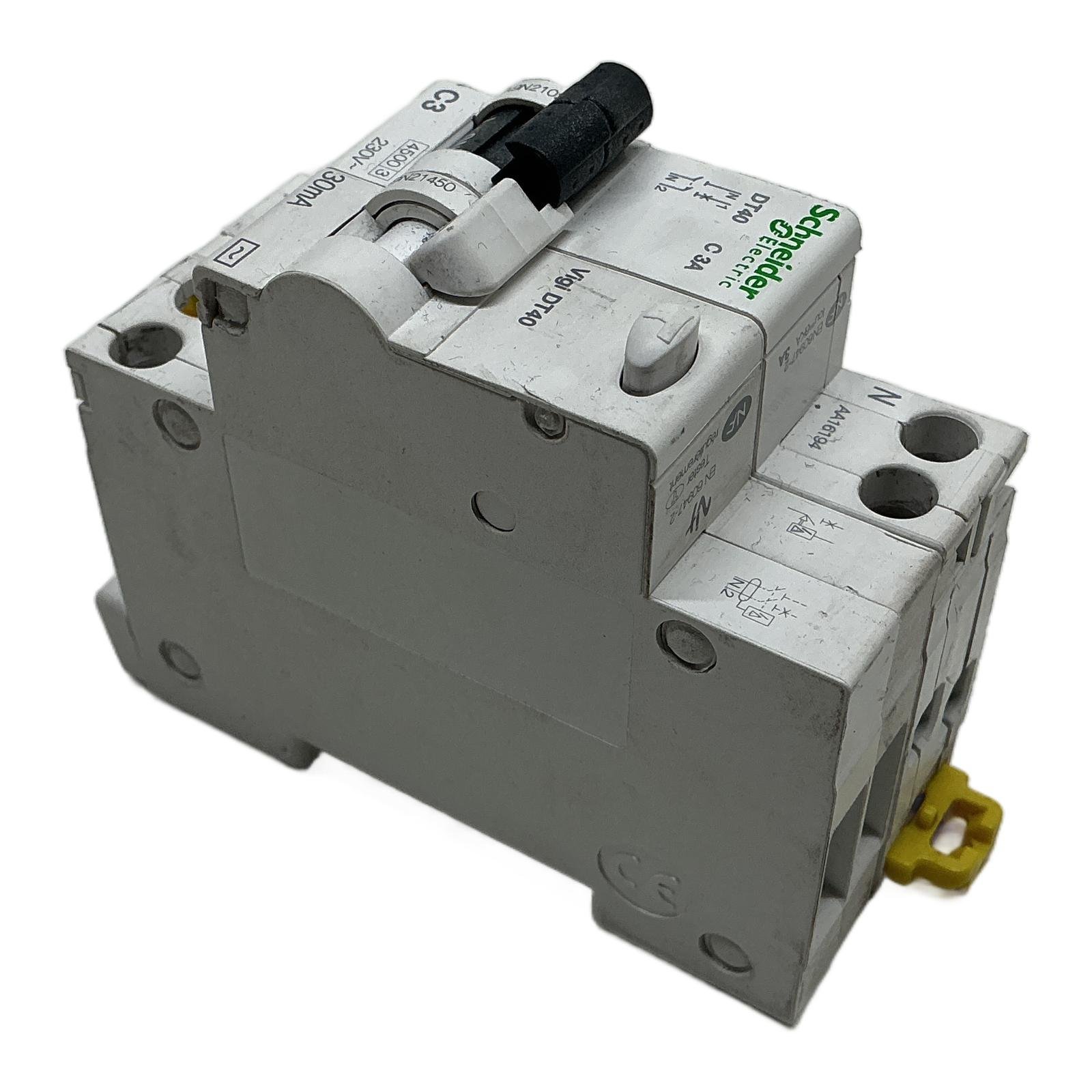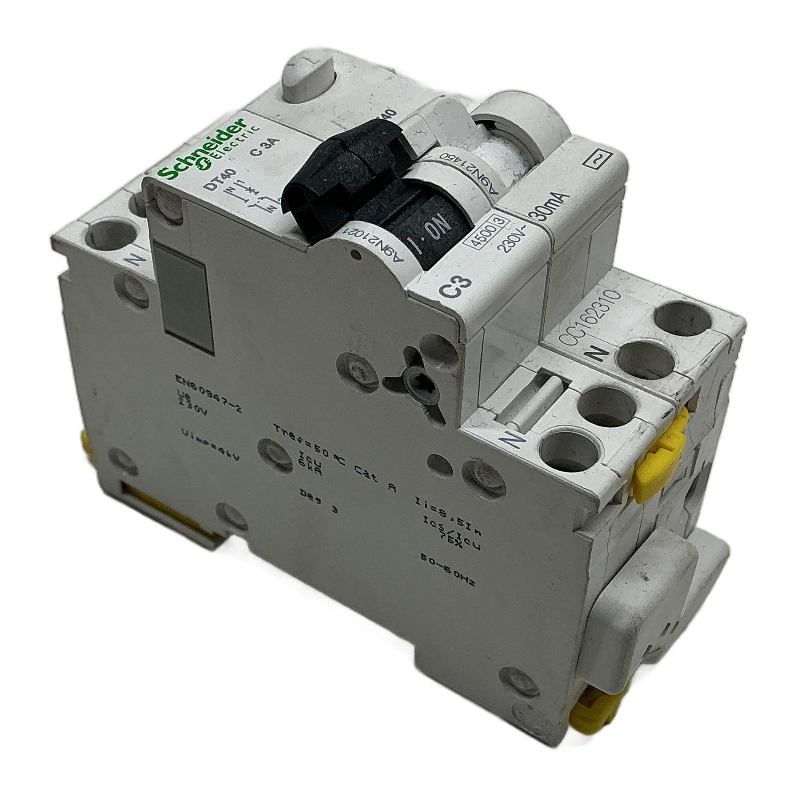 Schneider Electric DT40 Series RCBO Description This is a Residual Current Circuit Breaker with Overcurrent protection (RCBO) from the Schneider Electric DT40 series. It combines the functionality of a Miniature Circuit Breaker (MCB) and a Residual Current Device (RCD) into a single, DIN-rail mountable unit. This device offers comprehensive protection for final circuits against short-circuits, cable overloads, and electric shock hazards from direct or indirect contact. Specifications Manufacturer: Schneider Electric Series: DT40 Rated Current: 3 Amperes Tripping Curve: C Residual Current Sensitivity: 30 mA Number of Poles: 1P+N Rated Voltage: 230V AC Breaking Capacity: 4500 A (EN 60898), 6 kA (EN 60947-2) Label Info MCB Part: DT40 C 3A, A9N21021 RCD Add-on: Vigi DT40, A9N21450 Application Ideal for use in residential, commercial, and light industrial electrical distribution boards for the protection of final circuits, such as lighting, sockets, and small appliances. Country of Origin This product is manufactured by Schneider Electric, with production facilities commonly located in France. CO2 Impact Opting for this pre-owned component avoids the production of a new one, saving an estimated 7.2 kg of CO2. This saving is comparable to the emissions from a 36 km car journey. Availability This item is an obsolete component but is available from our stock. Order now from profideals for expert support and fast delivery. FAQ What is the difference between a Type AC and a Type A RCBO?A Type AC device, like this Vigi DT40, is designed to trip on sinusoidal AC fault currents. A Type A device trips on both sinusoidal AC and pulsating DC fault currents, which are common with modern electronic equipment. For modern installations, Type A is often recommended or required. Can the Vigi DT40 RCD block be replaced separately from the DT40 circuit breaker?Yes, the Vigi DT40 is an add-on block. It clips onto the side of a compatible DT40 series miniature circuit breaker. This modular design allows for flexibility and replacement of individual components. What does the ‘C’ in ‘C3A’ signify?The ‘C’ refers to the tripping curve of the circuit breaker. A C-curve breaker is a general-purpose breaker that trips between 5 and 10 times the rated current. It is suitable for most applications, including resistive and inductive loads like lighting and sockets. profideals is not an authorized distributor, reseller or representative of the products featured on this website. All product names, trademarks, brands and logos used on this site are the property of their respective owners. Last Update: Friday, March 13, 2026