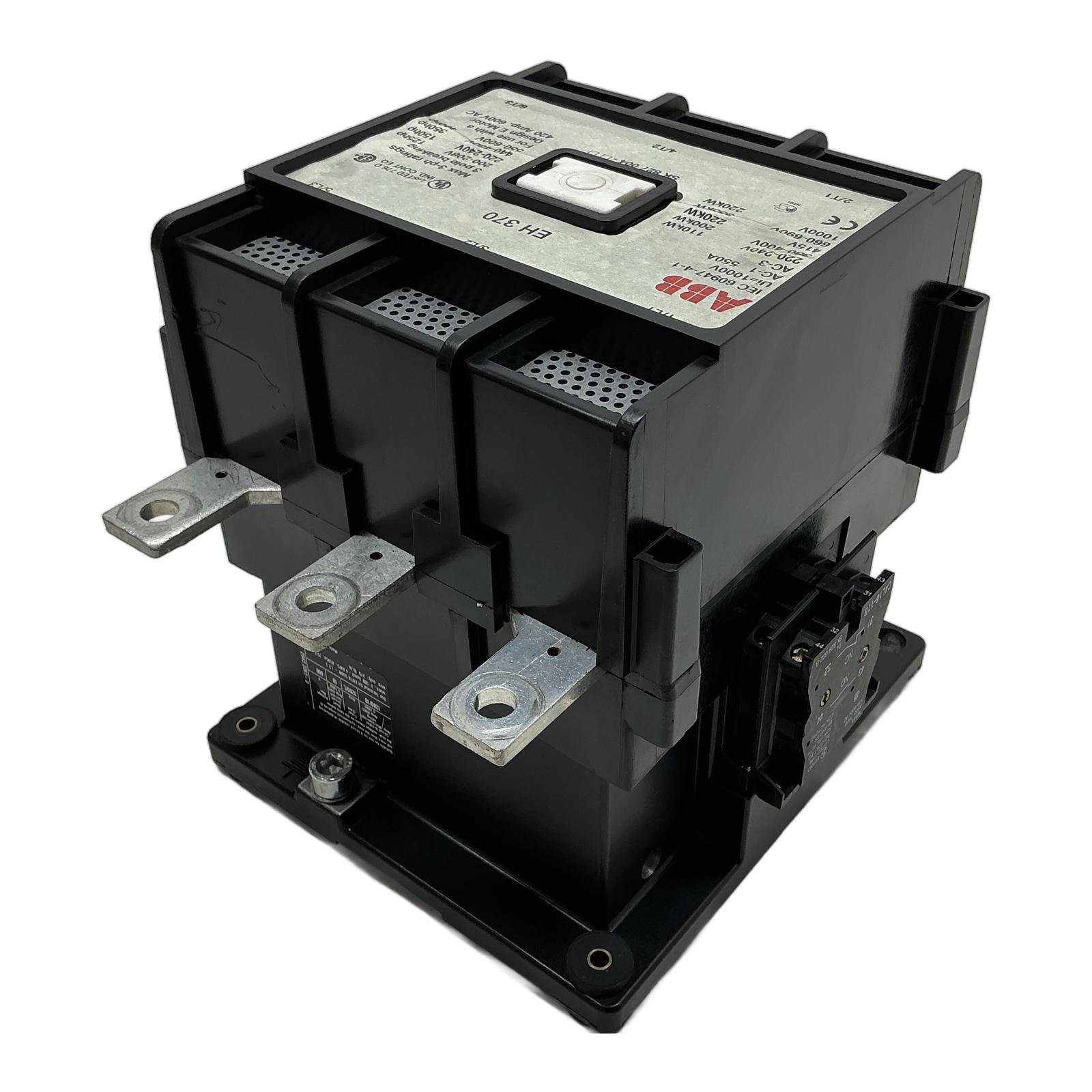 ABB EH 370 Heavy-Duty 3-Pole Contactor Description The ABB EH 370 is a high-performance 3-pole contactor designed for controlling motors and other highly inductive loads. With a thermal current rating of 550A (AC-1) and a capacity of 200kW at 400V (AC-3), this device is built for demanding industrial environments. This unit includes a 220-255V AC coil and a CAL16-11B auxiliary contact block. Please note: This is a used item and has one loose/detached rubber mounting foot, but is otherwise in good condition. Specifications Manufacturer: ABB Model: EH 370 Poles: 3-Pole Rated Insulation Voltage (Ui): 1000V Conventional Thermal Current (Ith, AC-1): 550A AC-3 Rating at 400V: 200kW Coil Voltage: 220-230V 50Hz / 230-255V 60Hz Auxiliary Contacts: 1 NO, 1 NC (CAL16-11B) Label Info Main Part Number: SK 827 004-DD Coil Part Number: SK 827 100-EM Auxiliary Block: SK 829 002-B / CAL16-11B Standard: IEC 60947-4-1 Application Ideal for motor starting, isolation, and distribution applications in industries such as manufacturing, processing, and large-scale HVAC systems. Country of Origin Made in Sweden. CO2 Impact Opting for this pre-owned contactor saves an estimated 95 kg of CO2 emissions compared to a new one, contributing to a more sustainable industrial operation. Availability This is an obsolete item, offering a crucial replacement for existing systems. Order now from profideals for expert support and fast delivery. FAQ What is the difference between AC-1 and AC-3 ratings for this contactor?AC-1 rating (550A) is for non-inductive or slightly inductive loads, like resistance heaters. The AC-3 rating (e.g., 200kW at 400V) is for squirrel-cage motors and involves switching the motor during its run-up phase, which is a more demanding task. Always use the AC-3 rating for motor applications. Can the coil (SK 827 100-EM) be replaced with a different voltage coil?Yes, the EH series contactors were designed with replaceable coils. You can exchange the existing 220-255V AC coil with another compatible ABB coil of a different voltage (e.g., 24V DC, 110V AC) if your control circuit requires it. What are the correct tightening torque specifications for the main power terminals?As indicated on the side label, the recommended tightening torque for the main terminals (using the EHTK 550N kit) is 375 lb.in. (approximately 42.4 Nm). Using the correct torque is critical to prevent overheating and ensure a secure connection. Last Update: Friday, March 13, 2026 profideals is not an authorized distributor, reseller or representative of the products featured on this website. All product names, trademarks, brands and logos used on this site are the property of their respective owners.