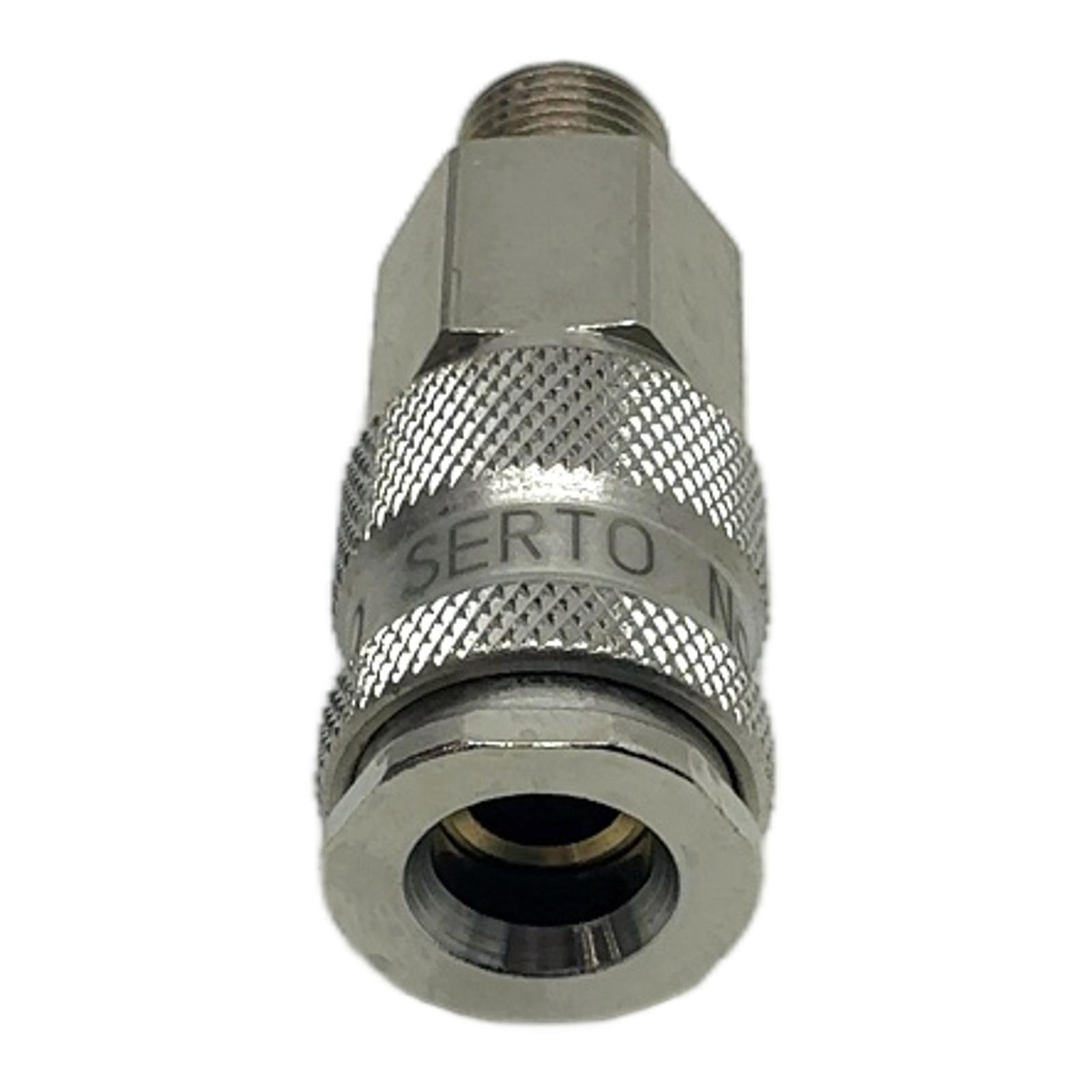 SERTO Pneumatic Quick Coupling Socket R1/4 Male Thread KA 223-R1/4 N Description This SERTO quick coupling socket, model KA 223-R1/4 N, is a high-quality pneumatic fitting designed for fast and secure connections in compressed air systems. It is built according to the widely used Europrofile standard (DN 5), ensuring broad compatibility with corresponding plugs. The durable nickel-plated brass construction provides excellent resistance to corrosion and wear in industrial environments. Specifications Manufacturer: SERTO Type: Pneumatic Quick Coupling Socket Model: KA 223-R1/4 N Profile: Europrofile DN 5 Connection Thread: R 1/4 inch Male Material: Nickel-plated Brass Label Info The product’s packaging label includes the following details from the distributor: Item Number: 06180043 Description: SNELKOPPELING BUITENDRAAD R1/4 (Dutch for Quick Coupling Male Thread R1/4) Model Line: MESSINGCO KA 223-R1/4 N Application Ideal for use in general industrial automation, workshops, automotive repair, and any application requiring a reliable and quick-disconnect air line connection. Its standard profile makes it a versatile component for both new installations and repairs. Country of Origin This product is manufactured by SERTO, a company based in Switzerland. CO2 Impact By purchasing this pre-owned component, you are contributing to a circular economy and avoiding the CO2 emissions of new production. This specific item saves an estimated 0.12 kg of CO2, which is comparable to the energy needed to fully charge a smartphone over 14 times. Availability This item is in stock and ready for immediate dispatch. Order now from profideals for expert support and fast delivery. FAQ Is this coupling compatible with other brands? Yes, this coupling is manufactured to the Europrofile DN 5 (also known as DN 5.5) standard. This ensures it is interchangeable with plugs of the same standard from other manufacturers like Parker, Rectus, Aignep, and Festo. What is the maximum operating pressure for this coupling? While the exact datasheet for this specific model isn’t available, standard Europrofile DN 5 couplings made from nickel-plated brass typically have a maximum operating pressure of up to 35 bar (500 PSI). Always verify against your system’s requirements. What does the ‘N’ in the part number KA 223-R1/4 N refer to? The ‘N’ in the part number typically stands for ‘Nickel-plated’, indicating the surface finish of the brass body which provides enhanced corrosion resistance and durability. Last Update: Friday, March 13, 2026 profideals is not an authorized distributor, reseller, or representative of the products featured on this website. All product names, trademarks, brands, and logos used on this site are the property of their respective owners.