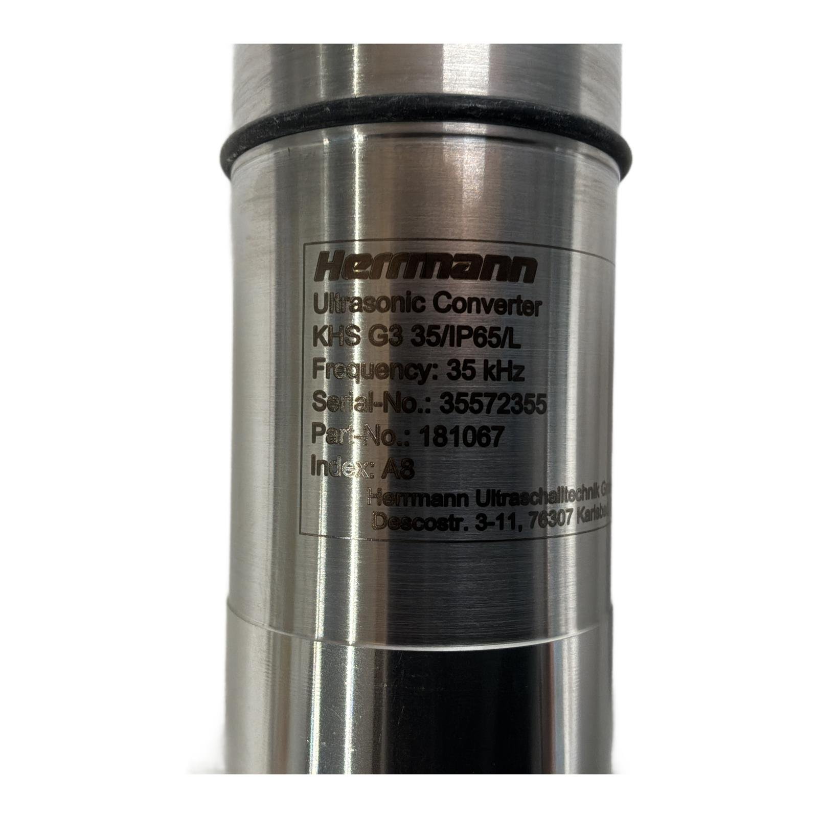 An industrial ultrasonic converter, which is a device that converts electrical energy into high-frequency mechanical vibrations for use in applications like welding, cutting, and cleaning. Product Description This is a Herrmann KHS G3 35/IP65/L Ultrasonic Converter, a high-performance component designed for industrial ultrasonic applications such as welding, cutting, or cleaning. Operating at a frequency of 35 kHz, it is ideal for processes requiring precision and control. Its robust stainless steel construction and IP65 rating ensure it is dust-tight and protected against water jets, making it suitable for demanding manufacturing environments. This converter is a key element for integrating ultrasonic technology into automated production lines. Product Specifications – Manufacturer: Herrmann Ultraschalltechnik GmbH- Type: Ultrasonic Converter- Model: KHS G3 35/IP65/L- Part Number: 181067- Serial Number: 35572355- Operating Frequency: 35 kHz- Ingress Protection: IP65- Suffix (/L): The ‘L’ suffix likely denotes a specific configuration, possibly related to length or connection type, as per manufacturer standards. Product Label Info Model Code / Product Markings: KHS G3 35/IP65/L 181067 Serial Number: 35572355 Application This part is typically used in industrial environments for ultrasonic welding, cutting, or cleaning applications. Country of Origin This product is manufactured in Germany. Method of Application For integration into automated production lines, follow manufacturer guidelines for proper installation and operation. Safety Instructions Ensure proper grounding and follow all safety guidelines provided by the manufacturer to prevent electrical hazards. Availability Order now from profideals, items in stock and ready for fast worldwide delivery. Need urgent and express delivery, sourcing, or repairs? Contact us now. Documentation Official datasheet or product page Herrmann Resources Additional resources and manuals are available upon request. Contact us for details. Internal & External Links All products from Herrmann Explore similar products in Automation Frequently Asked Questions What is the ultrasonic converter used for? This part is typically used in industrial environments, such as production lines, for processes like welding, cutting, or cleaning. What are the key advantages of the ultrasonic converter? The ultrasonic converter offers precision control and reliability for industrial applications requiring high-frequency mechanical vibrations. Is KHS G3 35/IP65/L 181067 compatible with my system? If you’re using Herrmann control systems, especially those designed for ultrasonic applications, this model will likely be compatible. Contact us to verify. Alternatives to KHS G3 35/IP65/L 181067 If you’re looking for a similar part, consider exploring other ultrasonic converters with compatible specifications for your application needs. Can I sell my surplus stock to profideals? Yes, profideals accepts surplus stock and offers solutions for surplus recovery, inventory clearance, and resale agreements. Contact us for more information. If you have spare parts or overstock, feel free to contact us for more information. Need Help? Call us at +31(0)165 20 11 80 or get in touch online. Last Update: 18/02/2026 profideals is not an authorized distributor of the products listed. Product names, trademarks, and logos belong to their respective owners. Our listings are for identification purposes only and do not imply affiliation or authorization.