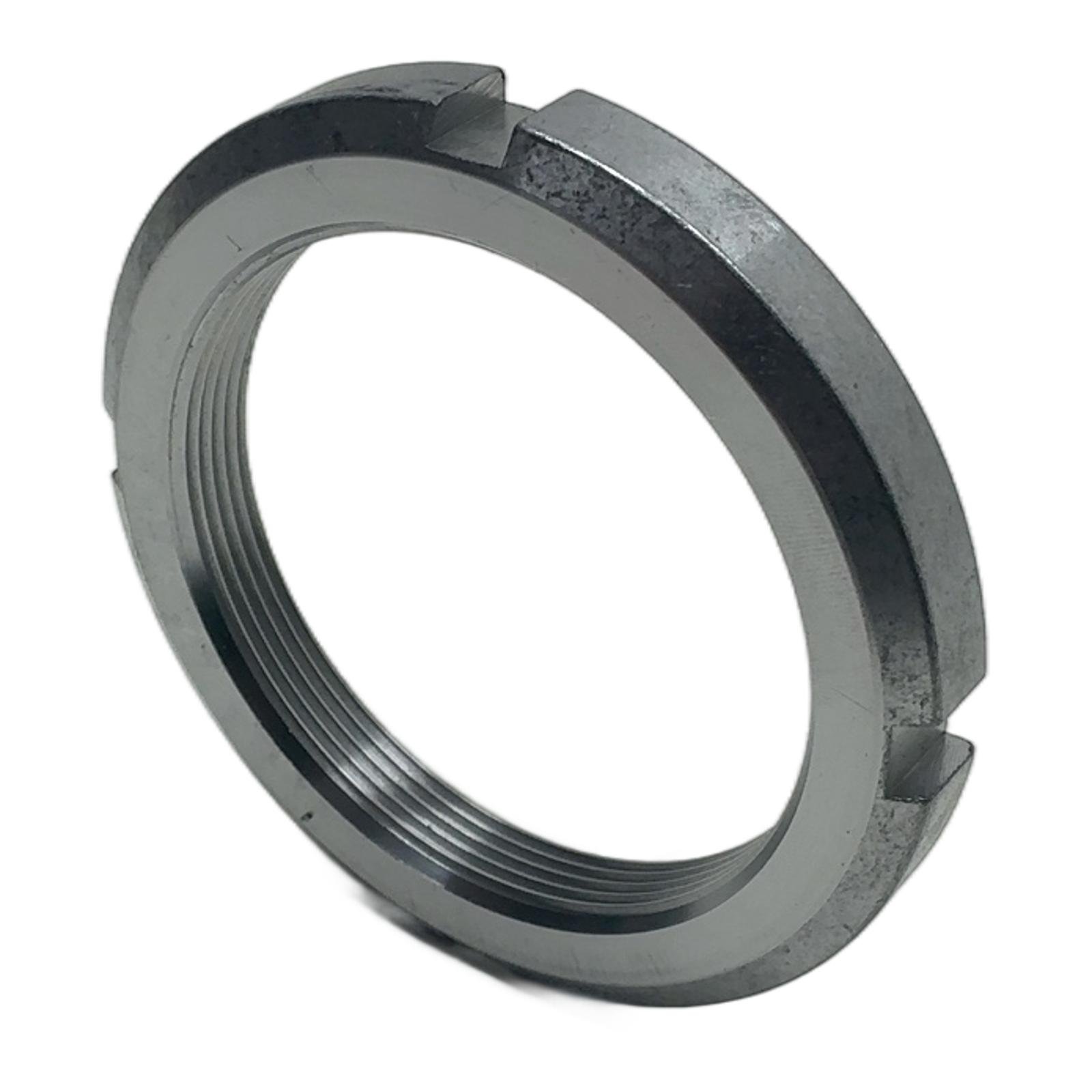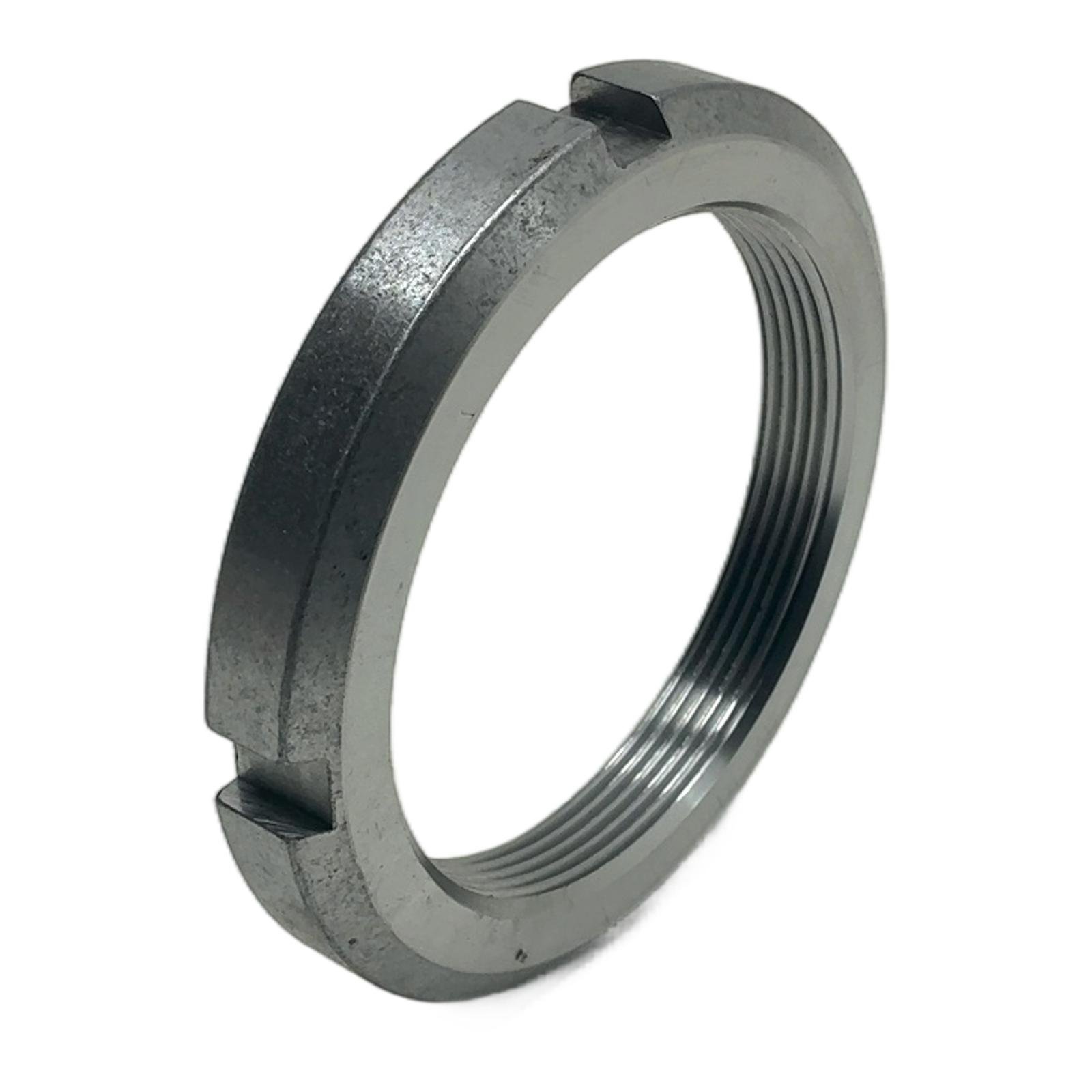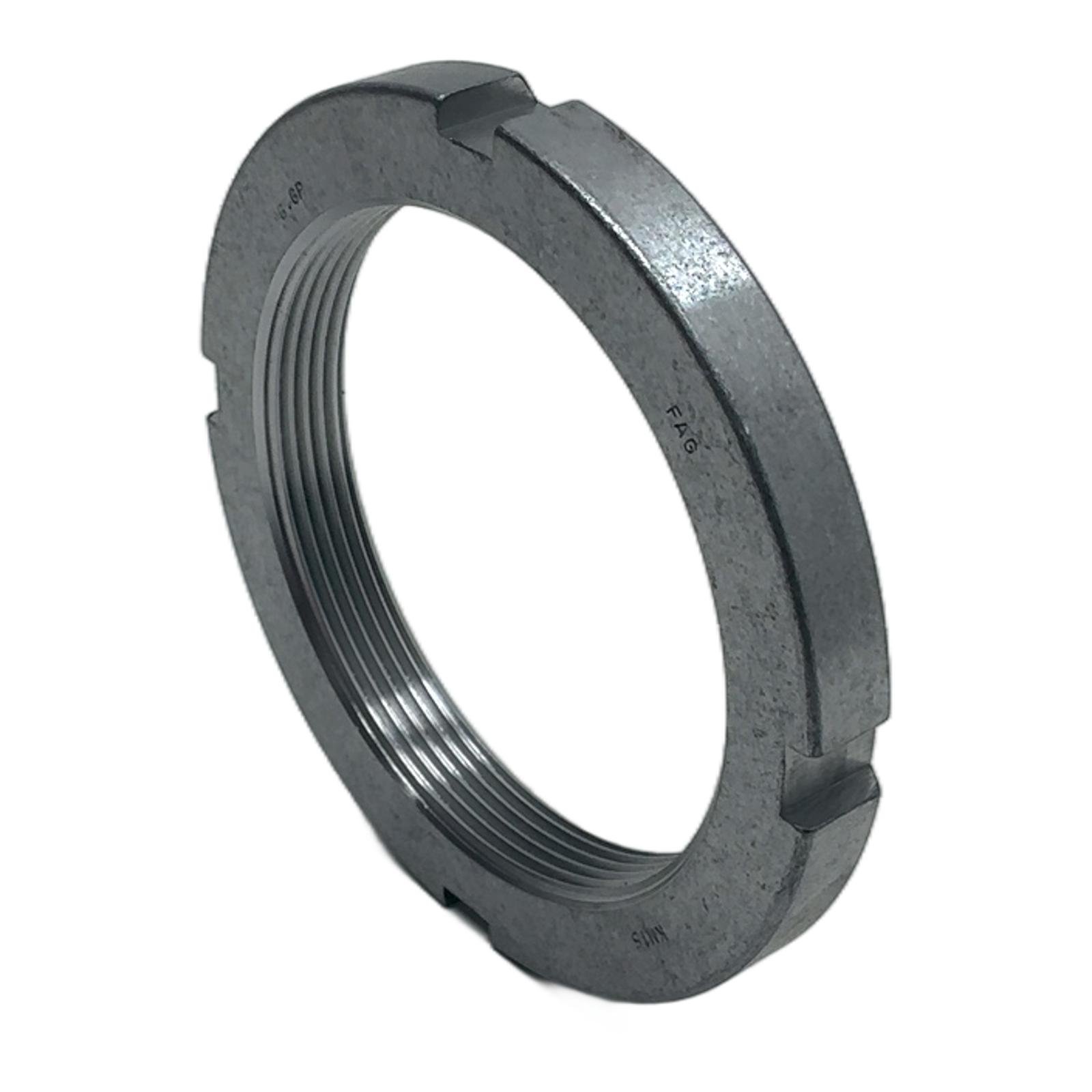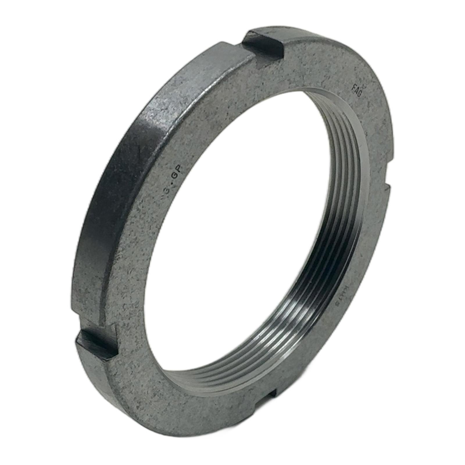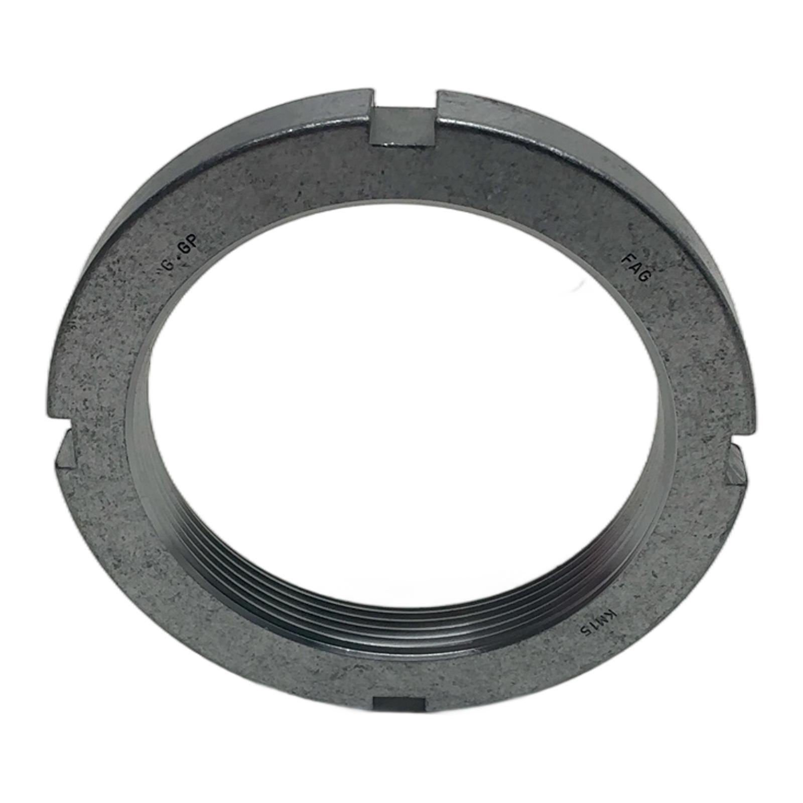 FAG KM15 Bearing Lock Nut M75x2 Description The FAG KM15 is a high-quality metric bearing lock nut, designed for securing bearings and other components onto a shaft or adapter sleeve. Manufactured by FAG, a brand of the Schaeffler Group, it guarantees precision and reliability. The four slots on its circumference allow for easy tightening and securing with a corresponding hook spanner and lock washer. Specifications Thread Size: M75x2 Outside Diameter: 100 mm Width: 12 mm Standard: DIN 981 Material: Steel Compatible Lock Washer: MB15 Label Info Manufacturer: FAG Part Number: KM15 Order Code: 19091100 EAN: 4012801052528 Application This lock nut is widely used in various industrial applications, including gearboxes, pumps, conveyors, and other machinery where bearings need to be precisely located axially on a shaft. It prevents loosening caused by vibration or rotational forces. Country of Origin Germany CO2 Impact Choosing this surplus component over a new one avoids the emission of approximately 0.5 kg of CO2, contributing to a more sustainable industrial practice. Availability This item is in stock and ready for immediate dispatch. Order now from profideals for expert support and fast delivery. FAQ Question? What is the correct tightening procedure for a KM15 lock nut?Answer: The KM15 should be tightened using a suitable hook spanner (e.g., DIN 1810). For precise bearing clearance, it should be tightened to a specific torque or using the angle of rotation method, as specified in the bearing mounting instructions. It is then secured by bending a tab of the corresponding MB15 lock washer into one of the nut’s slots. Question? What locking device is compatible with the KM15?Answer: The FAG KM15 lock nut is designed to be used with an MB15 lock washer. The washer has an inner tab that locates in a keyway on the shaft and an outer tab that is bent into a slot on the nut to prevent rotation. Question? Can this nut be reused after disassembly?Answer: Yes, in most cases the lock nut can be reused, provided the threads are undamaged and it has not been over-torqued or deformed. However, the lock washer (MB15) is a single-use item and should always be replaced upon reassembly. profideals is not an authorized distributor, reseller, or representative of the products featured on this website. All product names, trademarks, brands, and logos used on this site are the property of their respective owners. Last Update: Friday, March 13, 2026