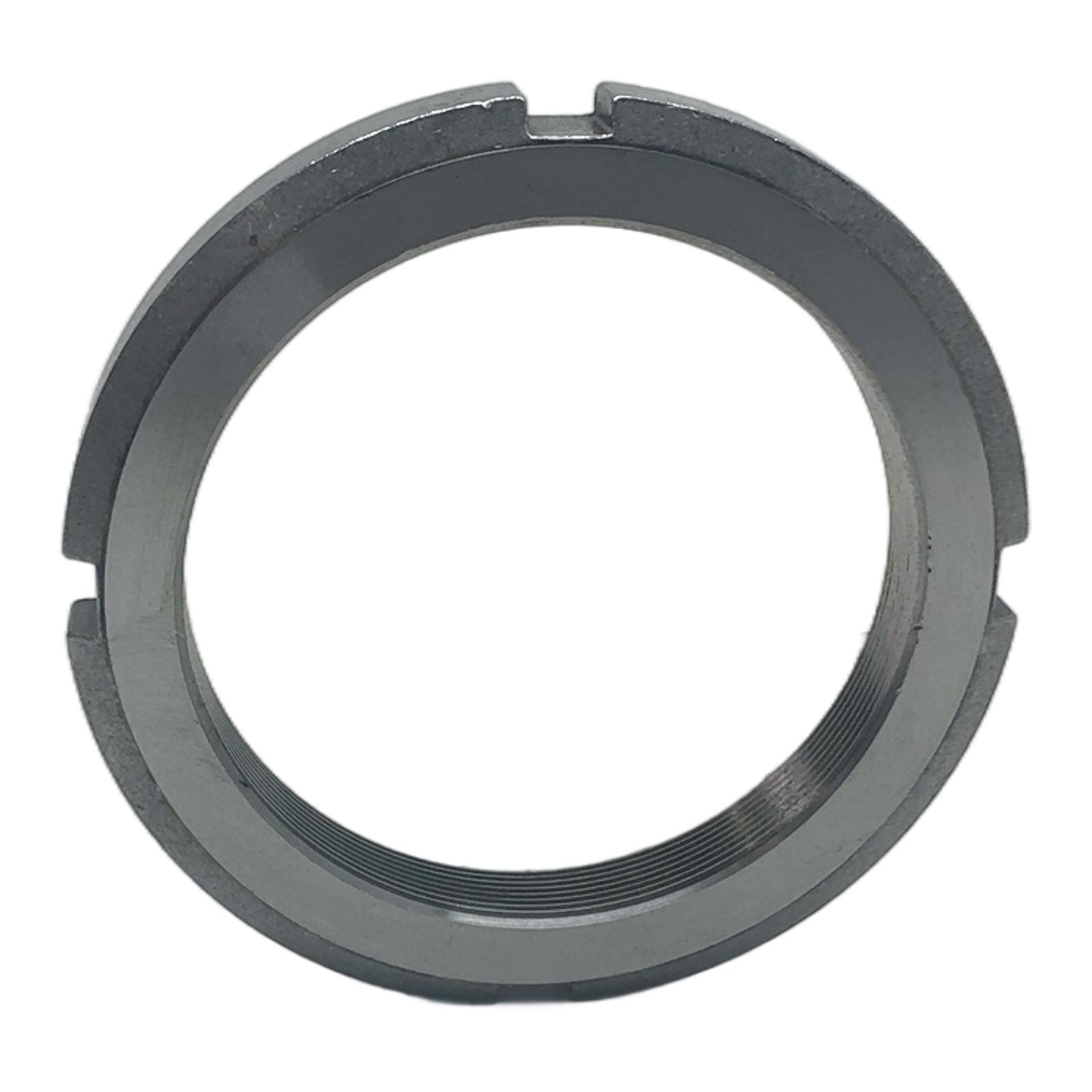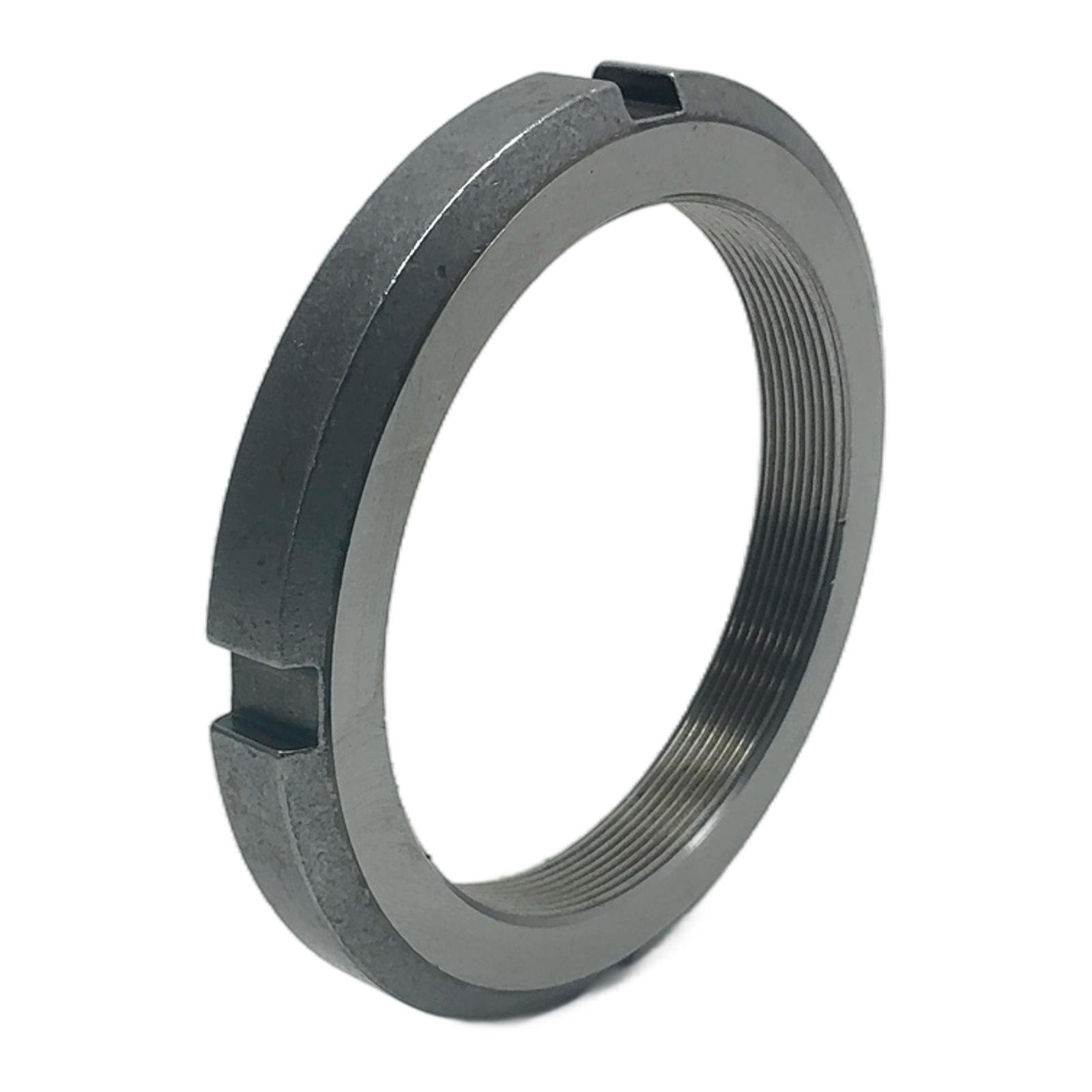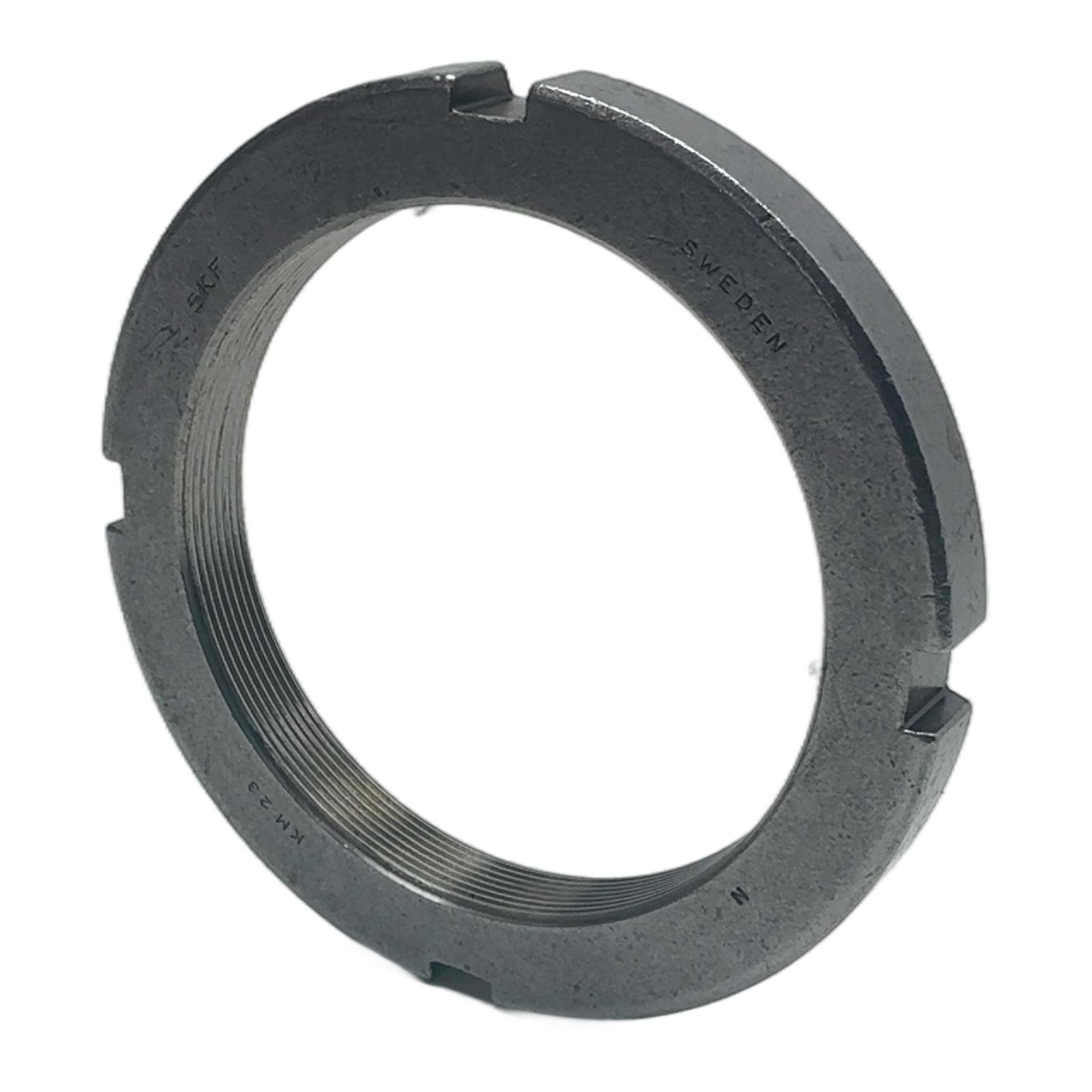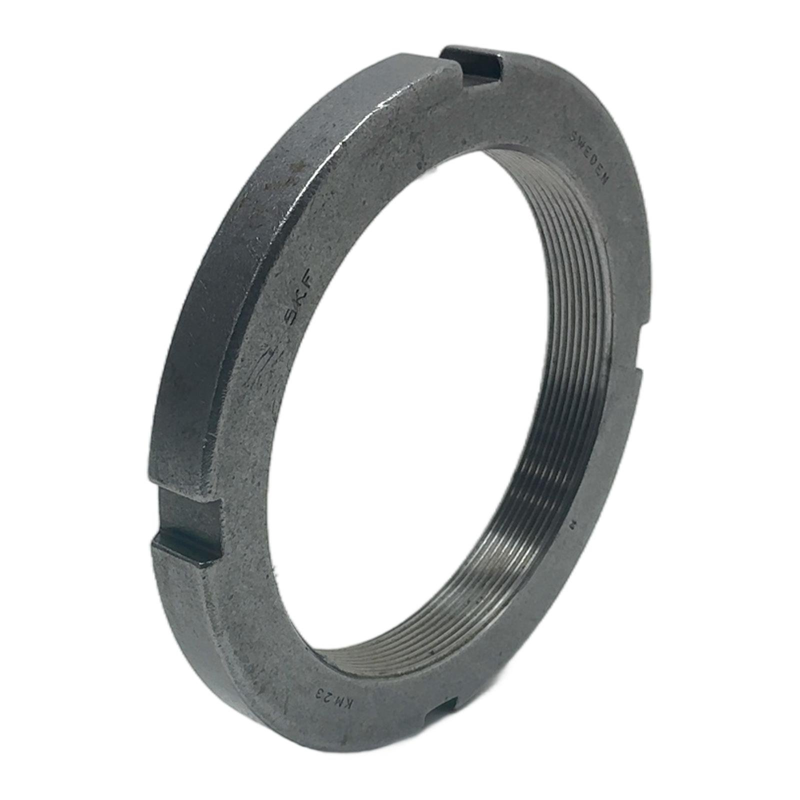 SKF KM 23 Bearing Lock Nut Description The SKF KM 23 is a high-quality metric lock nut designed for securing bearings and other machine components onto a shaft. It prevents axial movement and ensures precise positioning. Manufactured in Sweden, this nut adheres to stringent quality standards for reliable industrial applications. It is intended to be used with an appropriate locking washer or clip to prevent it from loosening under operational stress. Specifications Manufacturer: SKF Type: KM 23 Thread Size: M115x2 Outside Diameter: 150 mm Width: 16 mm Material: Steel Recommended Locking Washer: MB 23 Label Info Brand: SKF Model: KM 23 Application This lock nut is widely used in various industrial sectors, including manufacturing, automotive, and power transmission, for mounting bearings on shafts, adapter sleeves, and withdrawal sleeves. Country of Origin Made in Sweden. CO2 Impact By purchasing this pre-owned component, you contribute to a circular economy and help avoid approximately 1.44 kg of CO2 emissions associated with the production of a new one. Availability This item is in stock and ready for immediate dispatch. Order now from profideals for expert support and fast delivery. FAQ What is the correct locking device for the SKF KM 23 nut?The KM 23 lock nut is designed to be used with an MB 23 locking washer. Alternatively, for higher precision applications, MS 30/115-31/115 series locking clips can be used. What is the proper tightening method for a KM 23 lock nut?The KM 23 should be tightened using a hook spanner (e.g., SKF HN 21-22) that fits the four slots on its circumference. The required torque depends on the specific bearing mounting procedure, often involving measuring the reduction of radial internal clearance. Is the M115x2 thread a standard metric coarse or fine thread?The M115x2 designation indicates a metric fine thread. ‘M115’ is the nominal diameter in millimeters, and ‘2’ is the thread pitch in millimeters, which is finer than the standard coarse pitch for this diameter. profideals is not an authorized distributor, reseller or representative of the products featured on this website. All product names, trademarks, brands and logos used on this site are the property of their respective owners. Last Update: Friday, March 13, 2026