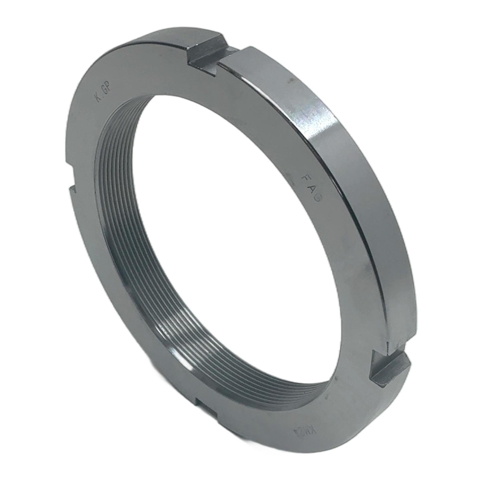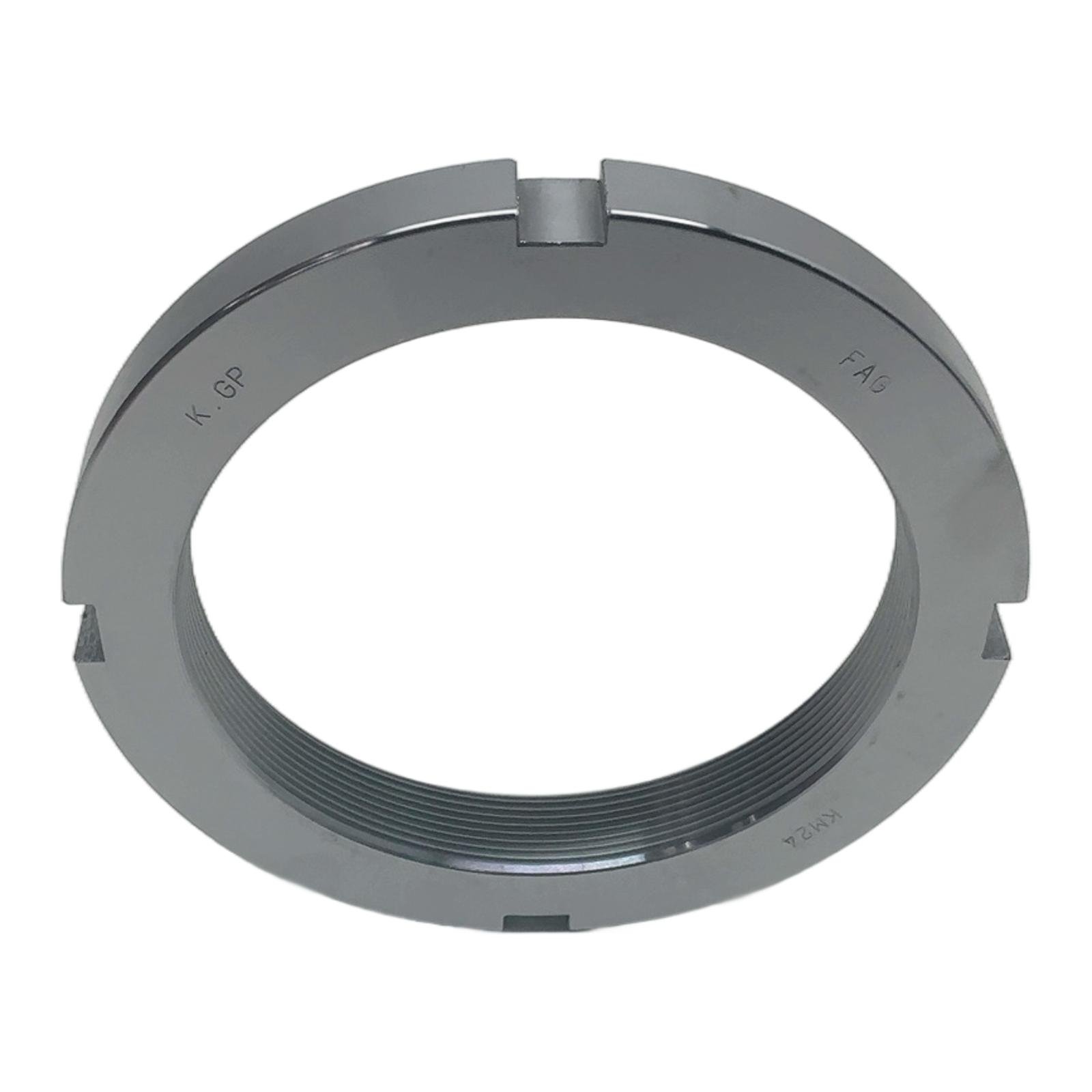 FAG KM24 Lock Nut Description The FAG KM24 is a precision-engineered axial lock nut, designed for securing bearings and other machine components onto shafts. Manufactured to DIN 981 standards, this lock nut provides a simple, reliable, and space-saving fastening solution. It is intended to be used with an appropriate locking washer (e.g., MB24) to prevent loosening under vibration or dynamic loads. Specifications Thread Size: M120x2 Outside Diameter: 155 mm Width: 22 mm Standard: DIN 981 Material: Steel Label Info Manufacturer: FAG Part Number: KM24 EAN: 4012801052702 Application These lock nuts are widely used in a variety of industrial applications, including gearboxes, pumps, conveyors, and general mechanical engineering, to axially locate bearings and ensure reliable operation. Country of Origin This product is made in Taiwan. CO2 Impact Opting for this component helps avoid the emission of approximately 2.1 kg of CO2 compared to manufacturing a new one, contributing to a more sustainable industrial practice. Availability This item is a New Old Stock (NOS) product, in excellent condition and supplied in its original manufacturer packaging. Available for immediate dispatch. Order now from profideals for expert support and fast delivery. FAQ What is the correct tightening procedure for a FAG KM24 lock nut? The KM24 should be tightened using a suitable hook spanner (e.g., DIN 1810). The correct torque or angle of rotation method must be used as specified in the machine’s maintenance manual to achieve the proper bearing preload and secure locking. Is a separate locking device required for the KM24? Yes, KM-series lock nuts are designed to be used with a corresponding locking washer, such as an MB24 tab washer. The washer’s inner tab engages a keyway on the shaft, and one of the outer tabs is bent into a slot on the nut to prevent it from loosening. What material is the FAG KM24 made from and what is its finish? The FAG KM24 is manufactured from high-quality steel to ensure strength and durability. It typically has a plain or lightly oiled finish to prevent corrosion during storage and transport. profideals is not an authorized distributor, reseller, or representative of the products featured on this website. All product names, trademarks, brands, and logos used on this site are the property of their respective owners. Last Update: Friday, March 13, 2026