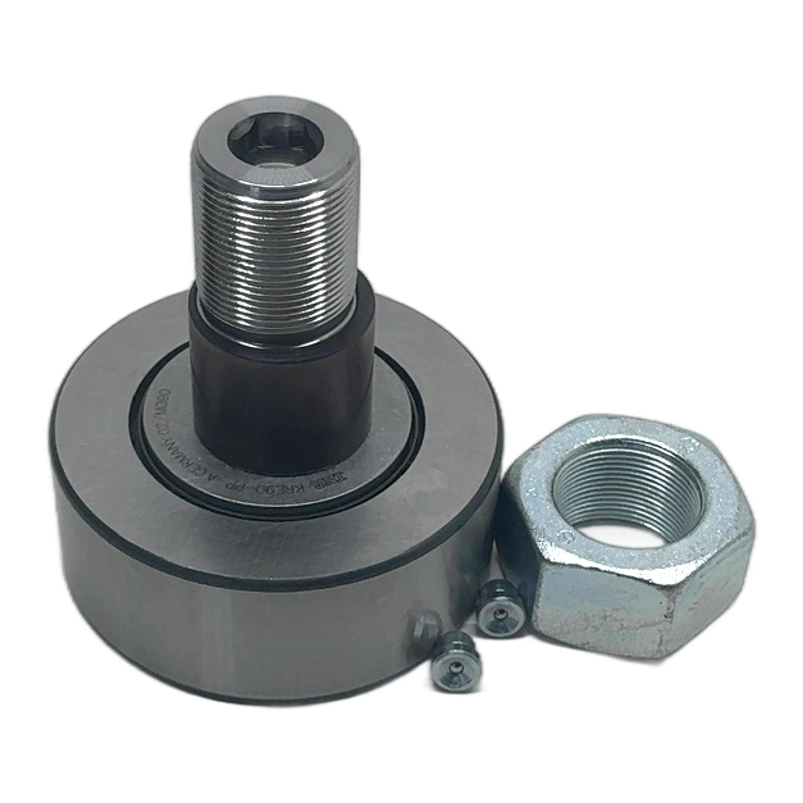 INA KRE90-PP-A Stud Type Track Roller Description The INA KRE90-PP-A is a high-performance stud-type track roller designed for demanding industrial applications. With a 90mm outer diameter, it features an eccentric collar for easy adjustment of clearance. The ‘PP’ designation indicates that it is equipped with high-quality plastic axial plain washers and formed seal lips on both sides, providing excellent protection against contamination and ensuring lubricant retention for a long service life. This roller is manufactured in Germany, guaranteeing superior quality and reliability. Specifications Manufacturer: INA (Schaeffler Group) Model: KRE90-PP-A Type: Stud Type Track Roller with Eccentric Collar Outer Diameter: 90 mm Thread Size: M30x1.5 Overall Length: 100 mm Sealing: PP-Seal on both sides Application Ideal for use in cam gear mechanisms, conveyor systems, linear motion systems, and other applications requiring high radial load capacity and reliable guidance. Country of Origin Made in Germany. CO2 Impact Choosing this component saves approximately 4.0 kg of CO2 emissions compared to producing a new one, contributing to a more sustainable operation. Availability This item is in stock and ready for immediate dispatch. Order now from profideals for expert support and fast delivery. FAQ What does the ‘PP’ suffix in KRE90-PP-A signify?The ‘PP’ suffix indicates that the track roller is fitted with plastic axial plain washers combined with formed seal lips on both sides. This design provides superior sealing against contaminants and prevents grease leakage. How is the eccentric collar on this track roller adjusted?The eccentric collar allows for fine-tuning of the roller’s position against the track. Adjustment is typically done by turning the stud using the hexagonal socket at the end, allowing for precise setting of operational clearance or preload. What is the recommended lubrication for this INA track roller?These bearings are typically supplied pre-greased with a high-quality lithium complex soap grease, suitable for a wide range of operating temperatures and conditions. For re-lubrication intervals and specific grease types, always consult the manufacturer’s technical datasheet. profideals is not an authorized distributor, reseller or representative of the products featured on this website. All product names, trademarks, brands and logos used on this site are the property of their respective owners. Laatst bijgewerkt: Friday, March 13, 2026