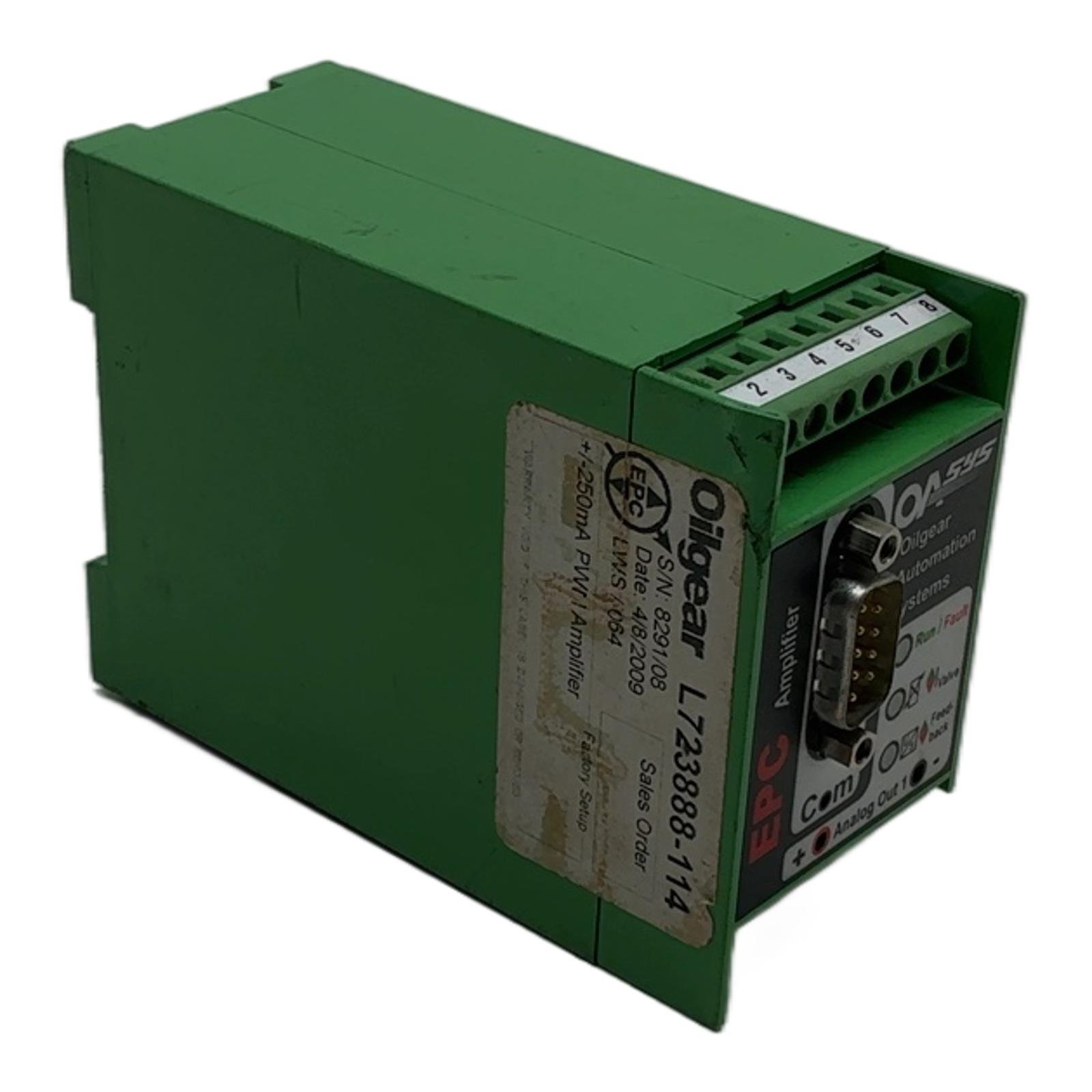 Oilgear EPC Digital Amplifier L723888-114 Description The Oilgear L723888-114 is a high-performance EPC (Electronic Proportional Control) amplifier designed for precise control of proportional valves in hydraulic systems. This DIN-rail mountable unit provides a +/- 250mA PWM current output, making it suitable for a wide range of industrial applications requiring accurate flow or pressure modulation. It features intuitive diagnostic LEDs for easy monitoring of system status. Specifications Manufacturer: Oilgear Model: L723888-114 Product Type: EPC Digital Amplifier Output: +/- 250mA PWM Current Mounting: DIN Rail Connections: Screw Terminals, DB9 COM Port Indicators: LEDs for Run/Fault, Valve status Label Info S/N: 8291/08 Date: 4/8/2009 Application This amplifier is ideal for applications in manufacturing, heavy machinery, and process control where precise and reliable control of hydraulic proportional valves is critical. CO2 Impact Opting for this pre-owned unit over a new one prevents the emission of approximately 10 kg of CO2, contributing to a more sustainable industrial environment. Availability This is a legacy component, available from our stock. Ensure compatibility with your system before purchase. Order now from profideals for expert support and fast delivery. FAQ What is the “EPC” in EPC Amplifier? EPC stands for Electronic Proportional Control. This amplifier is designed to provide a precise, variable current output to control proportional hydraulic valves, allowing for fine control over flow or pressure. Can this L723888-114 amplifier be configured in the field? The label indicates a “Factory Setup”, suggesting that key parameters are pre-configured. While some adjustments might be possible via the COM port (likely RS232 or similar), extensive reconfiguration may require specialized software from Oilgear. Always consult the technical manual before making changes. What do the ‘Run/Fault’ and ‘Valve’ LEDs indicate? The ‘Run/Fault’ LED provides the general operational status of the amplifier; green for normal operation and red for an internal or external fault. The ‘Valve’ LED typically indicates the status of the output to the valve coil, confirming that a signal is being sent. Last Update: Friday, March 13, 2026 profideals is not an authorized distributor, reseller or representative of the products featured on this website. All product names, trademarks, brands and logos used on this site are the property of their respective owners. The depiction, description or sale of products featuring these names, trademarks, brands and logos is for identification purposes only and is not intended to indicate any affiliation with or authorization by any rights holder.
