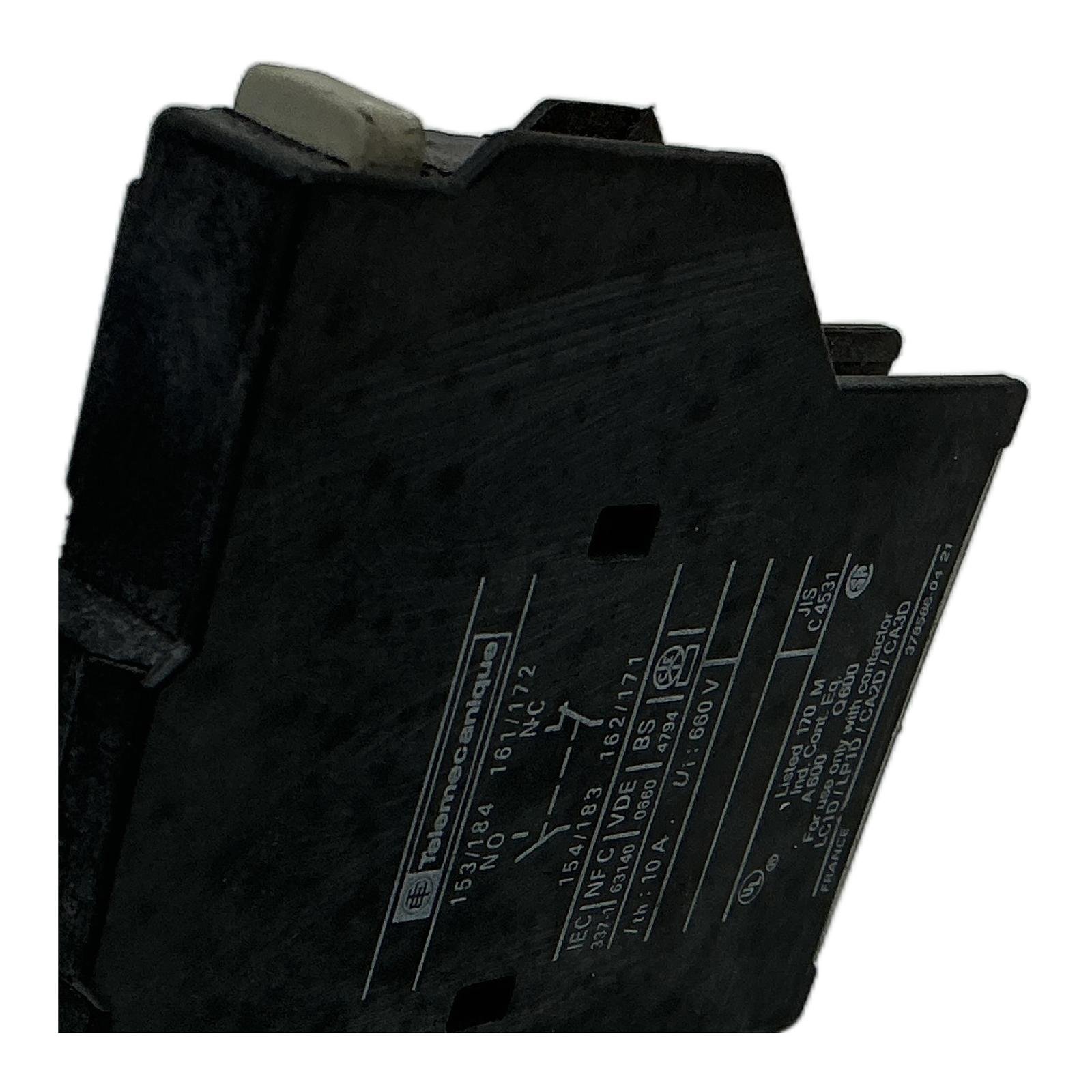 Schneider Electric LA8DN11 Auxiliary Contact Block for TeSys D Description The LA8DN11 is a high-quality auxiliary contact block manufactured by Schneider Electric under the Telemecanique brand. It is designed to easily clip onto the front of TeSys D and TeSys F contactors. This unit expands the control and signaling capabilities of the contactor by providing one additional normally open (NO) and one normally closed (NC) contact. It is a standard component for creating interlocking circuits, status feedback, and complex control logic in industrial automation environments. Specifications Manufacturer: Schneider Electric (Telemecanique) Model: LA8DN11 Product Type: Auxiliary Contact Block Contact Configuration: 1 NO + 1 NC Mounting Type: Front Mount Rated Insulation Voltage (Ui): 660 V Conventional Thermal Current (Ith): 10 A Terminals: Screw Clamp Compatibility: TeSys D, TeSys F, TeSys K contactors (e.g., LC1D, CA2D) Label Info NEMA Rating: A600, Q600 Standards: IEC, NFC, VDE, BS, UL, CSA, JIS Application This auxiliary contact block is widely used in motor control centers (MCCs), industrial machinery, and automation panels. It is essential for applications requiring electrical interlocking between two contactors, providing feedback to a PLC, or signaling the operational state of a motor to an indicator lamp. Country of Origin This product was made in France. CO2 Impact By purchasing this pre-owned item, you are helping to avoid the emission of approximately 2.0 kg of CO2. This is comparable to the savings from driving a standard car for 10 kilometers. Availability This item is in stock and ready for immediate dispatch. Order now from profideals for expert support and fast delivery. FAQ What is the correct mounting procedure for the LA8DN11 on a TeSys D contactor?The LA8DN11 is a front-mounting block. It simply clips onto the front face of a compatible TeSys D, TeSys K, or TeSys F contactor without the need for any tools. Ensure the contactor is de-energized before installation. Can this auxiliary contact block be used with safety circuits?While standard auxiliary contacts can be used for feedback, for certified safety applications, it is recommended to use specific safety-rated contactors and auxiliary blocks, such as those with mechanically linked, mirror contacts (e.g., LADN11G), to ensure reliable status feedback according to safety standards like EN ISO 13849-1. What is the significance of the A600/Q600 rating on the label?The A600/Q600 rating is a NEMA (National Electrical Manufacturers Association) standard code for pilot duty contact ratings. ‘A’ stands for AC voltage, and ‘Q’ for DC voltage. The ‘600’ indicates a maximum voltage of 600V. This code specifies the make/break current capacity at different voltages, ensuring its suitability for controlling coils of other contactors or relays in North American applications. profideals is not an authorized distributor, reseller, or representative of the products featured on this website. All product names, trademarks, brands, and logos used on this site are the property of their respective owners. Last Update: Friday, March 13, 2026