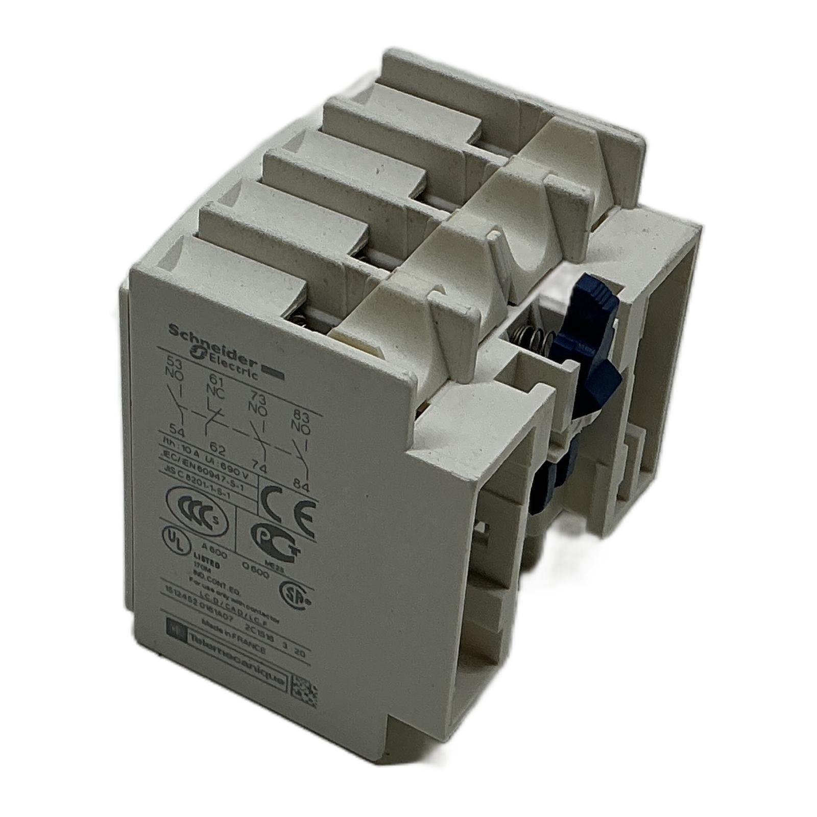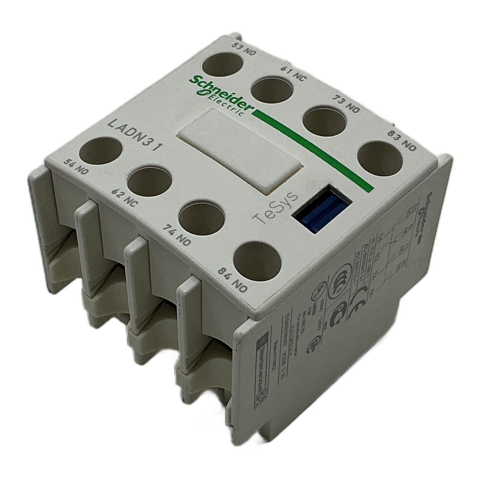 Schneider Electric LADN31 Auxiliary Contact Block for TeSys D Description The LADN31 is an instantaneous auxiliary contact block from Schneider Electric, designed for the TeSys D and TeSys Deca contactor ranges. This front-mounting block adds control circuit flexibility with three normally open (3 NO) and one normally closed (1 NC) contacts. It is an essential component for motor control applications requiring status feedback, interlocking, or additional control logic. Specifications Manufacturer: Schneider Electric Product Range: TeSys D, TeSys Deca Model: LADN31 Contact Configuration: 3 NO + 1 NC Mounting Style: Front Mount Terminal Type: Screw Clamp Rated Insulation Voltage (Ui): 690 V AC 25…400 Hz Conventional Free Air Thermal Current (Ith): 10 A (at 60 deg C) Label Info Brand: Schneider Electric (Telemecanique) Type: LADN31 Compliance: IEC/EN60947-5-1, CE, UL, CSA Application Ideal for use in industrial control panels, motor control centers (MCCs), and automation systems to enhance the functionality of TeSys contactors and control relays. Commonly used for signalling, electrical interlocking, and control circuit switching. Country of Origin Made in France. CO2 Impact By choosing this pre-owned LADN31, you are helping to avoid the 2.0 kg of CO2 emissions associated with the production of a new one. This choice supports a circular economy and reduces industrial waste. Availability This item is in stock and ready for immediate dispatch. Order now from profideals for expert support and fast delivery. FAQ What contactors is the LADN31 compatible with?The LADN31 auxiliary contact block is designed for front mounting on TeSys D and TeSys Deca range contactors (models LC1D, LC1DT) and control relays (CAD). Always verify compatibility with your specific contactor model. What are the screw terminal specifications for the LADN31?The LADN31 uses screw clamp terminals. They can accommodate one or two flexible cables from 1 to 2.5 mm squared (with or without cable end) or one or two solid cables from 1 to 2.5 mm squared. The recommended tightening torque is 1.2 N.m. Can I stack multiple LADN auxiliary blocks on a single contactor?Yes, depending on the contactor model. TeSys D contactors can typically accept one front-mounted and one side-mounted auxiliary contact block. The LADN31 is a front-mounted block. Refer to the Schneider Electric technical documentation for the maximum number and configuration of auxiliary contacts for your specific contactor. profideals is not an authorized distributor, reseller, or representative of the products featured on this website. All product names, trademarks, brands, and logos used on this site are the property of their respective owners. Last Update: Friday, March 13, 2026