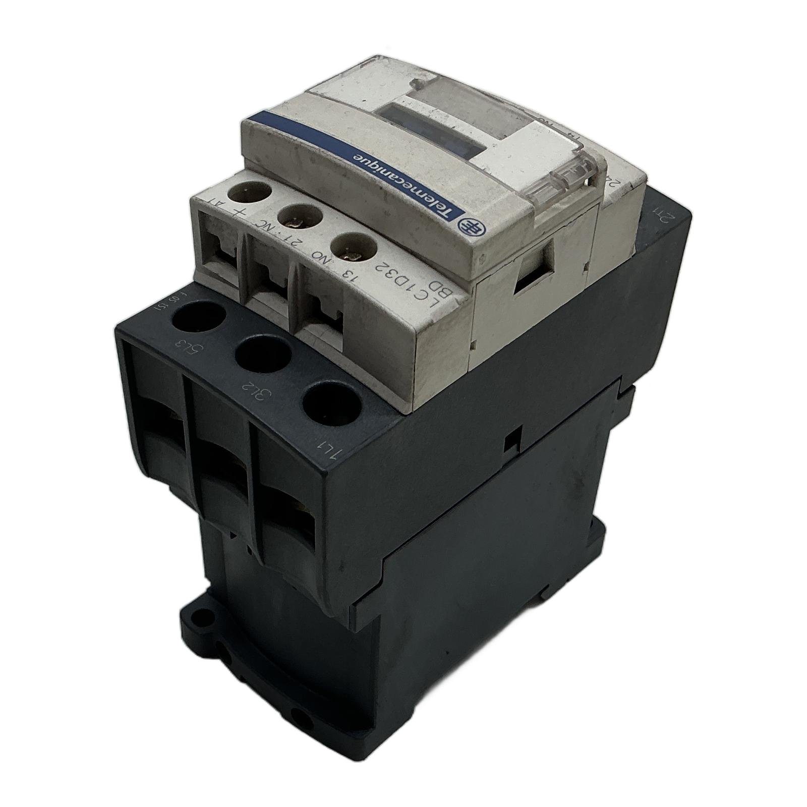 Schneider Electric LC1D32BD TeSys D Contactor Description The Schneider Electric LC1D32BD is a high-performance 3-pole contactor from the trusted TeSys D series. It is engineered for controlling motors and other power circuits in industrial environments. This contactor is designed for reliability and a long operational lifespan, featuring a 24V DC coil and integrated auxiliary contacts (1NO + 1NC). Its compact size allows for easy integration into control cabinets. Specifications Manufacturer: Schneider Electric Series: TeSys D Model: LC1D32BD Number of Poles: 3 Control Circuit Voltage: 24V DC Rated Operational Current (AC-3,
