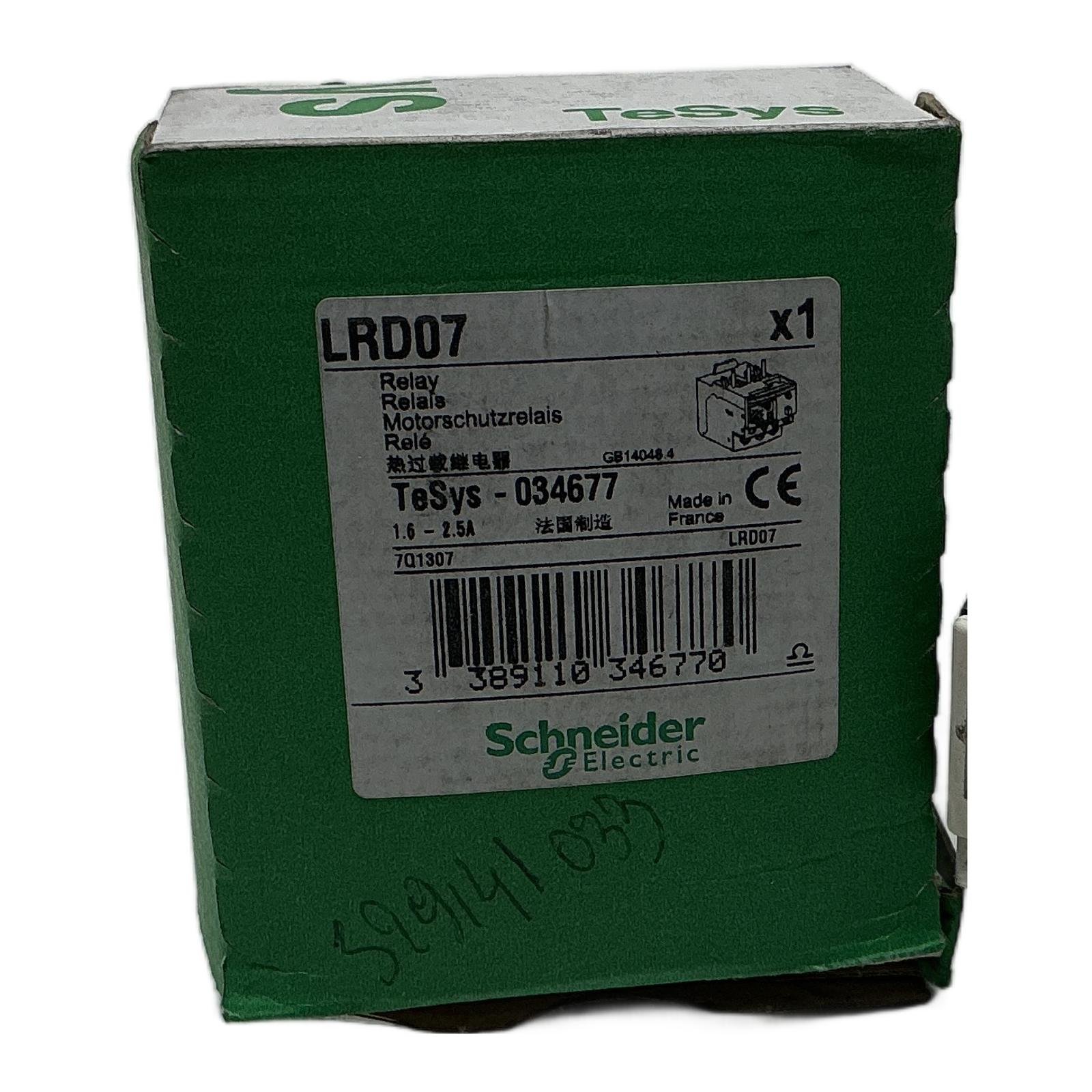 Schneider Electric LRD07 TeSys Thermal Overload Relay Description The Schneider Electric LRD07 is a differential thermal overload relay from the TeSys LRD range, engineered for reliable motor protection. It is designed for direct mounting on TeSys D contactors, providing a compact and efficient motor starter solution. With an adjustable current setting range of 1.6A to 2.5A, it protects motors from overloads, phase failures, and prolonged starting times. This relay features manual/automatic reset and a trip indicator for easy diagnostics. Specifications Manufacturer: Schneider Electric Product Range: TeSys LRD Model: LRD07 Part Number: 034677 Thermal Setting Range: 1.6 to 2.5 A Trip Class: Class 10A conforming to IEC 60947-4-1 Rated Insulation Voltage [Ui]: 690V AC (Power circuit) Mounting: Direct on contactor (LC1D09 to LC1D38), Plate, or Rail Auxiliary Contacts: 1 NO + 1 NC Label Info LRD07 1.6 – 2.5A TeSys – 034677 EAN: 3389110346770 Application The LRD07 is primarily used in industrial automation and control systems for the protection of three-phase AC motors. It is suitable for applications such as conveyor belts, pumps, fans, and small machine tools where reliable overload protection is critical. Country of Origin This product is made in France. CO2 Impact By purchasing this pre-owned component, you are contributing to a circular economy and helping to avoid 5.0 kg of CO2 emissions that would be generated from manufacturing a new one. Availability This item is in stock and ready for immediate dispatch. Order now from profideals for expert support and fast delivery. FAQ What contactors is the LRD07 compatible with?The LRD07 is designed for direct mounting on Schneider Electric TeSys D contactors, specifically models LC1D09, LC1D12, LC1D18, LC1D25, LC1D32, and LC1D38. What is the function of the blue and red buttons on the LRD07?The red button is the ‘Stop’ button, which manually trips the relay and opens the NC (Normally Closed) contact. The blue button is the ‘Reset’ button, used to reset the relay after a trip has occurred. It can be configured for manual or automatic reset. What does ‘Trip Class 10A’ mean for this relay?Trip Class 10A indicates that the relay will trip within 10 seconds when the motor is drawing 7.2 times its full-load ampere setting. This class is suitable for standard motor starting applications where the startup time is relatively short. Last Update: March 13, 2026 profideals is not an authorized distributor, reseller or representative of the products featured on this website. All product names, trademarks, brands and logos used on this site are the property of their respective owners.
