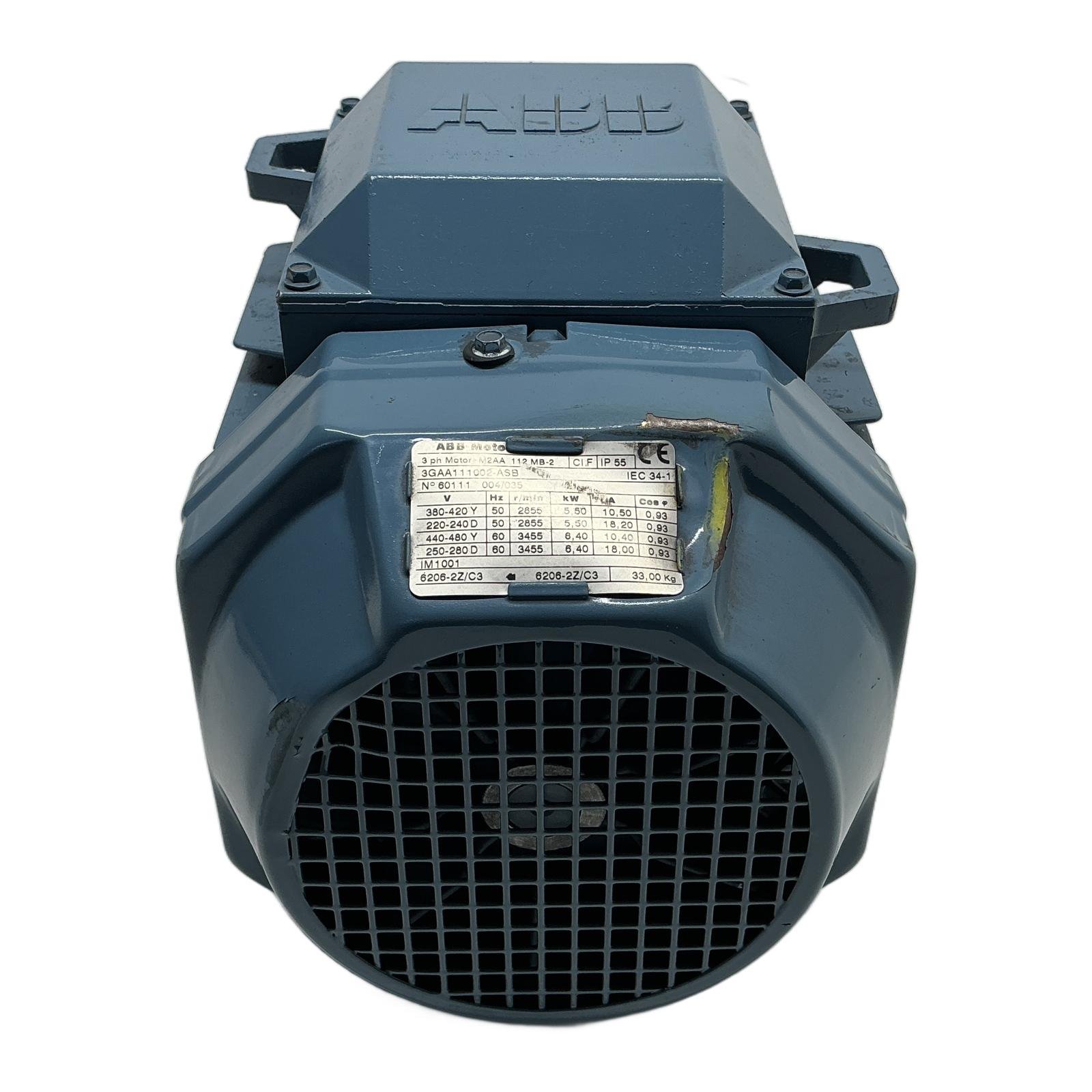 ABB 5.5 kW 2-Pole 3-Phase Motor Description This is a robust and efficient three-phase asynchronous motor from ABB, model M2AA 112 MB-2. With a power rating of 5.5 kW and a speed of 2855 rpm at 50 Hz, it is designed for general-purpose industrial applications requiring reliable performance. The motor features a durable cast iron frame, IP55 protection against dust and water, and is foot-mounted (IMB3/IM1001) for easy installation. Specifications Manufacturer: ABB Model: M2AA 112 MB-2 Part Number: 3GAA111002-ASB Power: 5.50 kW (at 50 Hz) / 6.40 kW (at 60 Hz) Speed: 2855 rpm (at 50 Hz) / 3455 rpm (at 60 Hz) Voltage (50 Hz): 380-420V Y / 220-240V D Current (50 Hz): 10.50A (Y) / 18.20A (D) Frequency: 50/60 Hz Protection Class: IP 55 Insulation Class: F Mounting: IM1001 (IMB3 Foot Mount) Weight: 33.00 kg Label Info Bearings: 6206-2Z/C3 (Drive End and Non-Drive End) Serial Number: 60111 004/035 Application Suitable for a wide variety of applications including pumps, fans, compressors, conveyors, and general machinery drive systems in various industries. CO2 Impact Choosing this pre-owned motor saves an estimated 66 kg of CO2 compared to manufacturing a new one. This is equivalent to the emissions of a car driving approximately 330 kilometers. Availability This unit is in stock and ready for immediate dispatch. Order now from profideals for expert support and fast delivery. FAQ What is the mounting configuration of this M2AA 112 MB-2 motor?This motor has an IM1001 mounting code, which corresponds to the standard IMB3 foot-mounted configuration. Can this motor be operated with a variable frequency drive (VFD)?Yes, motors of this type are generally suitable for VFD operation. However, for continuous operation at low speeds, independent cooling might be required to prevent overheating. It is also important to ensure the VFD settings are compatible with the motor’s specifications. What are the bearing numbers for maintenance or replacement?The nameplate specifies the same bearing for both the drive end and non-drive end: 6206-2Z/C3. profideals is not an authorized distributor, reseller or representative of the products featured on this website. All product names, trademarks, brands and logos used on this site are the property of their respective owners. Last Update: Friday, March 13, 2026