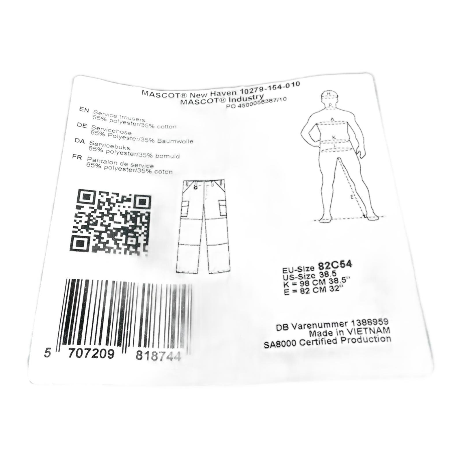 MASCOT New Haven Service Trousers Description The MASCOT New Haven 10279-154-010 is a pair of professional service trousers designed for durability and comfort in demanding work environments. As part of the MASCOT INDUSTRY range, these trousers feature a lightweight yet strong fabric blend, numerous functional pockets, and reflective details for increased safety. This item is new in its original packaging. Specifications Manufacturer: MASCOT Model: New Haven Type Number: 10279-154-010 Size: EU 82C54 (US 38.5) Waist: Approx. 98 cm (38.5 inch) Inseam: 82 cm (32 inch) Material: 65% Polyester / 35% Cotton Color: Dark Navy (010) Features: Lightweight, multiple pockets, reflective effects Label Info EAN: 5707209818744 DB Varenummer: 1388959 PO: 4500058387/10 Application Ideal for tradespeople, technicians, logistics staff, and other professionals requiring durable and practical workwear. Suitable for both indoor and outdoor work. Country of Origin Made in Vietnam. SA8000 Certified Production. CO2 Impact Choosing a pre-owned or surplus item like this avoids the environmental impact of new production. However, as this is a textile product, a specific CO2 saving in kg is not calculated under our standard methodology for industrial parts. Availability This item is in stock and ready for immediate dispatch. Order now from profideals for expert support and fast delivery. FAQ What are the recommended washing instructions for these trousers to maintain durability?It is generally recommended to wash MASCOT workwear at temperatures up to 60 deg C. Avoid using fabric softener as it can degrade the fabric’s properties and reflective elements. Always check the care label inside the garment for specific instructions. Does the 82C54 sizing correspond to a specific waist and inseam measurement?Yes, for MASCOT, C54 typically corresponds to a waist circumference of about 96-100 cm and a standard inseam length of 82 cm. The label confirms this with K=98 cm and E=82 cm, which represents waist and inseam respectively. Are the reflective elements on the trousers certified for any specific safety class?The reflective stripes are for increased visibility but are not typically certified to a specific EN ISO 20471 high-visibility class on their own, as that requires a minimum area of both fluorescent and reflective material. They serve as an added safety feature in low-light conditions. Last Update: Friday, March 13, 2026 profideals is not an authorized distributor, reseller or representative of the products featured on this website. All product names, trademarks, brands and logos used on this site are the property of their respective owners.