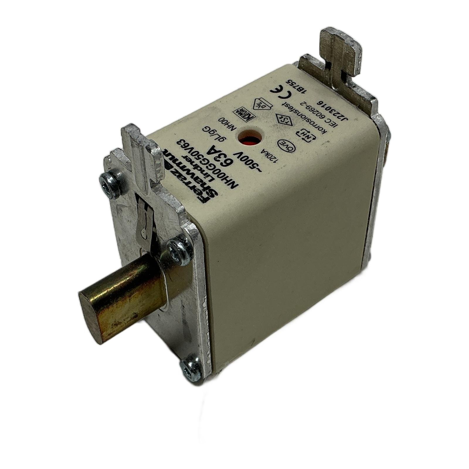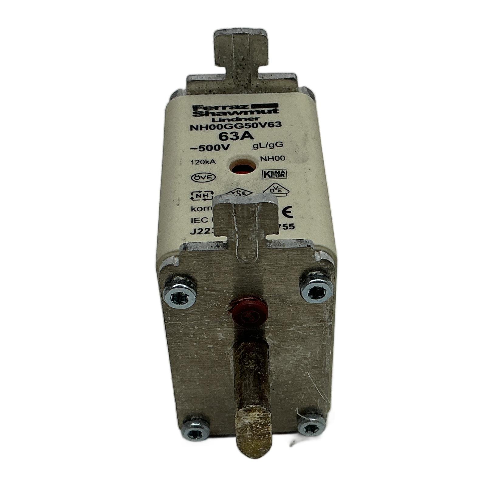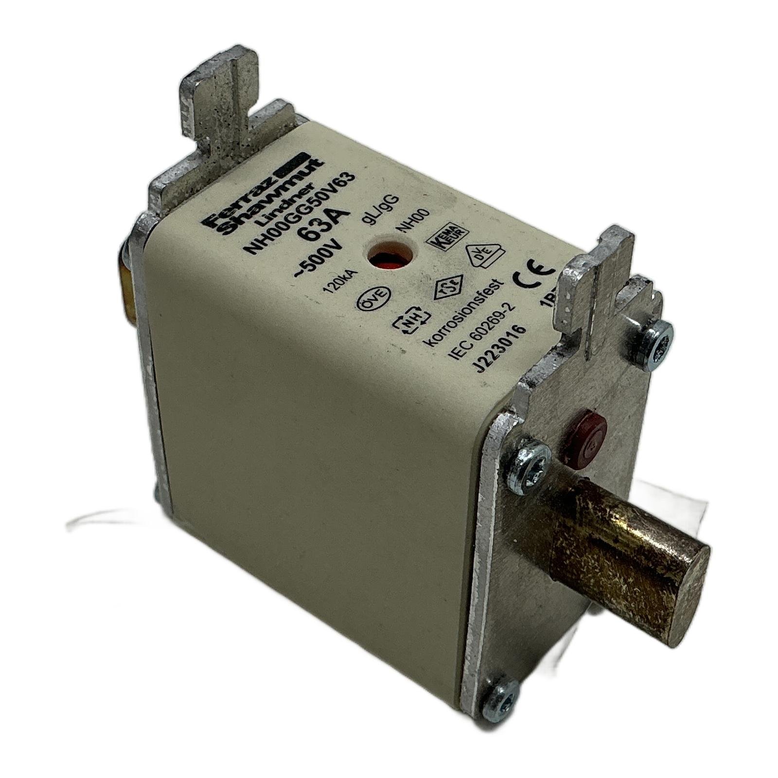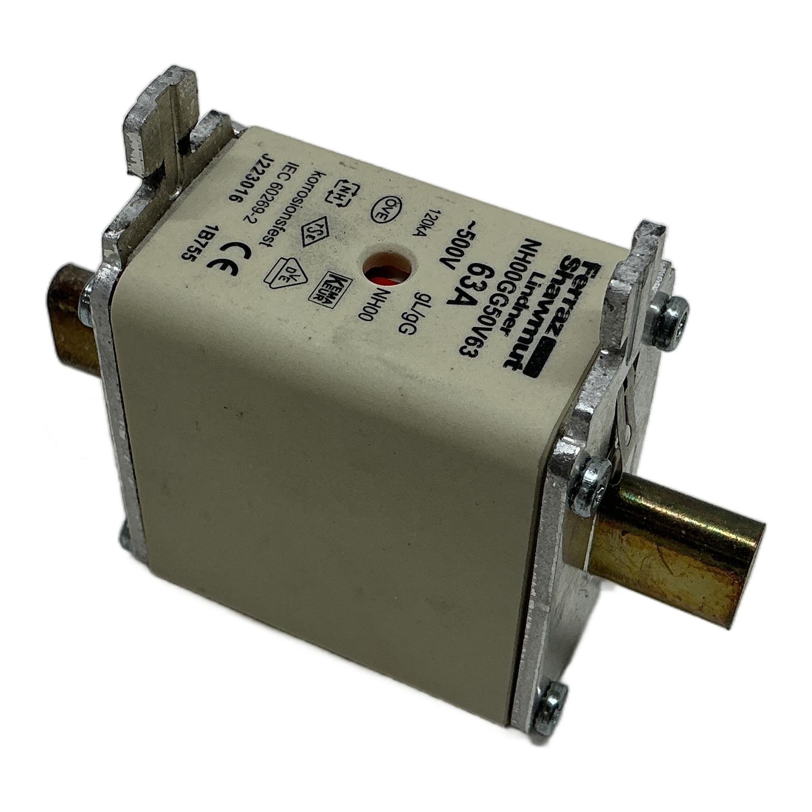 Mersen 63A NH00 Fuse Link Description The Mersen NH00GG50V63 is an industrial-grade, low-voltage high-rupturing-capacity (LV HRC) fuse link. It is designed to provide reliable overcurrent protection in electrical distribution systems, control panels, and other industrial applications. With a nominal current of 63A and a voltage rating of 500V AC, this fuse is suitable for a wide range of uses. The gG/gL characteristic ensures it is a general-purpose fuse, ideal for protecting cables and lines against both overload and short-circuit currents. This model includes a front indicator to easily identify a tripped fuse. Order now from profideals for expert support and fast delivery. Specifications Manufacturer: Mersen Part Number: NH00GG50V63 / J223016C Current Rating: 63A Voltage Rating: 500V AC Fuse Size: NH00 Characteristic: gG/gL (General purpose line protection) Breaking Capacity: 120kA Standards: IEC 60269-1, VDE 0636-2 Label Info Brand: Mersen (Ferraz Shawmut) Model: NH00GG50V63 EAN: 8430399001128 Approvals: VDE, KEMA Application This fuse is widely used in industrial power distribution boards, switchgear, fuse disconnectors, and motor control centers for general circuit protection. Country of Origin Made in Hungary. CO2 Impact By choosing this new-old-stock component, you help avoid the production of a new one, saving an estimated 4.5 kg of CO2. That’s equivalent to the emissions from driving a car for over 22 kilometers. Availability In stock. Ready for immediate dispatch. FAQ What does the ‘gG/gL’ characteristic mean for this fuse?The ‘gG’ (formerly ‘gL’) designation indicates a general-purpose fuse characteristic according to IEC standards. It is designed to protect against both overload (slow-blow) and short-circuit (fast-acting) currents, making it suitable for protecting cables, lines, and general equipment. Is this fuse suitable for protecting semiconductor devices?No, the gG/gL characteristic is not fast enough for protecting sensitive semiconductor devices like thyristors, IGBTs, or diodes. For those applications, you should use a high-speed fuse with an ‘aR’ or ‘gR’ characteristic. Can I use a standard fuse puller with this NH00 size fuse?Yes, this NH00 size fuse is designed with insulated gripping lugs. It can be safely installed and removed using a standard NH fuse handle or puller designed for live-line work, ensuring operator safety. profideals is not an authorized distributor, reseller, or representative of the products featured on this website. All product names, trademarks, brands, and logos used on this site are the property of their respective owners. Last Update: Friday, March 13, 2026