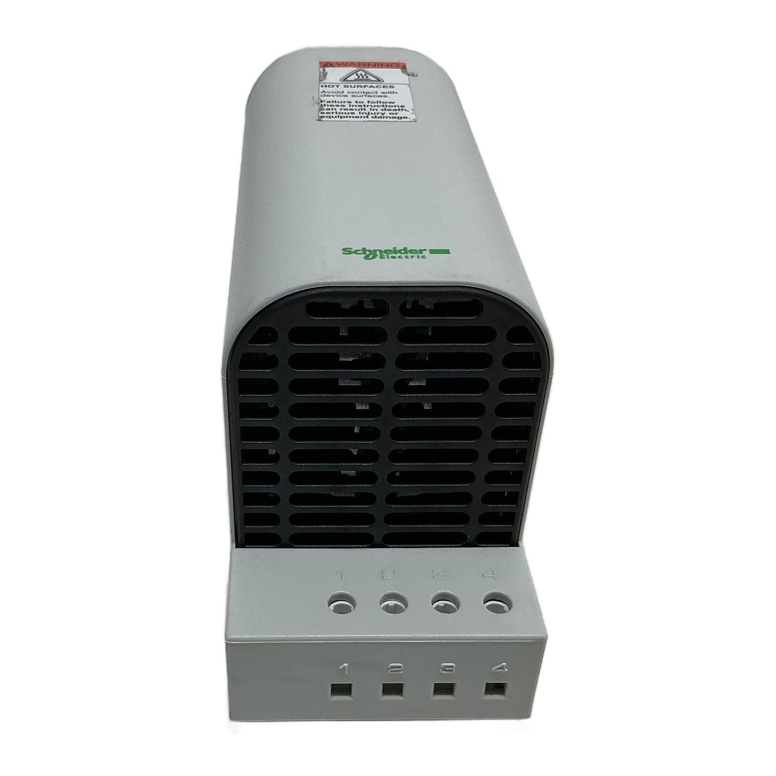 Product Details Description The Schneider Electric NSYCR150WU2C is a high-quality resistance heater from the ClimaSys CR range, designed for thermal regulation in industrial enclosures. It provides a stable heating output of 150W across a voltage range of 120V to 240V AC. This unit is essential for preventing condensation, protecting electronic components from low temperatures, and ensuring operational reliability in various environments. Specifications Brand: Schneider Electric Model: NSYCR150WU2C Product Type: Enclosure Resistance Heater Power Rating: 150 W Operating Voltage: 120-240 V AC Series: ClimaSys CR Mounting: Clip-on for 35mm DIN rail Label Info Manufacturer: Schneider Electric Part Number: NSYCR150WU2C Input: AC120-240V 150W Made in: Germany Application Ideal for use in control panels, automation enclosures, and electrical cabinets to maintain a minimum temperature, prevent condensation, and protect sensitive equipment from humidity and frost. Country of Origin This product is made in Germany. CO2 Impact Choosing this reused Schneider Electric heater saves approximately 24 kg of CO2 compared to manufacturing a new one. This saving is equivalent to the emissions of a car driving 120 kilometers. Availability This item is in stock and ready for immediate dispatch. Order now from profideals for expert support and fast delivery. FAQ What is the recommended orientation for installing the NSYCR150WU2C heater?For optimal heat convection and safety, this heater should be installed vertically at the bottom of the enclosure. This allows air to flow upwards through the heating element, distributing warmth throughout the cabinet effectively. Does this heater require a separate thermostat or hygrostat for operation?Yes, for efficient and controlled operation, it is highly recommended to use the NSYCR150WU2C with an external thermostat to regulate temperature or a hygrostat to control humidity levels. The heater itself does not have an integrated controller. Can this heater be used in environments with high levels of dust or moisture?This heater has a standard IP20 protection rating, meaning it is protected against solid objects larger than 12.5mm but not against water. It must be installed within a suitable enclosure (e.g., IP54 or higher) that provides the necessary protection against the specific environmental conditions. profideals is not an authorized distributor, reseller or representative of the products featured on this website. All product names, trademarks, brands and logos used on this site are the property of their respective owners. Last Update: Friday, March 13, 2026