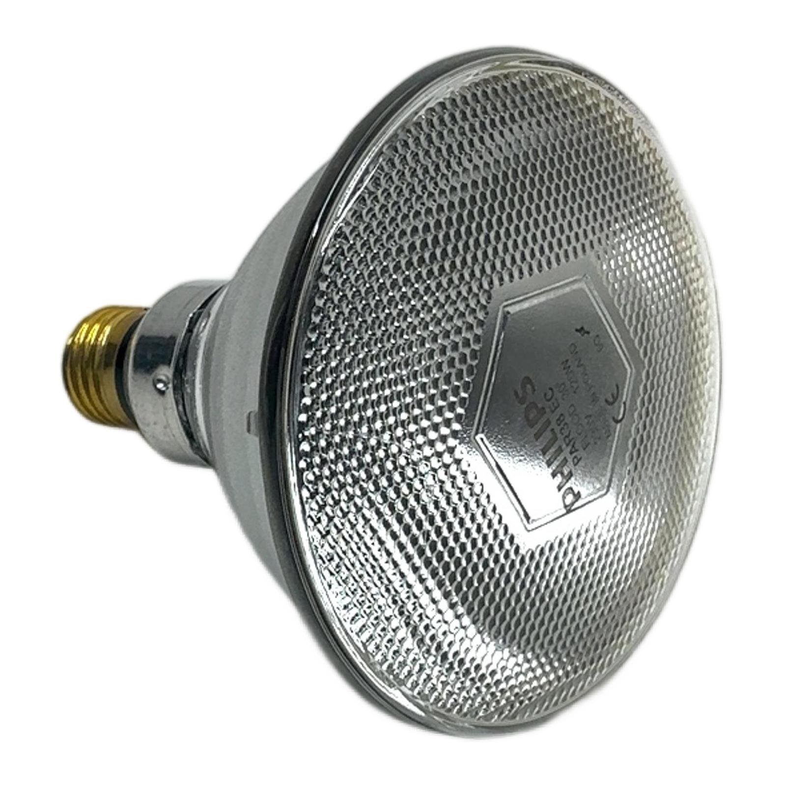 Philips PAR38 Incandescent Reflector Floodlight Description This is a Philips PAR38 incandescent reflector lamp, designed for floodlighting applications. It operates at 120W and 230V, producing a warm white light of 1040 lumens. Featuring a standard E27 screw base and a 30-degree beam angle, this lamp is ideal for both general illumination and accent lighting. Its robust, weatherproof construction makes it suitable for indoor and outdoor use. Specifications Manufacturer: Philips Model: PAR38 Flood Power Rating: 120W Voltage: 230V Luminous Flux: 1040 lumens Base Type: E27 (ES) Beam Angle: 30 degrees (Flood) Color Temperature: 2700K (Warm White) Average Lifespan: 2000 hours Dimensions: 123mm (diameter) x 137mm (length) Features: Weatherproof and waterproof Label Info Philips PAR38 EC FLOOD 30 120W 230-240V EAN: 8711500350416 Application Suitable for a variety of applications including retail display lighting, outdoor security lighting, garden illumination, and general-purpose floodlighting in commercial and residential settings. Country of Origin Made in Poland. CO2 Impact Choosing this reused lamp over a new one avoids the emission of approximately 3 kg of CO2, which is comparable to the savings from not driving a car for 15 kilometers. Availability This item is an obsolete, new-old-stock product. Availability is limited. Order now from profideals for expert support and fast delivery. FAQ Is this PAR38 lamp dimmable?Yes, as a standard incandescent lamp, it is fully dimmable with conventional leading-edge or trailing-edge dimmers. What does “PAR38” stand for?PAR stands for Parabolic Aluminized Reflector. The number “38” refers to the diameter of the lamp in eighths of an inch, meaning this lamp is 38/8 inches, or 4.75 inches (approximately 120mm) in diameter. Can this bulb be used outdoors?Yes, the packaging explicitly states “weather & waterproof”. This bulb is constructed with hard glass, making it suitable for outdoor fixtures where it may be exposed to moisture, as long as the fixture itself is appropriately rated for outdoor use. profideals is not an authorized distributor, reseller or representative of the products featured on this website. All product names, trademarks, brands and logos used on this site are the property of their respective owners. Last Update: Friday, March 13, 2026
