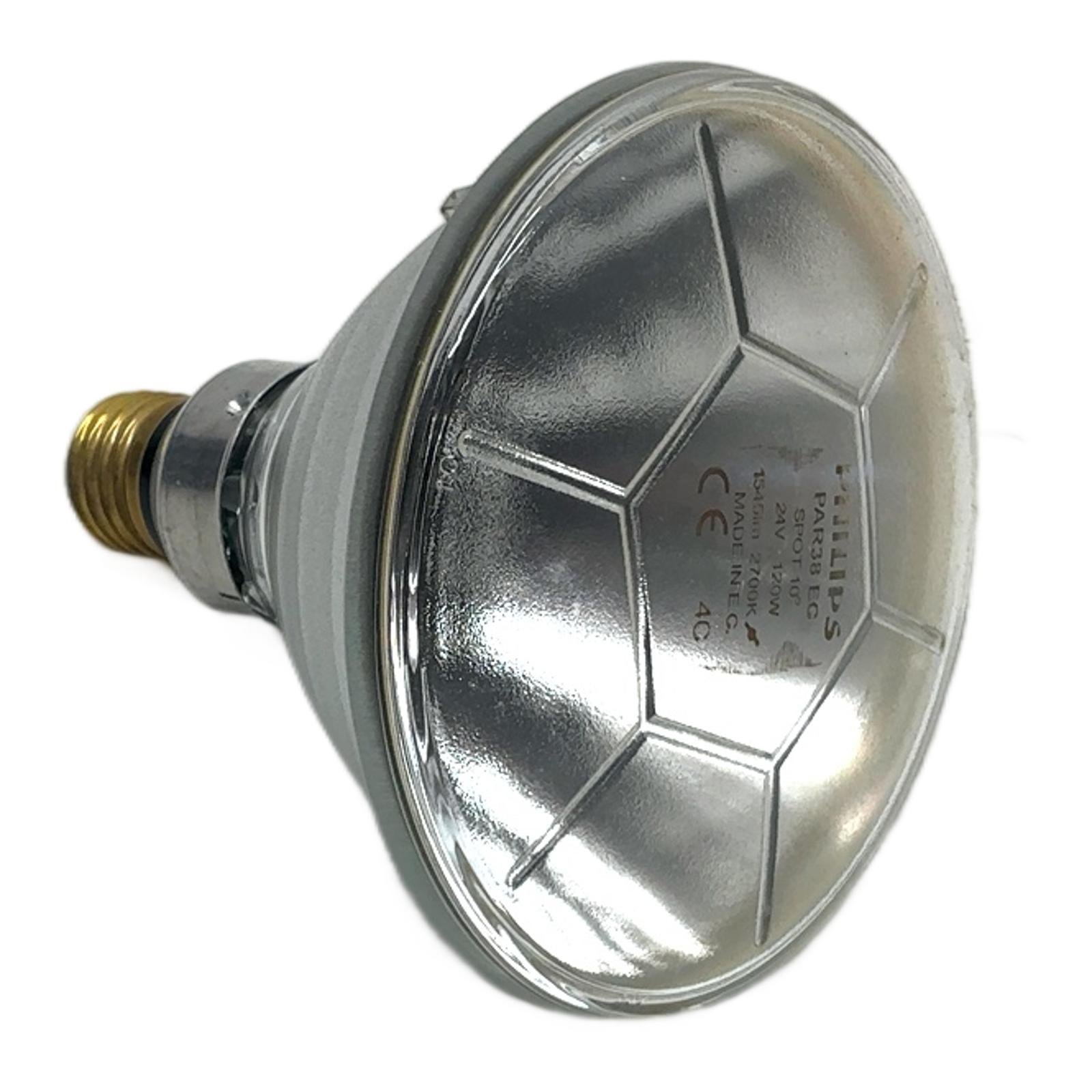 Philips PAR38 Incandescent Spot Lamp Description This is a Philips PAR38 incandescent reflector lamp, designed for low-voltage applications. With a power rating of 120W at 24V, it delivers a high-intensity spot beam perfect for focused lighting tasks. Its weather and waterproof design makes it exceptionally durable for demanding environments, both indoors and outdoors. Specifications Manufacturer: Philips Model: PAR38 Spot Power: 120W Voltage: 24V Luminous Flux: 1545 lumen Base Type: E27 / ES (Edison Screw) Beam Angle: 10 degrees (Spot) Color Temperature: 2700K (Warm White) Dimensions: 137mm x 123mm Label Info Part Number: 923810720502 EAN: 8711500418388 Application Ideal for use in industrial settings, accent lighting, landscape lighting, and any application requiring a robust, low-voltage, focused light source. Country of Origin Made in Poland. CO2 Impact Choosing this reused lamp saves approximately 11.2 kg of CO2 compared to manufacturing a new one, contributing to a more sustainable industrial practice. Availability This item is a discontinued, New Old Stock (NOS) product. Availability is limited. Order now from profideals for expert support and fast delivery. FAQ Is this lamp dimmable?Yes, as a standard incandescent lamp, it is fully dimmable using a suitable low-voltage (24V) dimmer compatible with resistive loads. Can this 24V lamp be used in a standard 230V socket?Absolutely not. This lamp is designed exclusively for 24V systems. Connecting it to a standard mains voltage (like 120V or 230V) will instantly destroy the lamp and could pose a safety hazard. It must be used with an appropriate 24V transformer. What does ‘PAR38′ mean?’PAR’ stands for Parabolic Aluminized Reflector. The number ’38’ refers to the diameter of the lamp in eighths of an inch. Therefore, a PAR38 lamp has a diameter of 38/8 inches, which is 4.75 inches or approximately 120mm. profideals is not an authorized distributor, reseller or representative of the products featured on this website. All product names, trademarks, brands and logos used on this site are the property of their respective owners. Last Update: Friday, March 13, 2026